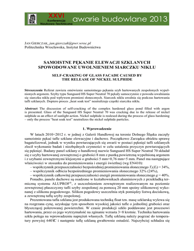 XXVI Konferencja Naukowo-Techniczna awarie budowlane 2013 JAN GIERCZAK, [email protected] Politechnika Wrocławska, Instytut Budownictwa SAMOISTNE PĘKANIE ELEWACJI SZKLANYCH SPOWODOWANE UWOLNIENIEM SIARCZKU NIKLU SELF-CRAKING OF GLASS FACADE CAUSED BY THE RELEASE OF NICKEL SULPHIDE Streszczenie Referat zawiera omówienie samoistnego pękania szyb hartowanych zespolonych wypełnionych argonem. Szyby typu Sunguard HS Super Neutral 70 pękały samoczynnie z powodu uwalniania się siarczku niklu pod wpływem promieni słonecznych. Siarczek niklu uwalnia się podczas hartowania tafli szklanych. Dopiero proces „heat soak test” neutralizuje cząstki siarczku niklu. Abstract The discussion of self-cracking of the complex hardened glass pond filled with argon is presented. Glass of the Sunguard HS Super Neutral 70 was cracking due to the release of nickel sulphide as an effect of sunlight action. Nickel sulphide is realesed during the process of glass hardening – only the process “heat soak test” neutralizes the nickel sulphide particles. 1. Wprowadzenie W latach 2010÷2012 r. w jednej z Galerii Handlowej na terenie Dolnego Śląska zaczęły samoistnie pękać tafle szklane elewacyjne i dachowe. Początkowo Zarządca obiektu sprawę bagatelizował, jednak w wyniku powtarzających się awarii w postaci pęknięć tafli szklanych zlecił wykonanie badań i niezbędnych czynności w celu ustalenia przyczyn powtarzających się pęknięć. Badany panel szklany o handlowej nazwie Sunguard HS Super Neutral 70 składał się z szyby hartowanej zewnętrznej o grubości 8 mm z pustką powietrzną wypełnioną argonem i z szybami zewnętrznymi klejonymi o grubości 5 mm+0,76 mm+5 mm. Panel ma następujące właściwości w stosunku do promieniowania i energii świetlnej (wg EN410): – współczynnik przepuszczalności bezpośredniej promieniowania słonecznego Te(Et) = 34%, – współczynnik odbicia bezpośredniego promieniowania słonecznego 32% (24%), – współczynnik całkowitej przepuszczalności energii promieniowania słonecznego g = 40%. Ponadto, panele dachowe są osadzone w kształtownikach aluminiowych z przekładką termiczną systemu ALUPROF, z uszczelnieniem zewnętrznym realizowanym na poziomie zewnętrznej płaszczyzny tafli szyby zespolonej za pomocą 20 mm spoiny silikonowej wykonanej z silikonu pogodowego. Silikon pogodowy uszczelnia styk pomiędzy listwą dociskową, a zewnętrzną taflą szyby zespolonej. Prezentowana tafla szklana jest produkowana techniką float tzn. masę szklarską wylewa się na rozgrzana cynę, uzyskując tym sposobem wysokiej jakości tafle o jednolitej grubości oraz błyszczącej polerowanej powierzchni. W czasie produkcji szkło poddawane jest procesowi hartowania, przez co jego wytrzymałość na zginanie wzrasta 3÷8 krotnie. Technika hartowania szkła polega na wprowadzeniu naprężeń własnych. Taflę szklaną należy pogrzać do temperatury powyżej 640°C i następnie taflę szklaną gwałtownie ostudzić. Najszybciej schładza się 796 Gierczak J.: Samoistne pękanie elewacji szklanych spowodowane uwolnieniem siarczku niklu warstwa zewnętrzna tafli. Później następuje spadek temperatury w części środkowej tafli. To powoduje kurczenie się masy szklanej wewnętrznej, podczas gdy masa zewnętrzna uległa już skurczeniu. Powstają wówczas naprężenia własne powodujące w strefie zewnętrznej ściskanie, natomiast w strefie środkowej powstają naprężenia rozciągające. Należy nadmienić tutaj, że szkło ma dobre właściwości na ściskanie, natomiast jego wytrzymałość na rozciąganie jest o rząd wielkości mniejsza. Wprowadzenie naprężeń własnych powoduje wzrost wytrzymałości tafli szklanej na zginanie poprzez redukcję naprężeń rozciągających od zginania. 2. Stan techniczny świetlików dachowych Podczas oględzin konstrukcji aluminiowo – szklanych stwierdzono, że stan techniczny świetlików tj. paneli szklanych o wymiarach 2,0×1,0 m jest bardzo dobry. Wykonanie uszczelnień okien było poprawne i zgodną z akrobatą techniczna wydaną przez ITB. Rys. 1. Pęknięta tafla szklana Wykonano obliczenia statyczno-wytrzymałościowe zgodnie z niemieckimi normami tj. [2, 3]. Należy tutaj nadmienić, że PN odnośnie obliczeń paneli szklanych wypełnionych argonem nie ma. Panel szklany sprawdzono nie tylko na obciążenia klimatyczne tj. obciążenie śniegiem i wiatrem, ale także na zmianę ciśnienia atmosferycznego w trakcie eksploatacji. Uzyskane wyniki potwierdziły, że panele szklane zostały poprawnie zaprojektowane i od obliczeniowych obciążeń klimatycznych stan graniczny nośności i użytkowania nie został przekroczony. Obliczenia statyczno-wytrzymałościowe wykonano przy następujących założeniach: – przy temperaturze zewnętrznej +45°C założono ciśnienie meteorologiczne na poziomie 100 kPa (odpowiada to obciążeniu 13,9 kN/m2 i naprężeniom σmax = 2,7 MPa), – przy temperaturze zewnętrznej +3°C założono ciśnienie meteorologiczne na poziomie 104 kPa (odpowiada to obciążeniu – 7,4 kN/m2 i naprężeniom σmax = 1,43 MPa), – moduł Young’a wynosi E = 70 GPa [1,4,5], – współczynnik Poison’a szkła wynosi µ = 0,23 [1,4,5], – współczynnik rozszerzalności termicznej szkła przyjęto αT = 0,0000121/K [1,4,5]. Materiałowe aspekty awarii, uszkodzeń i napraw 797 Naprężenia od obciążenia śniegiem i wiatrem wynosiły odpowiednio 16,6 MPa i 2,7 MPa, przy naprężeniach dopuszczalnych 39,1 MPa. Zatem otrzymane wyniki świadczyły o dużym zapasie nośności tak obciążonych płyt szklanych i nie mogły być przyczyną pęknięć szyb. 3. Analiza przyczyn pęknięć tafli szklanych Na podstawie przeprowadzonych obliczeń statycznych i wytrzymałościowych oraz analizy przyjętych i wykonanych rozwiązań konstrukcyjnych stwierdzono poprawność wykonania tego przykrycia szklanego. Ponadto wypełniona pustka panelu szklanego argonem i jej parametry początkowe g