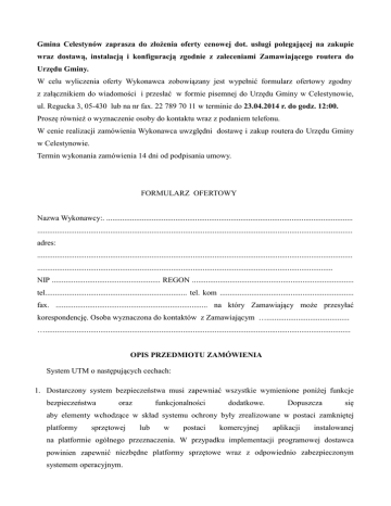 Gmina Celestynów zaprasza do złożenia oferty cenowej dot. usługi polegającej na zakupie wraz dostawą, instalacją i konfiguracją zgodnie z zaleceniami Zamawiającego routera do Urzędu Gminy. W celu wyliczenia oferty Wykonawca zobowiązany jest wypełnić formularz ofertowy zgodny z załącznikiem do wiadomości i przesłać w formie pisemnej do Urzędu Gminy w Celestynowie, ul. Regucka 3, 05-430 lub na nr fax. 22 789 70 11 w terminie do 23.04.2014 r. do godz. 12:00. Proszę również o wyznaczenie osoby do kontaktu wraz z podaniem telefonu. W cenie realizacji zamówienia Wykonawca uwzględni dostawę i zakup routera do Urzędu Gminy w Celestynowie. Termin wykonania zamówienia 14 dni od podpisania umowy. FORMULARZ OFERTOWY Nazwa Wykonawcy:. ............................................................................................................................. ................................................................................................................................................................ adres: ................................................................................................................................................................ ...................................................................................................................................................... NIP ....................................................... REGON .................................................................................. tel........................................................................ tel. kom .................................................................... fax. ............................................................................. na który Zamawiający może przesyłać korespondencję. Osoba wyznaczona do kontaktów z Zamawiającym ….......................................... …........................................................................................................................................................... OPIS PRZEDMIOTU ZAMÓWIENIA System UTM o następujących cechach: 1. Dostarczony system bezpieczeństwa musi zapewniać wszystkie wymienione poniżej funkcje bezpieczeństwa oraz funkcjonalności dodatkowe. Dopuszcza się aby elementy wchodzące w skład systemu ochrony były zrealizowane w postaci zamkniętej platformy sprzętowej lub w postaci komercyjnej aplikacji instalowanej na platformie ogólnego przeznaczenia. W przypadku implementacji programowej dostawca powinien zapewnić niezbędne platformy sprzętowe wraz z odpowiednio zabezpieczonym systemem operacyjnym. 2. Dla elementów systemu bezpieczeństwa wykonawca zapewni wszystkie poniższe funkcjonalności: a. System powinien być zaprojektowany w taki sposób aby możliwa była jego rozbudowa w celu wyeliminowania pojedynczego punktu awarii. W tym celu powinien zapewnić co najmniej możliwość łączenia w klaster Active-Active lub Active-Passive każdego z elementów systemu. b. Monitoring i wykrywanie uszkodzenia elementów sprzętowych i programowych systemów zabezpieczeń oraz łączy sieciowych. c. Monitoring stanu realizowanych połączeń VPN oraz automatyczne przekierowanie pakietów zgodnie z trasą definiowaną przez protokół OSPF. d. System realizujący funkcję Firewall powinien dawać możliwość pracy w jednym z dwóch trybów: Routera z funkcją NAT lub transparent. e. System realizujący funkcję Firewall powinien dysponować co najmniej następującymi interfejsami: • 2 porty Ethernet 10/100/1000 Base-TX • 6 portów 10/100 Base-TX • gniazdem ExpressCard w celu umożliwienia rozbudowy o opcjonalny moduł GSM f. 2.4 Możliwość tworzenia min 64 interfejsów wirtualnych definiowanych jako VLANy w oparciu o standard 802.1Q. g. W zakresie Firewall’a obsługa nie mniej niż 65 tys jednoczesnych połączeń oraz 4 tys. nowych połączeń na sekundę h. Przepustowość Firewall’a: nie mniej niż 300 Mbps i. Wydajność szyfrowania 3DES: nie mniej niż 75 Mbps 3. W ramach dostarczonego systemu ochrony muszą z poniższych funkcjonalności: a. kontrola dostępu - zapora ogniowa klasy Stateful Inspection być realizowane wszystkie b. ochrona przed wirusami – antywirus [AV] (dla protokołów SMTP, POP3, IMAP, HTTP, FTP, HTTPS) umożliwiający skanowanie wszystkich rodzajów plików, w tym zip, rar c. poufność danych - IPSec VPN oraz SSL VPN d. ochrona przed atakami - Intrusion Prevention System [IPS/IDS] e. kontrola stron internetowych pod kątem rozpoznawania witryn potencjalnie niebezpiecznych: zawierających złośliwe oprogramowanie, stron szpiegujących oraz udostępniających treści typu SPAM. f. kontrola zawartości poczty – antyspam [AS] (dla protokołów SMTP, POP3, IMAP) g. kontrola pasma oraz ruchu [QoS, Traffic shaping] h. Kontrola aplikacji oraz rozpoznawanie ruchu P2P i. Możliwość analizy ruchu szyfrowanego SSL’em j. Ochrona przed wyciekiem poufnej informacji (DLP) 4. Wydajność całego systemu bezpieczeństwa przy skanowaniu strumienia danych z włączonymi funkcjami: Stateful Firewall, Antivirus, WebFilter, min. 45 Mbps 5. Wydajność skanowania ruchu w celu ochrony przed atakami (IPS) min 110 Mbps 6. W zakresie realizowanych funkcjonalności VPN, wymagane jest nie mniej niż: a. Tworzenie połączeń w topologii Site-to-site oraz Client-to-site b. Dostawca musi dostraczyć nielimitowanego klienta VPN z propomownym rozwiązaniem. c. Monitorowanie stanu tuneli VPN i stałego utrzymywania ich aktywności d. Praca w topologii Hub and Spoke oraz Mesh e. Możliwość wyboru tunelu przez protokół dynamicznego routiongu, np. OSPF f. Obsługa mechanizmów: IPSec NAT Traversal, DPD, XAuth współpracującego 7. Rozwiązanie powinno zapewniać: obsługę Policy Routingu, routing statyczny i dynamiczny w oparciu o protokoły: RIPv2, OSPF, BGP oraz PIM. Protokoły routingu powinny funkcjonować w ramach terminowanych na urządzeniu połączeniach IPSec VPN. 8. Możliw