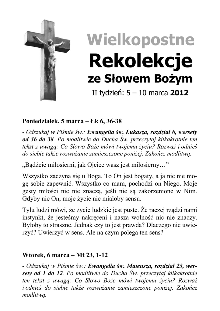 Wielkopostne Rekolekcje ze Słowem Bożym II tydzień: 5 – 10 marca 2012 Poniedziałek, 5 marca – Łk 6, 36-38 - Odszukaj w Piśmie św.: Ewangelia św. Łukasza, rozdział 6, wersety od 36 do 38. Po modlitwie do Ducha Św. przeczytaj kilkakrotnie ten tekst z uwagą: Co Słowo Boże mówi twojemu życiu? Rozważ i odnieś do siebie także rozważanie zamieszczone poniżej. Zakończ modlitwą. „Bądźcie miłosierni, jak Ojciec wasz jest miłosierny…” Wszystko zaczyna się u Boga. To On jest bogaty, a ja nic nie mogę sobie zapewnić. Wszystko co mam, pochodzi on Niego. Moje gesty miłości nic nie znaczą, jeśli nie są zakorzenione w Nim. Gdyby nie On, moje życie nie miałoby sensu. Tylu ludzi mówi, że życie ludzkie jest puste. Że raczej rządzi nami instynkt, że jesteśmy nakręceni i nasza wolność nic nie znaczy. Byłoby to straszne. Jednak czy to jest prawda? Dlaczego nie uwierzyć? Uwierzyć w sens. Ale na czym polega ten sens? Wtorek, 6 marca – Mt 23, 1-12 - Odszukaj w Piśmie św.: Ewangelia św. Mateusza, rozdział 23, wersety od 1 do 12. Po modlitwie do Ducha Św. przeczytaj kilkakrotnie ten tekst z uwagą: Co Słowo Boże mówi twojemu życiu? Rozważ i odnieś do siebie także rozważanie zamieszczone poniżej. Zakończ modlitwą. WIELKOPOSTNE REKOLEKCJE ZE SŁOWEM BOŻYM 2012 „Tylko jeden jest wasz Mistrz, Chrystus. Największy z was niech będzie waszym sługą…” Bycie sługą już dawno przeminęło. Tak było kiedyś: byli niewolnicy, byli służący. Dzisiaj są tylko Panowie i Panie. To jest ideał społeczny XXI wieku. Nasze skojarzenia są jednoznaczne. Czy w takim razie Ewangelia należy już do przeszłości? Kościół jednak wciąż słucha tych samych słów Chrystusa. Co to znaczy być sługą? Stawiam to pytanie Panu Bogu, bo nie bardzo rozumiem o co chodzi. Nikt z nas nie jest panem. Jest tylko jeden Pan – Jezus Chrystus. A chrześcijanie są tylko sługami. To nie powód do lęków, ale do dumy. Tylko, żeby jeszcze to zrozumieć… Środa, 7 marca – Mt 20, 17-28 - Odszukaj w Piśmie św.: Ewangelia św. Mateusza, rozdział 20, wersety od 17 do 28. Po modlitwie do Ducha Św. przeczytaj kilkakrotnie ten tekst z uwagą: Co Słowo Boże mówi twojemu życiu? Rozważ i odnieś do siebie także rozważanie zamieszczone poniżej. Zakończ modlitwą. „Syn Człowieczy zostanie wydany arcykapłanom i uczonym w Piśmie. Oni skażą Go na śmierć… a trzeciego dnia zmartwychwstanie…” Sam Chrystus uczy co to znaczy być sługą. Będzie umęczony i ukrzyżowany. Dlaczego? Nie dlatego, że kocha cierpienie, ale dlatego, że kocha człowieka i jest wierny do końca. Być sługą znaczy być odpowiedzialnym. Kiedy kocham drugiego, biorę za niego odpowiedzialność. Tak czyni Chrystus. Jest konsekwentny w miłości. Ale czy to możliwe, by naśladować Chrystusa? Czy to nie za trudne dla mnie? Przecież ja nie jestem Bogiem. Dlaczego Bóg żąda ode mnie boskiej miłości? W świecie taka miłość nie jest doceniana. Ale Chrystus oddał swoje życie za mnie. Oddał życie, Parafia św. Jadwigi Śląskiej w Chorzowie www.jadwiga.info bym mógł się wyzwolić z egoizmu i doświadczyć miłości niewiarygodnej, jakiej świat dać nie może. Czwartek, 8 marca – Łk 16, 19-31 - Odszukaj w Piśmie św.: Ewangelia św. Łukasza, rozdział 16, wersety od 19 do 31. Po modlitwie do Ducha Św. przeczytaj kilkakrotnie ten tekst z uwagą: Co Słowo Boże mówi twojemu życiu? Rozważ i odnieś do siebie także rozważanie zamieszczone poniżej. Zakończ modlitwą. „Proszę cię, ojcze, poślij go do domu mojego ojca, niech ich przestrzeże…” Relacje w świecie są jednak inaczej poukładane. Są panowie, którzy maja wszystko i są biedacy, którzy nic nie mają. Są panowie, którzy stawiają siebie w miejsce Boga i są tacy, którzy nie z własnego wyboru stali się niewolnikami. Czy ten porządek społeczny kiedykolwiek się zmieni? Pan Bóg ma swoje drogi i swoje sposoby, by w człowieku nigdy nie zgasła nadzieja. Przychodzą takie momenty, które wyraźnie pokazują jak kruche jest to wszystko co stworzył człowiek. To ma swój koniec. Upada to co jest fałszywe. Ale w człowieku jest tęsknota za innym kształtem życia, za innym porządkiem. Piątek, 9 marca – Mt 21, 33-43. 45-46 - Odszukaj w Piśmie św.: Ewangelia św. Mateusza, rozdział 21, wersety od 33 do 43 oraz wersety 45 i 46. Po modlitwie do Ducha Św. przeczytaj kilkakrotnie ten tekst z uwagą: Co Słowo Boże mówi twojemu życiu? Rozważ i odnieś do siebie także rozważanie zamieszczone poniżej. Zakończ modlitwą. „Kamień, który odrzucili budujący, ten stał się kamieniem węgielnym. Pan to sprawił i jest cudem w naszych oczach…” WIELKOPOSTNE REKOLEKCJE ZE SŁOWEM BOŻYM 2012 Próby zmiany obecnego porządku często kończą się porażką. To prowadzi do zwątpienia i do rozczarowania: człowiek jednak nie jest kimś wyjątkowym, jest zawsze taki sam; wszelki wysiłek zmiany nie ma większego sensu. Czy ideał sługi jest w takim razie możliwy? A może ta porażka jest tylko pozorna. Chrystus też po ludzku przegrał, ale przecież po trzech dniach zmartwychwstał. Po porażce przychodzi zwycięstwo. A zatem moje zwycięstwo jest możliwe tylko wtedy gdy złączę się z Chrystusem. To będzie największy cud, czyli zwycięstwo Pana Boga w moim życiu. Sobota, 10 marca – Łk 15, 1-3. 11-32 - Odszukaj w Piśmie św.: Ewangelia św. Łukasza, rozdział 15, wersety od 1 do 3 oraz wersety od 11 do 32. Po modlitwie do Ducha Św. przeczytaj kilkakrotnie ten tekst z uwagą: Co Słowo Boże mówi twojemu życiu? Rozważ i odnieś do siebie także rozważanie zamieszczone poniżej. Zakończ modlitwą. „A gdy był jeszcze daleko, ujrzał go jego ojciec i wzruszył się głęboko; wybiegł naprzeciw niego, rzucił mu się na szyję i ucałował go…” Moja droga zrozumienia i przylgnięcia o Chrystusa jest bardzo długa. Potrzebuję czasu, by oczyścić 
