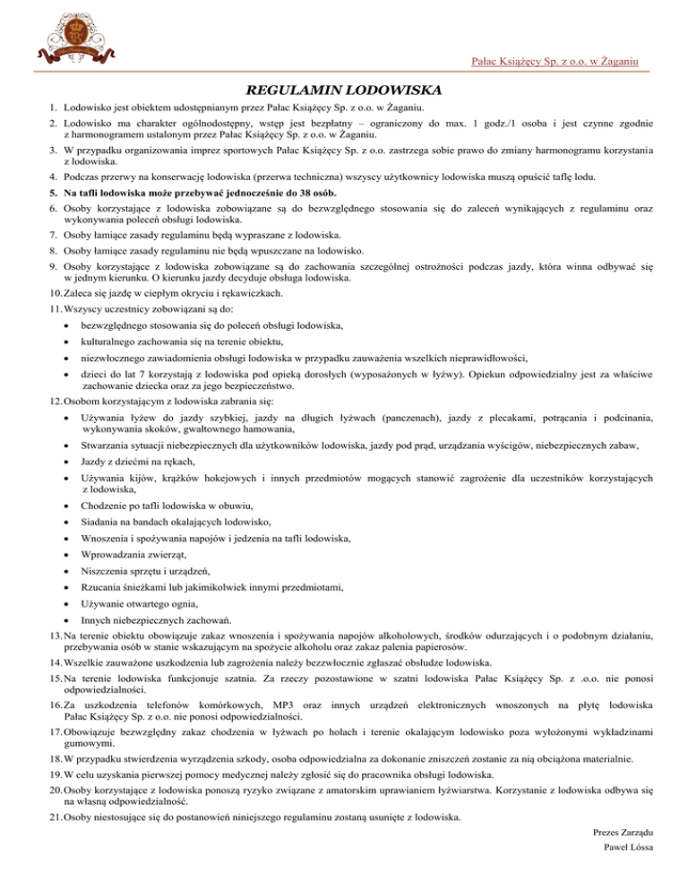Pałac Książęcy Sp. z o.o. w Żaganiu REGULAMIN LODOWISKA 1. Lodowisko jest obiektem udostępnianym przez Pałac Książęcy Sp. z o.o. w Żaganiu. 2. Lodowisko ma charakter ogólnodostępny, wstęp jest bezpłatny – ograniczony do max. 1 godz./1 osoba i jest czynne zgodnie z harmonogramem ustalonym przez Pałac Książęcy Sp. z o.o. w Żaganiu. 3. W przypadku organizowania imprez sportowych Pałac Książęcy Sp. z o.o. zastrzega sobie prawo do zmiany harmonogramu korzystania z lodowiska. 4. Podczas przerwy na konserwację lodowiska (przerwa techniczna) wszyscy użytkownicy lodowiska muszą opuścić taflę lodu. 5. Na tafli lodowiska może przebywać jednocześnie do 38 osób. 6. Osoby korzystające z lodowiska zobowiązane są do bezwzględnego stosowania się do zaleceń wynikających z regulaminu oraz wykonywania poleceń obsługi lodowiska. 7. Osoby łamiące zasady regulaminu będą wypraszane z lodowiska. 8. Osoby łamiące zasady regulaminu nie będą wpuszczane na lodowisko. 9. Osoby korzystające z lodowiska zobowiązane są do zachowania szczególnej ostrożności podczas jazdy, która winna odbywać się w jednym kierunku. O kierunku jazdy decyduje obsługa lodowiska. 10. Zaleca się jazdę w ciepłym okryciu i rękawiczkach. 11. Wszyscy uczestnicy zobowiązani są do: bezwzględnego stosowania się do poleceń obsługi lodowiska, kulturalnego zachowania się na terenie obiektu, niezwłocznego zawiadomienia obsługi lodowiska w przypadku zauważenia wszelkich nieprawidłowości, dzieci do lat 7 korzystają z lodowiska pod opieką dorosłych (wyposażonych w łyżwy). Opiekun odpowiedzialny jest za właściwe zachowanie dziecka oraz za jego bezpieczeństwo. 12. Osobom korzystającym z lodowiska zabrania się: Używania łyżew do jazdy szybkiej, jazdy na długich łyżwach (panczenach), jazdy z plecakami, potrącania i podcinania, wykonywania skoków, gwałtownego hamowania, Stwarzania sytuacji niebezpiecznych dla użytkowników lodowiska, jazdy pod prąd, urządzania wyścigów, niebezpiecznych zabaw, Jazdy z dziećmi na rękach, Używania kijów, krążków hokejowych i innych przedmiotów mogących stanowić zagrożenie dla uczestników korzystających z lodowiska, Chodzenie po tafli lodowiska w obuwiu, Siadania na bandach okalających lodowisko, Wnoszenia i spożywania napojów i jedzenia na tafli lodowiska, Wprowadzania zwierząt, Niszczenia sprzętu i urządzeń, Rzucania śnieżkami lub jakimikolwiek innymi przedmiotami, Używanie otwartego ognia, Innych niebezpiecznych zachowań. 13. Na terenie obiektu obowiązuje zakaz wnoszenia i spożywania napojów alkoholowych, środków odurzających i o podobnym działaniu, przebywania osób w stanie wskazującym na spożycie alkoholu oraz zakaz palenia papierosów. 14. Wszelkie zauważone uszkodzenia lub zagrożenia należy bezzwłocznie zgłaszać obsłudze lodowiska. 15. Na terenie lodowiska funkcjonuje szatnia. Za rzeczy pozostawione w szatni lodowiska Pałac Książęcy Sp. z .o.o. nie ponosi odpowiedzialności. 16. Za uszkodzenia telefonów komórkowych, MP3 oraz innych urządzeń elektronicznych wnoszonych na płytę lodowiska Pałac Książęcy Sp. z o.o. nie ponosi odpowiedzialności. 17. Obowiązuje bezwzględny zakaz chodzenia w łyżwach po holach i terenie okalającym lodowisko poza wyłożonymi wykładzinami gumowymi. 18. W przypadku stwierdzenia wyrządzenia szkody, osoba odpowiedzialna za dokonanie zniszczeń zostanie za nią obciążona materialnie. 19. W celu uzyskania pierwszej pomocy medycznej należy zgłosić się do pracownika obsługi lodowiska. 20. Osoby korzystające z lodowiska ponoszą ryzyko związane z amatorskim uprawianiem łyżwiarstwa. Korzystanie z lodowiska odbywa się na własną odpowiedzialność. 21. Osoby niestosujące się do postanowień niniejszego regulaminu zostaną usunięte z lodowiska. Prezes Zarządu Paweł Lóssa