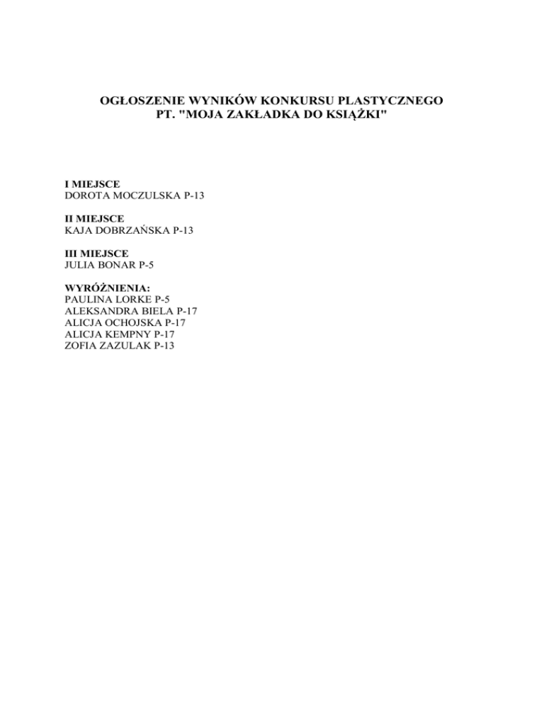 OGŁOSZENIE WYNIKÓW KONKURSU PLASTYCZNEGO PT. "MOJA ZAKŁADKA DO KSIĄŻKI" I MIEJSCE DOROTA MOCZULSKA P-13 II MIEJSCE KAJA DOBRZAŃSKA P-13 III MIEJSCE JULIA BONAR P-5 WYRÓŻNIENIA: PAULINA LORKE P-5 ALEKSANDRA BIELA P-17 ALICJA OCHOJSKA P-17 ALICJA KEMPNY P-17 ZOFIA ZAZULAK P-13