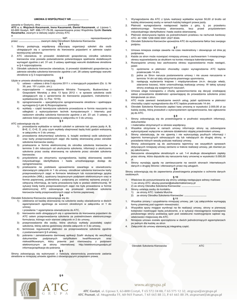UMOWA O WSPÓŁPRACY NR ……………….. zawarta w Gostyniu, dnia …………………………. pomiędzy: ATC s. c. Wojciech Kaczmarek, Irena Kaczmarek, Daniel Kaczmarek, ul. Lipowa 1, 63-800 Gostyń, NIP: 696-177-79-39, reprezentowana przez Wspólnika Spółki Daniela Kaczmarka, zwanym w dalszej części umowy ATC a ....................................................................., NIP: …………………… reprezentowanym przez: ……………………. zwanym dalej Ośrodkiem Szkolenia Kierowców. §1 1. Strony podejmują współpracę dotyczącą organizacji szkoleń dla osób ubiegających się o uprawnienia do kierowania pojazdami w zakresie części teoretycznej szkolenia. 2. ATC oświadcza, iż prowadzi działalność gospodarczą ośrodka szkolenia kierowców oraz posiada poświadczenie potwierdzające spełnianie dodatkowych wymagań zgodnie z art. 31 ust. 3 ustawy spełniając warunki dodatkowe określone w § 4 rozporządzenia. 3. Ośrodek szkolenia kierowców oświadcza, iż prowadzi działalność gospodarczą w zakresie ośrodka szkolenia kierowców zgodnie z art. 28 ustawy spełniając warunki określone w § 3 rozporządzenia. §2 Użyte w umowie określenia oznaczają: 1) ustawa – ustawa z dnia 5 stycznia 2011 r. o kierujących pojazdami (Dz. U. Nr 30, poz. 151 z późn. zm.); 2) rozporządzenie – rozporządzenie Ministra Transportu, Budownictwa I Gospodarki Morskiej z dnia 13 lipca 2012 r. w sprawie szkolenia osób ubiegających się o uprawnienia do kierowania pojazdami, instruktorów i wykładowców (Dz. U. Poz. 1019); 3) oprogramowanie – specjalistyczne oprogramowanie określone i spełniające wymagania § 4 pkt 4) Rozporządzenia; 4) wykłady – część teoretyczna szkolenia prowadzona w formie nauczania na odległość z wykorzystaniem technik komputerowych i Internetu pod nadzorem ośrodka szkolenia kierowców zgodnie z art. 23 ust. 3 ustawy, w zakresie ilości godzin wskazanej w załączniku nr 3 do umowy. §3 ATC zobowiązuje się do: 1) prowadzenia wykładów w ramach szkoleń w zakresie kat. prawa jazdy A, B, B+E, C, C+E, D, przy czym wykłady obejmować będą ilość godzin wskazaną w załączniku nr 3 do umowy; 2) prowadzenia dokumentacji szkolenia, tj. książki ewidencji osób szkolonych oraz karty przeprowadzonych zajęć dla każdej skierowanej przez ośrodek szkolenia kierowców osoby; 3) przekazania w formie elektronicznej do ośrodka szkolenia kierowców w terminie 3 dni roboczych od ukończenia szkolenia, informacji o ukończeniu szkolenia przez osobę skierowaną na szkolenie przez ośrodek szkolenia kierowców; 4) przydzielenie po otrzymaniu wynagrodzenia, każdej skierowanej osobie indywidualnego identyfikatora i hasła umożliwiającego dostęp do oprogramowania; 5) przekazania na podstawie upoważnienia zawartego w oświadczeniu stanowiącym załącznik nr 1 do umowy, ośrodkowi szkolenia kierowców karty przeprowadzonych zajęć w formacie tekstowym lub rozszerzalnego języka znaczników (XML), opatrzony bezpiecznym podpisem elektronicznym oraz w formie papierowej, podkreśloną i podpisaną po ostatniej wpisanej pozycji z odręczną informacją, że karta prowadzona była w postaci elektronicznej. W sytuacji kiedy karta przeprowadzonych zajęć nie była prowadzona w formie elektronicznej ATC zobowiązuje się przekazać ośrodkowi szkolenia kierowców kartę przeprowadzonych zajęć w formie papierowej. §4 Ośrodek Szkolenia Kierowców zobowiązuje się do: 1) odebrania od każdej skierowanej na szkolenie osoby oświadczenia w dwóch egzemplarzach zgodnego ze wzorem określonym w załączniku nr 1 do umowy i przesłanie 1 egzemplarza oświadczenia do ATC, 2) kierowania osób ubiegających się o uprawnienia do kierowania pojazdami do ATC celem przeprowadzenia szkolenia za pośrednictwem elektronicznego formularza, którego wzór stanowi załącznik nr 2 do umowy, 3) przeprowadzenie dla osoby, która ukończy wykłady pozostałej części szkolenia, której zakres godzinowy określa załącznik nr 3 do umowy, 4) terminowe regulowanie płatności za przeprowadzone szkolenie zgodnie z postanowieniami § 6 umowy, 5) pobrania i zainstalowania darmowej aplikacji Szafir służącej do weryfikacji dokumentów podpisanych certyfikatem kwalifikowanym oraz niekwalifikowanym, który prawnie jest równoważny z podpisem elektronicznym ze strony internetowej: http://elektronicznypodpis.pl/ informacje/aplikacje-do-pobrania. §5 Strony zobowiązują się wykonywać z należytą starannością powierzone zadania określone w niniejszej umowie zgodnie z obowiązującymi przepisami prawa. §6 Wynagrodzenie dla ATC z tytułu realizacji wykładów wynosi 50,00 zł brutto od każdej skierowanej osoby w ramach każdej kategorii prawa jazdy. 2. Płatność wynagrodzenia następować będzie z góry, tj. po przesłaniu elektronicznego formularza skierowania, lecz przed przydzieleniem indywidualnego identyfikatora i hasła osobie skierowanej. 3. Płatność dokonywana będzie za pośrednictwem przelewu na rachunek bankowy ATC: 40 1090 1258 0000 0001 2027 8344. 4. Ośrodek Szkolenia Kierowców upoważnia ATC do wystawiania faktur bez swojego podpisu. §7 1. Umowa niniejsza zostaje zawarta na czas nieokreślony i obowiązuje od dnia jej podpisania. 2. Każda ze stron może rozwiązać niniejszą umowę z zachowaniem 1-miesięcznego okresu wypowiedzenia ze skutkiem na koniec miesiąca kalendarzowego. 3. Rozwiązanie umowy bez zachowania okresu wypowiedzenia może nastąpić, jeżeli: 1) opóźnienie w płatności chociażby części wynagrodzenia ATC będzie przekraczało 14 dni, 2) jedna ze Stron narusza postanowienia umowy i nie usuwa naruszenia w terminie 14 dni od daty otrzymania pisemnego upomnienia, 3) następują wydarzenia krajowe i międzynarodowe (m.in. decyzje władz, zdarzenia losowe), które uniemożliwiają realizację umowy. W takiej sytuacji strony zrzekają się wzajemnych roszczeń. 4. Umowa ulega rozwiązaniu z chwilą upra
