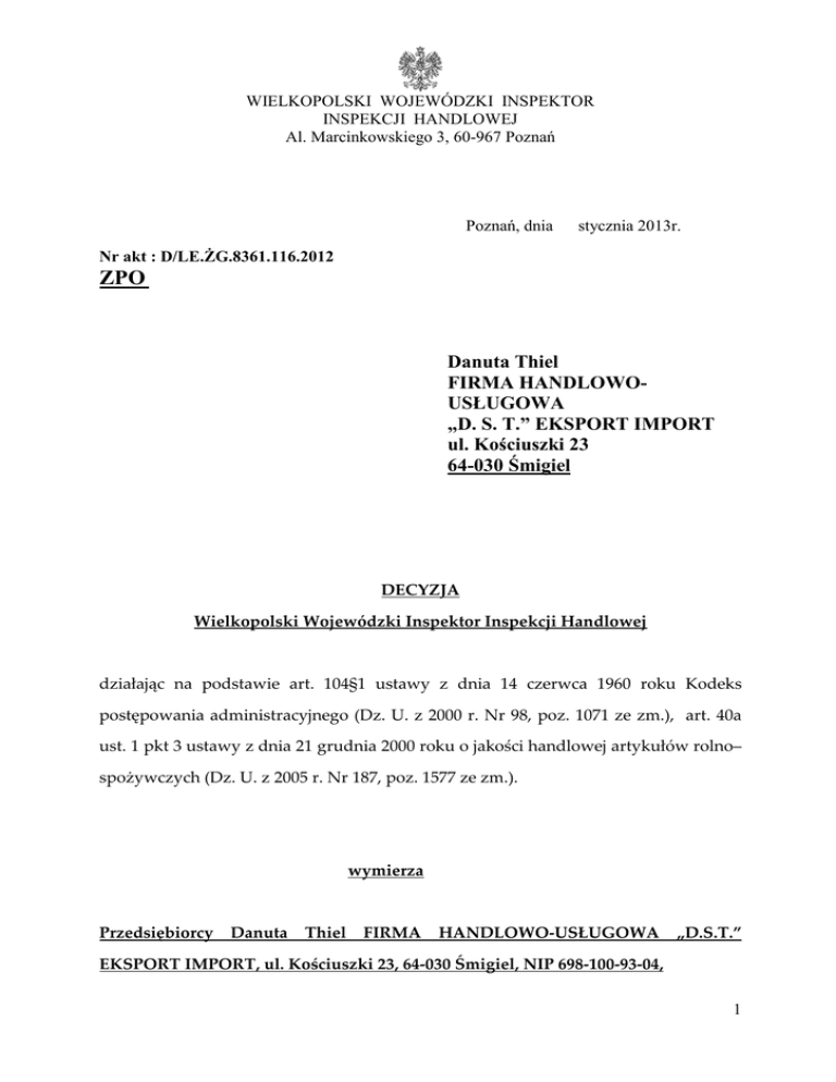 WIELKOPOLSKI WOJEWÓDZKI INSPEKTOR INSPEKCJI HANDLOWEJ Al. Marcinkowskiego 3, 60-967 Poznań Poznań, dnia stycznia 2013r. Nr akt : D/LE.ŻG.8361.116.2012 ZPO Danuta Thiel FIRMA HANDLOWOUSŁUGOWA „D. S. T.” EKSPORT IMPORT ul. Kościuszki 23 64-030 Śmigiel DECYZJA Wielkopolski Wojewódzki Inspektor Inspekcji Handlowej działając na podstawie art. 104§1 ustawy z dnia 14 czerwca 1960 roku Kodeks postępowania administracyjnego (Dz. U. z 2000 r. Nr 98, poz. 1071 ze zm.), art. 40a ust. 1 pkt 3 ustawy z dnia 21 grudnia 2000 roku o jakości handlowej artykułów rolno– spożywczych (Dz. U. z 2005 r. Nr 187, poz. 1577 ze zm.). wymierza Przedsiębiorcy Danuta Thiel FIRMA HANDLOWO-USŁUGOWA „D.S.T.” EKSPORT IMPORT, ul. Kościuszki 23, 64-030 Śmigiel, NIP 698-100-93-04, 1 karę pieniężną w wysokości 800,00zł. (słownie: osiemset złotych 00/100), wynikającą z art. 40a ust. 1 pkt 3 ustawy z dnia 21 grudnia 2000 roku o jakości handlowej artykułów rolno- spożywczych (Dz. U. z 2005 r. Nr 187, poz. 1577 ze zm.), z tytułu wprowadzenia do obrotu handlowego w dniu kontroli tj. w dniu 12 czerwca 2012 roku w sklepie w Śmiglu, Plac Rozstrzelanych 6, 64-030 Śmigiel, przedsiębiorca: Danuta Thiel FIRMA HANDLOWO-USŁUGOWA „D.S.T.” EKSPORT IMPORT, ul. Kościuszki 23, 64-030 Śmigiel, artykułów rolno - spożywczych nieodpowiadających jakości handlowej określonej w przepisach o jakości handlowej to jest: • partia 6kg filetów z miruny, w cenie 18,60zł/kg, dystrybutor: ŚWIAT RYB Monika Sturomska- Celmer, ul. Paczkowskiego 24b/2, 62-200 Gniezno, wartości 111,60zł, • partia 10,8kg filetów b/skóry z czarniaka, w cenie 24,00zł, dystrybutor: j. w., wartości 259,20zł, z uwagi na: całkowity brak oznaczeń w języku polskim: • w przypadku filetów z miruny na opakowaniu zbiorczym znajdowała się wyłącznie nazwa gatunkowa, • w przypadku filetów b/skóry z czarniaka na opakowaniu zbiorczym znajdowała się wyłącznie etykieta w języku obcym, 2 co stanowi naruszenie art. 48 ust. 2 ustawy z dnia 25 sierpnia 2006 roku o bezpieczeństwie żywności i żywienia (Dz. U. z 2010r. Nr 136, poz. 914 ze zm.) oraz art. 6 ust. 4 ustawy z dnia 21 grudnia 2000 roku o jakości handlowej artykułów rolnospożywczych (Dz. U. z 2005r. Nr 187, poz. 1577 ze zm.), ponadto: • partia 8kg filetów z tilapii b/skóry glazurowanych, w cenie 15,80zł/kg, producent: EU Aprr. No 4500/02029, importer: Nord Capital Sp. z o. o., Rekowo Górne, ul. Pucka 4, 84-123 Połchowo, wartości 126,40zł, • partia 5kg filetów z limandy żółtopłetwej b/skóry glazurowanych, w cenie 18,60zł/kg, producent: j. w., importer: j. w., wartości 93,00zł, z uwagi na: brak w miejscu sprzedaży informacji dotyczącej nazwy artykułu oraz informacji o ilościowej zawartości glazury lub ryby w artykule, co stanowi naruszenie §17 ust. 1 pkt 3 rozporządzenia Ministra Rolnictwa i Rozwoju Wsi z dnia 10 lipca 2007 roku w sprawie znakowania środków spożywczych (Dz. U. Nr 137, poz. 966 ze zm.). Kontrolowany wprowadził zatem do obrotu artykuły rolno-spożywcze nieodpowiadające jakości handlowej określonej w przepisach o jakości handlowej co skutkuje zastosowaniem art. 40a ust. 1 pkt 3 ustawy o jakości handlowej artykułów rolno- spożywczych (Dz. U. z 2005, Nr 187 poz. 1577 ze zm.). „Kto wprowadza do obrotu artykuły rolno-spożywcze nieodpowiadające jakości handlowej określonej w przepisach o jakości handlowej lub deklarowanej przez producenta w oznakowaniu tych artykułów, podlega karze pieniężnej w wysokości do pięciokrotnej wartości korzyści majątkowej uzyskanej lub która mogłaby zostać uzyskana przez wprowadzenie tych artykułów rolno- spożywczych do obrotu, nie niższej jednak niż 500 zł.” 3 Uzasadnienie Podczas kontroli przeprowadzonej przez Wojewódzki Inspektorat Inspekcji Handlowej w Poznaniu Delegaturę w Lesznie, w dniach od 5 do 12 czerwca 2012 roku w sklepie w Śmiglu, Plac Rozstrzelanych 6, 64-030 Śmigile, przedsiębiorca: Danuta Thiel FIRMA HANDLOWO-USŁUGOWA „D.S.T.” EKSPORT IMPORT, ul. Kościuszki 23, 64-030 Śmigiel, stwierdzono nieprawidłowości w oznakowaniu, w przypadku 4 partii ryb mrożonych, ogólnej wartości 590,20zł, to jest: • partia 6kg filetów z miruny, w cenie 18,60zł/kg, dystrybutor: ŚWIAT RYB Monika Sturomska- Celmer, ul. Paczkowskiego 24b/2, 62-200 Gniezno, wartości 111,60zł, • partia 10,8kg filetów b/skóry z czarniaka, w cenie 24,00zł, dystrybutor: j. w., wartości 259,20zł, z uwagi na: całkowity brak oznaczeń w języku polskim: • w przypadku filetów z miruny na opakowaniu zbiorczym znajdowała się wyłącznie nazwa gatunkowa, • w przypadku filetów b/skóry z czarniaka na opakowaniu zbiorczym znajdowała się wyłącznie etykieta w języku obcym, co stanowi naruszenie art. 48 ust. 2 ustawy z dnia 25 sierpnia 2006 roku o bezpieczeństwie żywności i żywienia (Dz. U. z 2010r. Nr 136, poz. 914 ze zm.) oraz art. 6 ust. 4 ustawy z dnia 21 grudnia 2000 roku o jakości handlowej artykułów rolnospożywczych (Dz. U. z 2005r. Nr 187, poz. 1577 ze zm.), 4 ponadto: • partia 8kg filetów z tilapii b/skóry glazurowanych, w cenie 15,80zł/kg, producent: EU Aprr. No 4500/02029, importer: Nord Capital Sp. z o. o., Rekowo Górne, ul. Pucka 4, 84-123 Połchowo, wartości 126,40zł, • partia 5kg filetów z limandy żółtopłetwej b/skóry glazurowanych, w cenie 18,60zł/kg, producent: j. w., importer: j. w., wartości 93,00zł, z uwagi na: brak w miejscu sprzedaży informacji dotyczącej nazwy artykułu oraz informacji o ilościowej zawartości glazury lub ryby w artykule, co stanowi naruszenie §17 ust. 1 pkt 3 rozporządzenia Ministra Rolnictwa i Rozwoju Wsi z dnia 10 lipca 2007 roku w sprawie znakowania środków spożywczych (Dz. U. Nr 137, poz. 966 ze zm.). Wobec powyższego należy uznać, że kontrolowany wprowadził do obrotu artykuły rolno-spożywcze nieodpowiadające jakości handlowej określonej w przepisach o jako