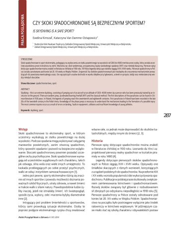 PRACA POGLĄDOWA CZY SKOKI SPADOCHRONOWE SĄ BEZPIECZNYM SPORTEM? IS SKYDIVING IS A SAFE SPORT? Ewelina Kimszal1, Katarzyna Van Damme-Ostapowicz2 1 2 Studenckie Koło Naukowe Tropik przy Zakładzie Zintegrowanej Opieki Medycznej, Uniwersytet Medyczny w Białymstoku Zakład Zintegrowanej Opieki Medycznej, Uniwersytet Medyczny w Białymstoku STRESZCZENIE Skoki spadochronowe to sport ekstremalny, polegający na wyskoczeniu ze statku powietrznego na wysokości od 1200 do 4000 metrów przez osobę, która została wcześniej wyszkolona przez instruktora na ziemi. Wyróżnia się: skok tandemowy, przyspieszoną naukę swobodnego spadania (AFF) oraz metodę klasyczną. Pierwsze opisy dotyczące spadochronów można znaleźć w literaturze chińskiej w 1100 roku. W Polsce legendy dotyczące skoków sięgają XVII i XVIII wieku. Pierwsze spadochrony w Polsce zostały zanotowane pod koniec lat 20. XX wieku w Wojsku Polskim. Znajomość faz skoków spadochronowych jest niezbędna do zrozumienia mechanizmów prowadzących do powstania ewentualnego urazu. Do najczęstszych urazów dochodzi w wyniku błędów przy lądowaniu, usterek w sprzęcie, kolizji oraz niedostatecznej wiedzy młodych skoczków. Słowa kluczowe: spadochroniarstwo, sport. ABSTRACT Skydiving – this is an extreme skydiving, consisting of jumping out of an aircraft at an altitude of 1200–4000 meters by a person who has been previously trained by an instructor on the ground. There are tandem jump, accelerated learning freefall (AFF) and the classical method. The first descriptions of the parachutes can be found in Chinese literature in 1100 years. In Poland, the legends of jumping reach the seventeenth and eighteenth centuries. First parachutes in Poland have been recorded in the late 20s of the twentieth century in the Polish Army. Knowledge of the phase jumps is necessary to understand the mechanisms leading to the formation of a possible injury. The most common injuries occur as a result of errors on landing, faults in equipment, collisions and insufficient knowledge of young athletes. Keywords: skydiving, sport. 287 Wstęp Skoki spadochronowe to ekstremalny sport, w którym uczestnicy wyskakują ze statku powietrznego na dużej wysokości. Podczas spadania mogą wykonywać całą gamę manewrów powietrznych, zanim otworzą spadochron, który spowolni opadanie i pozwoli na bezpieczne wylądowanie. Skoczek spadochronowy powinien posiadać szczególne cechy psychofizyczne. Skoki spadochronowe wymagają od uczestników wyjątkowych cech charakteru, takich jak odwaga, silna wola oraz wiele innych umiejętności. To kaskada przebiegających po sobie przeżyć psychicznych, walki ze sobą i instynktem samozachowawczym [1]. Jedno jest pewne, sporty ekstremalne różnią się znacznie od innych sportów z powodu możliwości doznania poważnych szkód fizycznych, utraty zdrowia, a nawet śmierci w trakcie walki z siłami natury. Prawdopodobnie ludzie żyliby inaczej, jeżeli nie istniałaby śmierć. Ich światopogląd, sposób życia, wybory, cele i marzenia byłyby diametralnie inne [2]. Intrygujący jest problem śmiertelności u sportowców, którzy sami prowokują sytuacje ekstremalne. Osoby te poprzez podjęcie ekstremalnego ryzyka chcą zrealizować Polski Przegląd Nauk o Zdrowiu 4 (41) 2014 własne cele, co jednak może doprowadzić do skutków katastrofalnych, między innymi do śmierci [2, 3]. Historia Pierwsze opisy dotyczące spadochronów można znaleźć w literaturze chińskiej w 1100 roku. Leonardo da Vinci zaprojektował pierwszy realny spadochron w kształcie piramidy w roku 1480 [4]. Legendy dotyczące pierwszych skoków spadochronowych w Polsce sięgają XVII i XVIII wieku. Opisywały one śmiałków skaczących z różnych wzniesień, korzystających z urządzeń podobnych do spadochronów. Na przełomie XIX i XX wieku wzrosła popularności idei wykorzystywania spadochronu. Publikacje w polskiej prasie skutkowały zwiększeniem zainteresowania lotnictwem i spadochroniarstwem. Rozwój skoków związany był głównie z rozbudowaniem sił zbrojnych po odzyskaniu niepodległości w 1918 roku [5]. Pierwsze spadochrony w Polsce zostały odnotowane pod koniec lat 20. XX wieku w Wojsku Polskim. Spadochroniarstwo na początku było postrzegane wyłącznie jako środek ratowniczy w lotnictwie wojskowym. W późniejszym czasie miało stać się szkołą charakteru i obywatelskich postaw młodzieży. W 1939 roku główni przedstawiciele Ligi Obrony Powietrznej i Przeciwgazowej (LOPP) zaproponowali hasło „Młodzież na spadochrony” w ten sposób uruchomiając program masowego szkolenia spadochronowego dla młodzieży, dostępnego w całym kraju [5, 6]. LOPP zbudował wówczas 24 lotniska i 30 szybowisk [7]. Kobiety były marginalizowane i nie brano ich pod uwagę w społeczności skoczków spadochronowych. Dopiero pod koniec 1960 roku i do połowy 1970 roku nastąpiła zmiana. Zauważono, że kobiety rozwijają swoje umiejętności w takim samym stopniu jak mężczyźni. Od 1980 roku do chwili obecnej skoki spadochronowe stają się co raz bardziej popularne, jest co raz więcej trenerów, pojawiają się nowe umiejętności. Rozwija się konkurencja technicznych i technologicznych innowacji [8]. Rodzaje skoków spadochronowych 288 Skok tandemowy polega na skoku z samolotu przy użyciu spadochronu dwuosobowego z osobą wykwalifikowaną (instruktorem), mającą pod opieką pasażera. Jest to najbardziej bezpieczny sposób skakania, który przygotowuje do samodzielnego skakania. Skok wykonywany jest z wysokości 3000–4000 metrów, dzięki temu można swobodnie spadać przez 35–60 sekund, z prędkością około 200 km/h. Instruktor otwiera spadochron i w czasie kilkunastu minut można oglądać świat z góry. Należy podkreślić, że przed skokiem instruktor pokazuje sprzęt,z którym będzie się skakać, tłumaczy zasady, które należy przestrzegać w czasie swobodnego spadania i szybowania na otwartym spadochro