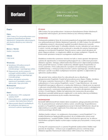BORLAND CASE STUDY 20th Century Fox FAKTY O FIRMIE FIRMA 20th Century Fox jest producentem i œwiatowym dystrybutorem filmów fabularnych i programów telewizyjnych, jak równie¿ dostawc¹ sieci telewizji kablowej. 20th Century Fox jest producentem oraz œwiatowym dystrybutorem filmów fabularnych i programów telewizyjnych, jak równie¿ dostawc¹ sieci telewizji kablowej. BRAN¯ A / SEKTOR Media i rozrywka WYZWANIA Profesjonalne podejœcie firmy do tworzenia popularnych programów telewizyjnych oraz pe³nometra¿owych filmów fabularnych sprawi³o, ¿e 20th Century Fox jest jednym z najbardziej znanych i docenianych spoœród wszystkich dostawców rozrywki, generuj¹cym przychód rzêdu 11 miliardów dolarów rocznie. Jednak¿e ten sam sukces, a zatem i rozwój, poci¹gn¹³ wzrost oczekiwañ w stosunku do systemu finansowego opartego na rozwi¹zaniu PeopleSoft. Dotychczasowy system zosta³ obci¹¿ony do granic dopuszczalnoœci, co negatywnie odbi³o siê na jego wydajnoœci. Pojawi³a siê koniecznoœæ sprostania rosn¹cym wymaganiom u¿ytkowników. OBSZAR Ca³y œwiat WYZWANIA Symulacja 240 jednoczesnych u¿ytkowników systemu transakcyjnego i raportuj¹cego online Dopasowanie siê do rosn¹cych wymagañ u¿ytkowników w zakresie szybszego systemu raportuj¹cego i transakcyjnego Balans obci¹¿enia serwerów raportowych pomiêdzy systemy operacyjne i typy procesów ROZWI¥ZANIE Borland® SilkPerformer® EFEKTY Zwiêkszona o 50% wydajnoœæ systemu OLTP Zidentyfikowanie „w¹skiego gard³a” w postaci zbyt du¿ej bazy danych Opracowanie danych niezbêdnych do roz³o¿enia obci¹¿enia na serwerach systemu raportuj¹cego Dodatkowo œrodowisko systemowe równie¿ nie by³o w stanie sprostaæ obci¹¿eniom systemu do raportowania w momentach pokrywaj¹cych siê z cyklicznym procesem sk³adania raportów. Istniej¹cy uk³ad œrodowiska klient-serwer odpowiada³ posiadaniu farmy ponad 600 maszyn, na które u¿ytkownicy sk³adali raporty bezpoœrednio ze swoich systemów. Firma zadecydowa³a o przejœciu od wydzielonego systemu do wspó³dzielonego, z mniejsz¹ liczb¹ serwerów systemu raportuj¹cego, umo¿liwiaj¹cego ³atwiejsze i przede wszystkim wydajniejsze tworzenie raportów w odpowiedzi na zg³oszenia u¿ytkowników. Aby sprostaæ temu zadaniu firma Fox zdecydowa³a siê na aktualizacjê oprogramowania PeopleSoft. Projekt by³ prowadzony przez Rajeev Diddee, dyrektora IT do spraw systemów finansowych w 20th Century Fox. W jego gestii le¿a³o uaktualnienie w Foxie systemu PeopleSoft z wersji 7.5 typu klient/serwer do wersji PeopleSoft 8 pracuj¹cej ca³kowicie w œrodowisku Webowym. Zakoñczenie tej operacji z sukcesem umo¿liwi³oby filmowemu gigantowi wiêksz¹ elastycznoœæ w udostêpnianiu us³ug zwi¹zanych z systemami transakcyjnymi czy wysokim obci¹¿eniem systemów nVision i Crystal Reports. Diddee by³ optymistycznie nastawiony do procedury aktualizacji, posiada³ jednak pewne w¹tpliwoœci co do analizy obecnej architektury i póŸniejszego przeniesienia jej do modelu internetowego. ROZWI¥ZANIE Borland® SilkPerformer® by³ w³aœnie takim narzêdziem, jakiego potrzebowa³a firma Fox, by przeanalizowaæ swój back-endowy system, umo¿liwiaj¹c bezproblemowe przejœcie na PeopleSoft w przegl¹darkowej wersji 8. Borland SilkPerformer okaza³ siê odpowiedzi¹ na wszystkie w¹tpliwoœci Foxa dotycz¹ce analizy wydajnoœciowej systemu przed jego aktualizacj¹. „Byliœmy bardzo ciekawi, czy u¿ytkownicy korzystaj¹cy z wersji PeopleSoft 7.5 w modelu klient/serwer bêd¹ potrafili przestawiæ siê na u¿ytkowanie nowej wersji przegladarkowej,” wyjaœni³ Diddee. Diddie chcia³ równie¿ upewniæ siê, ¿e obecna infrastruktura sprzêtowa bêdzie wystarczaj¹co wydajna przy korzystaniu z nowej wersji systemu. Z liczb¹ 650 zarejestrowanych w systemie PeopleSoft u¿ytkowników Diddee mia³ powody do niepokoju – zw³aszcza po uwzglêdnieniu procesu comiesiêcznego sk³adania raportów finansowych w³aœcicielowi 20th Century Fox, firmie News Borland Case Study: 20th Century Fox „Jeœli piêciu, szeœciu u¿ytkowników robi³o wpisy do systemu, nie by³o k³opotu. Ale kiedy dochodzi³o do 50-60 takich jednoczesnych operacji, system siê zawiesza³. Zlokalizowanie Ÿród³a tego problemu by³o prawie niemo¿liwe tradycyjnymi metodami – gdyby nie testowanie przeprowadzone przez nas przy pomocy narzêdzia SilkPerformer, raczej nie uda³oby siê to nam nigdy.” - Rajeev Diddee, Dyrektor IT do spraw Systemów Finansowych w 20th Century Fox Corporation Ltd. Diddee oszacowa³, ¿e w szczytowych momentach system generowa³ 2 500 – 3 500 raportów finansowych dziennie. „W zasadzie nie posiadaliœmy ¿adnych danych pozwalaj¹cych nam stwierdziæ, jak nowy system bêdzie dzia³a³ przy takim obci¹¿eniu. Co siê stanie, jeœli 200 u¿ytkowników jednoczeœnie zleci wykonanie raportów systemowi nVision? Jaki to bêdzie mia³o wp³yw na resztê systemu?”, zastanawia³ siê. EFEKTY Dziêki testom obci¹¿eniowym i wydajnoœciowym wykonanym przy pomocy narzêdzia Borland SilkPerformer oraz Borland SilkEssentials for PeopleSoft, Diddee by³ w stanie stworzyæ skrypty imituj¹ce procesy transakcyjne. Dziêki losowemu generowaniu danych uda³o siê zoptymalizowaæ cache-server i zasymulowaæ rzeczywiste zachowanie u¿ytkownika, ponadto przetestowaæ procesy systemów SQR, nVision i Crystal, ustaliæ maksimum obci¹¿enia i roz³o¿enia zadañ, co zaowocowa³o d³ugoterminowym testem stabilnoœci serwerów. W czasie testów obci¹¿eniowych Diddee by³ w stanie zlokalizowaæ g³ówny czu³y punkt systemu odpowiadaj¹cy za wiêkszoœæ problemów wydajnoœciowych, których skutki odczuwa³a ca³a firma. Serwer bazy danych okaza³ siê zbyt s³aby w porównaniu do pozosta³ych zasobów sprzêtowych. Podczas przeprowadzania testów obci¹¿eniowych Diddee odkry³ równie¿ problem z dziennikiem transakcji: operacje otwarcia rachunku nie mog³y byæ przeprowadzane jednoczeœn