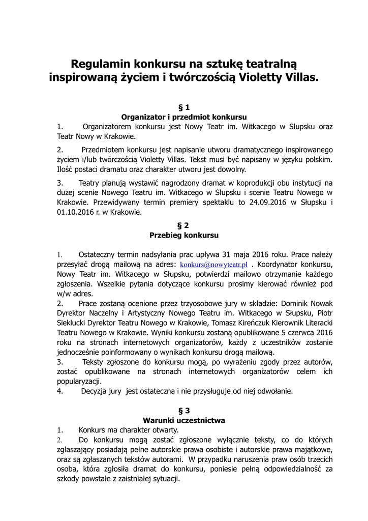 Regulamin konkursu na sztukę teatralną inspirowaną życiem i twórczością Violetty Villas. §1 Organizator i przedmiot konkursu 1. Organizatorem konkursu jest Nowy Teatr im. Witkacego w Słupsku oraz Teatr Nowy w Krakowie. 2. Przedmiotem konkursu jest napisanie utworu dramatycznego inspirowanego życiem i/lub twórczością Violetty Villas. Tekst musi być napisany w języku polskim. Ilość postaci dramatu oraz charakter utworu jest dowolny. 3. Teatry planują wystawić nagrodzony dramat w koprodukcji obu instytucji na dużej scenie Nowego Teatru im. Witkacego w Słupsku i scenie Teatru Nowego w Krakowie. Przewidywany termin premiery spektaklu to 24.09.2016 w Słupsku i 01.10.2016 r. w Krakowie. §2 Przebieg konkursu 1. Ostateczny termin nadsyłania prac upływa 31 maja 2016 roku. Prace należy przesyłać drogą mailową na adres: [email protected] . Koordynator konkursu, Nowy Teatr im. Witkacego w Słupsku, potwierdzi mailowo otrzymanie każdego zgłoszenia. Wszelkie pytania dotyczące konkursu prosimy kierować również pod w/w adres. 2. Prace zostaną ocenione przez trzyosobowe jury w składzie: Dominik Nowak Dyrektor Naczelny i Artystyczny Nowego Teatru im. Witkacego w Słupsku, Piotr Sieklucki Dyrektor Teatru Nowego w Krakowie, Tomasz Kireńczuk Kierownik Literacki Teatru Nowego w Krakowie. Wyniki konkursu zostaną opublikowane 5 czerwca 2016 roku na stronach internetowych organizatorów, każdy z uczestników zostanie jednocześnie poinformowany o wynikach konkursu drogą mailową. 3. Teksty zgłoszone do konkursu mogą, po wyrażeniu zgody przez autorów, zostać opublikowane na stronach internetowych organizatorów celem ich popularyzacji. 4. Decyzja jury jest ostateczna i nie przysługuje od niej odwołanie. §3 Warunki uczestnictwa 1. Konkurs ma charakter otwarty. 2. Do konkursu mogą zostać zgłoszone wyłącznie teksty, co do których zgłaszający posiadają pełne autorskie prawa osobiste i autorskie prawa majątkowe, oraz są zgłaszanych tekstów autorami. W przypadku naruszenia praw osób trzecich osoba, która zgłosiła dramat do konkursu, poniesie pełną odpowiedzialność za szkody powstałe z zaistniałej sytuacji. 3. Zgłoszenie ma charakter dobrowolny i jest równoznaczne z akceptacją warunków niniejszego regulaminu. 4. Zgłoszenie konkursowe powinno zawierać, oprócz elektronicznej wersji dramatu zapisanej w formacie doc (lub odt) lub pdf, imię i nazwisko oraz dane kontaktowe autora (utwory mogą być podpisane pseudonimem artystycznym). §4 Nagroda 1. Wybrany utwór zostanie wystawiony w ramach koprodukcji Nowego Teatru im. Witkacego w Słupsku oraz Teatru Nowego w Krakowie. 2. Nagroda w konkursie wynosi 10 000 zł (słownie: dziesięć tysięcy PLN) brutto. Wygrana w konkursie jest równoznaczna z przekazaniem przez Autora niewyłącznych praw do utworu w zakresie eksploatacji powstałego na jego podstawie spektaklu w koprodukcji Nowego Teatru im. Witkacego w Słupsku i Teatru Nowego w Krakowie bez jakichkolwiek ograniczeń czasowych lub terytorialnych. Autor nagrodzonej pracy wyraża jednocześnie zgodę na jej adaptację sceniczną na potrzeby powstającego spektaklu i przekazuje prawo do prapremiery nagrodzonego tekstu Organizatorom. 3. Autor pozostaje właścicielem praw autorskich nagrodzonego tekstu na wszelkich polach poza wymienionymi w § 4 pnkt 2 niniejszego regulaminu. 4. Organizatorzy zastrzegają sobie prawo do odstąpienia od przyznania nagrody. §5 Postanowienia końcowe 1. Przesłanie zgłoszenia jest równoznaczne ze zgodą na przetwarzanie przez Organizatorów danych osobowych w rozumieniu ustawy z dnia 29.08.1997r. o ochronie danych osobowych (t.j. Dz.U. z 2002r., nr 101, poz. 926 z późn. zm.) w zakresie koniecznym do prawidłowego przeprowadzenia konkursu oraz ogłoszenia jego wyników. 2. Teatr jako organizator konkursu nie ponosi odpowiedzialności za usługi poczty elektronicznej, z której korzystać będą osoby uczestniczące w konkursie. Teatr nie ponosi również odpowiedzialności za działania osób trzecich, związanych z organizacją konkursu oraz za szkody spowodowane podaniem błędnych lub nieaktualnych danych przez osoby uczestniczące w konkursie. 3. Organizatorzy zastrzegają sobie prawo do wprowadzania zmian w niniejszym regulaminie.
