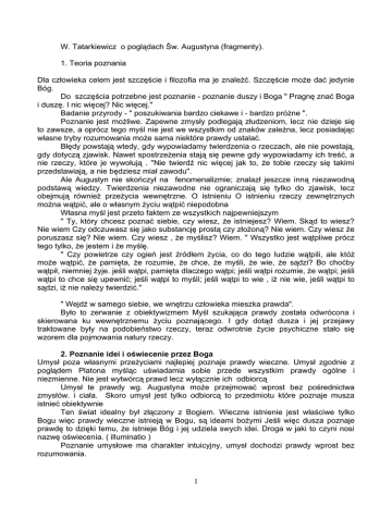 W. Tatarkiewicz o poglądach Św. Augustyna (fragmenty). 1. Teoria poznania Dla człowieka celem jest szczęście i filozofia ma je znaleźć. Szczęście może dać jedynie Bóg. Do szczęścia potrzebne jest poznanie - poznanie duszy i Boga " Pragnę znać Boga i duszę. I nic więcej? Nic więcej." Badanie przyrody - " poszukiwania bardzo ciekawe i - bardzo próżne ". Poznanie jest możliwe. Zapewne zmysły podlegają złudzeniom, lecz nie dzieje się to zawsze, a oprócz tego myśl nie jest we wszystkim od znaków zależna, lecz posiadając własne tryby rozumowania może sama niektóre prawdy ustalać. Błędy powstają wtedy, gdy wypowiadamy twierdzenia o rzeczach, ale nie powstają, gdy dotyczą zjawisk. Nawet spostrzeżenia stają się pewne gdy wypowiadamy ich treść, a nie rzeczy, które je wywołują . "Nie twierdź nic więcej jak to, że tobie rzeczy się takimi przedstawiają, a nie będziesz miał zawodu". Ale Augustyn nie skończył na fenomenalizmie; znalazł jeszcze inną niezawodną podstawą wiedzy. Twierdzenia niezawodne nie ograniczają się tylko do zjawisk, lecz obejmują również przeżycia wewnętrzne. O istnieniu O istnieniu rzeczy zewnętrznych można wątpić, ale o własnym życiu wątpić niepodobna Własna myśl jest przeto faktem ze wszystkich najpewniejszym " Ty, który chcesz poznać siebie, czy wiesz, że istniejesz? Wiem. Skąd to wiesz? Nie wiem Czy odczuwasz się jako substancję prostą czy złożoną? Nie wiem. Czy wiesz że poruszasz się? Nie wiem. Czy wiesz , że myślisz? Wiem. " Wszystko jest wątpliwe prócz tego tylko, że jestem i że myślę. " Czy powietrze czy ogień jest źródłem życia, co do tego ludzie wątpili, ale któż może wątpić, że pamięta, że rozumie, że chce, że myśli, że wie, że sądzi? Bo choćby wątpił, niemniej żyje. jeśli wątpi, pamięta dlaczego wątpi; jeśli wątpi rozumie, że wątpi; jeśli wątpi to chce się upewnić; jeśli wątpi to myśli; jeśli wątpi to wie , iż nie wie, jeśli wątpi to sądzi, iż nie należy twierdzić." " Wejdź w samego siebie, we wnętrzu człowieka mieszka prawda". Było to zerwanie z obiektywizmem Myśl szukająca prawdy została odwrócona i skierowana ku wewnętrznemu życiu poznającego. I gdy dotąd dusza i jej przejawy traktowane były na podobieństwo rzeczy, teraz odwrotnie życie psychiczne stało się wzorem dla pojmowania natury rzeczy. 2. Poznanie idei i oświecenie przez Boga Umysł poza własnymi przeżyciami najlepiej poznaje prawdy wieczne. Umysł zgodnie z poglądem Platona myśląc uświadamia sobie przede wszystkim prawdy ogólne i niezmienne. Nie jest wytwórcą prawd lecz wyłącznie ich odbiorcą Umysł te prawdy wg. Augustyna może przejmować wprost bez pośrednictwa zmysłów. i ciała. Skoro umysł jest tylko odbiorcą to przedmiotu które poznaje musza istnieć obiektywnie Ten świat idealny był złączony z Bogiem. Wieczne istnienie jest właściwe tylko Bogu więc prawdy wieczne istnieją w Bogu, są ideami bożymi Jeśli więc dusza poznaje prawdę to dzięki temu, że istnieje Bóg i jej udziela swych idei. Droga w jaki to czyni nosi nazwę oświecenia. ( illuminatio ) Poznanie umysłowe ma charakter intuicyjny, umysł dochodzi prawdy wprost bez rozumowania. 1 Intuicyjne oglądanie bóstwa było możliwe nie tyle przez zjednoczenie z nim lecz poprzez oświecenie - spotęgowanie władz poznawczych- dziełem łaski. Moment nadprzyrodzoności i łaski stanowił kamień węgielny chrześcijańskiej nauki o intuicji. Łaska oświecenia przysługuje dobrym; przygotowaniem do oświecenia jest więc mniej ćwiczenie umysłu niż oczyszczenie serca. Przez nacisk na oświecenie (spotęgowanie władz poznawczych), i łaskę Augustyn stworzył podstawy odrębnego mistycyzmu chrześcijańskiego.. Poznanie mistyczne jest ukoronowaniem poznania racjonalnego. Pewne wynikanie : mamy niezachwianą świadomość prawd wiecznych, wszystko zaś co wieczne, może istnieć c tylko w Bogu, więc Bóg istnieje. Dusza musi być wieczna, bo uświadamiając sobie prawdy wieczne ma udział w wieczności II. TEOCENTRYCZNA METAFIZYKA 1. Przewaga Boga nad światem a) Bóg jest najwyższym bytem, bo on jeden istnieje z własnej natury, wszystko zaś inne mogło by nie być. On jeden jest bytem niezależnym, wszelki inny byt istnieje tylko dzięki zrządzeniu boskiemu. Bóg nie tylko jest przyczyną wszelkiego bytu, ale też wszystkich jego przemian. Nie tylko stworzył świat, ale też nieustannie go zachowuje jakby stwarzając na nowo " Nie należy słuchać tych, którzy nauczają, że wyższymi świata dziedzinami rządzi opatrzność, niższą zaś częścią wstrząsają okoliczności i ruchy przypadkowe ". b) Bóg jest najważniejszym przedmiotem poznania : poznanie przemijających zjawisk nie ma bowiem wartości wobec bytu absolutnego. Zarazem w myśl iluminizmu Bóg jest przyczyną poznania, c) Bóg jest najwyższym dobrem i zarazem przyczyna wszelkiego dobra " Cóż jest warta mnogość dóbr, to dobro i tamto dobro? Wyzbądź się tego i tamtego i patrz, jeśli możesz, na samo dobro, a wtedy zobaczysz Boga, który jest dobrem nie dzięki innemu dobru, lecz jest dobrem wszystkich dóbr" Dlatego Bóg jest właściwym celem życia " Uczyniłeś nas dla Siebie i niespokojne jest serce nasze, póki nie spocznie w tobie" Dobro i szczęście są darem Boga , dziełem laski. , a zło? Zło polega na odsunięciu się od Boga i na pysze, która mniema, że stworzenie może obyć się bez Boga. 2. Przewaga duszy nad ciałem a) dusza jest substancją samoistną; nie jest ani własnością ciała, ani rodzajem ciała. Posiada tylko dwie takie funkcje jak : myśl, wola, pamięć. Funkcje duszy tym się różnią tym się różnią od funkcji ciała, bo tylko one mogą być zwracane ku sobie - można myśleć o sobie, , pamiętać o sobie itd. b) dusze poznajemy lepiej niż ciało. Wiedza o duszy jest pewna, tylko ona poza tym jest w stanie poznać Boga., którego "
