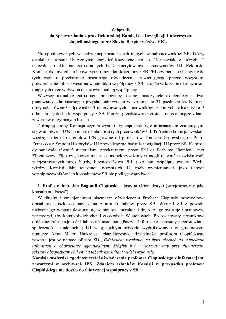 Załącznik do Sprawozdania z prac Rektorskiej Komisji ds. Inwigilacji Uniwersytetu Jagiellońskiego przez Służbę Bezpieczeństwa PRL Na opublikowanych w codziennej prasie listach tajnych współpracowników SB, którzy działali na terenie Uniwersytetu Jagiellońskiego znalazło się 26 nazwisk, z których 12 należało do aktualnie zatrudnionych bądź emerytowanych pracowników UJ. Rektorska Komisja ds. Inwigilacji Uniwersytetu Jagiellońskiego przez SB PRL zwróciła się listownie do tych osób o przekazanie pisemnego oświadczenia zawierającego przede wszystkim potwierdzenie lub zakwestionowanie faktu współpracy z SB, a także wskazanie okoliczności, mogących mieć wpływ na ocenę ewentualnej współpracy. Wszyscy aktualnie zatrudnieni pracownicy, czterej nauczyciele akademiccy i dwaj pracownicy administracyjni przysłali odpowiedzi w terminie do 31 października. Komisja otrzymała również odpowiedzi 5 emerytowanych pracowników, z których jednak tylko 3 odniosło się do faktu współpracy z SB. Poniżej przedstawione zostaną najistotniejsze zdania zawarte w otrzymanych listach. Z drugiej strony Komisja czyniła wysiłki aby zapoznać się z informacjami znajdującymi się w archiwach IPN na temat działalności tych pracowników UJ. Pośrednio komisja uzyskała wiedzę na temat materiałów IPN głównie od profesorów Tomasza Gąsowskiego i Piotra Franaszka z Zespołu Historyków UJ prowadzącego badania inwigilacji UJ przez SB. Komisja dysponowała również materiałami przekazanymi przez IPN dr Barbarze Niemiec i mgr Zbigniewowi Fijakowi, którzy mając status pokrzywdzonych mogli ujawnić nazwiska osób zarejestrowanych przez Służbę Bezpieczeństwa PRL jako tajni współpracownicy. Wedle wiedzy Komisji fakt rejestracji wszystkich 12 osób wymienionych jako tajnych współpracowników lub konsultantów SB nie podlega wątpliwości. 1. Prof. dr. hab. Jan Bogumił Ciopiński – Instytut Orientalistyki (zarejestrowany jako konsultant „Pasza”). W długim i emocjonalnym pisemnym oświadczeniu Profesor Ciopiński szczegółowo opisał jak doszło do nawiązania z nim kontaktów przez SB. Wyraził żal z powodu niebacznego wmanipulowania się w niejasną moralnie i dręczącą go sytuację i stanowczo zaprzeczył, aby komukolwiek chciał zaszkodzić. W archiwach IPN zachowały stosunkowo dokładne informacje o działalności konsultanta „Paszy”. Informacje te zostały przedstawione społeczności akademickiej UJ w specjalnym artykule wydrukowanym w grudniowym numerze Alma Mater. Najkrótsza charakterystyka działalności profesora Ciopińskiego zawarta jest w notatce oficera SB „Odniosłem wrażenie, że żywi niechęć do udzielania informacji o charakterze agenturalnym. Mógłby być wykorzystywany przy tłumaczeniu tekstów obcojęzycznych i chyba też tak konsultant widzi swoją rolę. Komisja stwierdza zgodność treści oświadczenia profesora Ciopińskiego z informacjami zawartymi w archiwach IPN. Zdaniem członków Komisji w przypadku profesora Ciopińskiego nie doszło do faktycznej współpracy z SB. 1 2. Profesor dr hab. Jan Stanek – Instytut Fizyki (TW „Lew”). Profesor Jan Stanek przekazał Komisji obszerny plik zawierający pisma do Komisji i do Rady Wydziału oraz polemikę z prof. Gąsowskim wydrukowaną w Alma Mater. Załączył też kopie korespondencji w sprawie udostępnienia mu dokumentacji IPN. W pismach zawarte są m.in. sporządzone z pamięci notatki dot. dokumentów, które okazano mu w IPN. Kontakty z SB rozpoczęły się w związku z odmowami wyjazdów za granicę. Miało to miejsce od 1978 r. W latach 1980-tych kontakty uległy intensyfikacji. Obecnie przyznaje, że odbywanie spotkań w miejscu publicznym (kawiarni) było niewłaściwe. Charakteryzuje typowy przebieg spotkań – obejmowały one m.in. pytania o nastroje w Instytucie i o określone osoby, także o podziemną opozycję. W odpowiedziach starał się szeroko wypowiadać o sprawach ogólnych i unikać konkretnych danych na temat osób. Pamięta, że reagując ze zdenerwowaniem na pytania mógł w jednej z rozmów dostarczyć przydatnych dla funkcjonariusza danych. Natomiast nie krępował się wspominać o przypadkach korupcji w sprawach gospodarczych. Nie był autorem materiałów przekazywanych dla SB, sam składał jedynie sprawozdania o pobytach za granicą. Nie uzyskiwał korzyści materialnych. Swe kontakty tłumaczy ciekawością, a także nadzieją na przyczynienie się do ideowej erozji komunistycznego przeciwnika. Zdarzało się, że mówił funkcjonariuszowi o swej niechęci do spotkań. Nigdy nie wyraził zgody na współpracę i takiej propozycji też mu nie składano. Zarejestrowanie jako TW i nadanie Mu dwóch pseudonimów uważa za mistyfikację – wysuwa przypuszczenie, że chodzi o inną osobę. Konstatuje pewne niejasności w udostępnionych dokumentach i brak w nich istotnych materiałów. Z nielicznych informacji uzyskanych przez historyków oraz znanych nam z materiałów udostępnionych Komisji przez dr Barbarę Niemiec wiadomo o funkcjonowaniu "Lwa" w sieci TW (spotkania z funkcjonariuszami SB i plan operacyjny na rok 1986) w latach 1986-1989 3. Prof. dr hab. Franciszek Szafraniec – Instytut Matematyki (TW „Józef”). Przekazał Komisji ponad jedną stronę wyjaśnień, które składał swojej Radzie Wydziału, a także korespondencję z IPN w sprawie udostępnienia akt dotyczących Jego osoby. W drugiej połowie lat osiemdziesiątych był nękany przez SB rozmowami, na które wzywano Go telefonicznie. Godził się na nie chcąc uniknąć niepokojenia rodziny. W rozmowach z funkcjonariuszem padały zwykle nazwiska kilku pracowników, starał się jednak podawać na ich temat fakty powszechnie znane, które, wg Jego przekonania, nie mogły nikomu szkodzić. Nie podpisał zobowiązania o współpracy, nie pisał raportów. Kontakty ustały „niespodziewanie”. Jedyne materiały dotyczące profesora Szafrańca znajdują się w mate