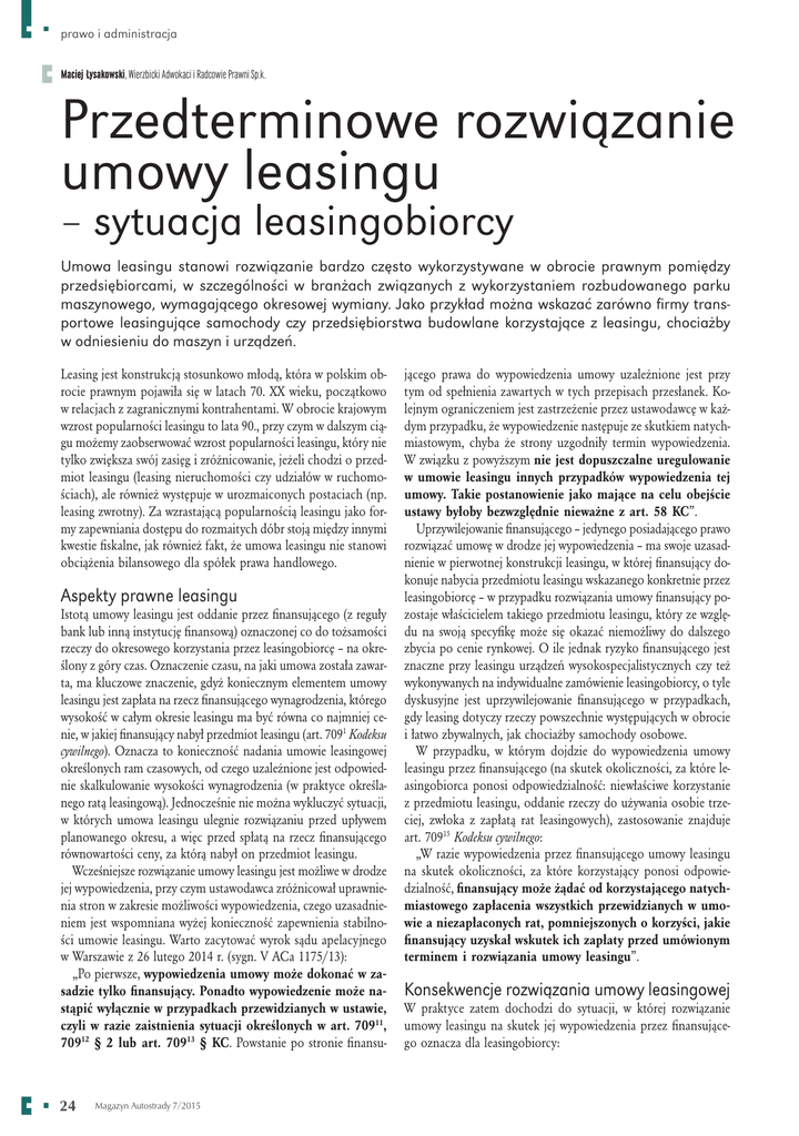 prawo i administracja Maciej Łysakowski, Wierzbicki Adwokaci i Radcowie Prawni Sp.k. Przedterminowe rozwiązanie umowy leasingu – sytuacja leasingobiorcy Umowa leasingu stanowi rozwiązanie bardzo często wykorzystywane w obrocie prawnym pomiędzy przedsiębiorcami, w szczególności w branżach związanych z wykorzystaniem rozbudowanego parku maszynowego, wymagającego okresowej wymiany. Jako przykład można wskazać zarówno firmy transportowe leasingujące samochody czy przedsiębiorstwa budowlane korzystające z leasingu, chociażby w odniesieniu do maszyn i urządzeń. Leasing jest konstrukcją stosunkowo młodą, która w polskim obrocie prawnym pojawiła się w latach 70. XX wieku, początkowo w relacjach z zagranicznymi kontrahentami. W obrocie krajowym wzrost popularności leasingu to lata 90., przy czym w dalszym ciągu możemy zaobserwować wzrost popularności leasingu, który nie tylko zwiększa swój zasięg i zróżnicowanie, jeżeli chodzi o przedmiot leasingu (leasing nieruchomości czy udziałów w ruchomościach), ale również występuje w urozmaiconych postaciach (np. leasing zwrotny). Za wzrastającą popularnością leasingu jako formy zapewniania dostępu do rozmaitych dóbr stoją między innymi kwestie fiskalne, jak również fakt, że umowa leasingu nie stanowi obciążenia bilansowego dla spółek prawa handlowego. Aspekty prawne leasingu Istotą umowy leasingu jest oddanie przez finansującego (z reguły bank lub inną instytucję finansową) oznaczonej co do tożsamości rzeczy do okresowego korzystania przez leasingobiorcę – na określony z góry czas. Oznaczenie czasu, na jaki umowa została zawarta, ma kluczowe znaczenie, gdyż koniecznym elementem umowy leasingu jest zapłata na rzecz finansującego wynagrodzenia, którego wysokość w całym okresie leasingu ma być równa co najmniej cenie, w jakiej finansujący nabył przedmiot leasingu (art. 7091 Kodeksu cywilnego). Oznacza to konieczność nadania umowie leasingowej określonych ram czasowych, od czego uzależnione jest odpowiednie skalkulowanie wysokości wynagrodzenia (w praktyce określanego ratą leasingową). Jednocześnie nie można wykluczyć sytuacji, w których umowa leasingu ulegnie rozwiązaniu przed upływem planowanego okresu, a więc przed spłatą na rzecz finansującego równowartości ceny, za którą nabył on przedmiot leasingu. Wcześniejsze rozwiązanie umowy leasingu jest możliwe w drodze jej wypowiedzenia, przy czym ustawodawca zróżnicował uprawnienia stron w zakresie możliwości wypowiedzenia, czego uzasadnieniem jest wspomniana wyżej konieczność zapewnienia stabilności umowie leasingu. Warto zacytować wyrok sądu apelacyjnego w Warszawie z 26 lutego 2014 r. (sygn. V ACa 1175/13): „Po pierwsze, wypowiedzenia umowy może dokonać w zasadzie tylko finansujący. Ponadto wypowiedzenie może nastąpić wyłącznie w przypadkach przewidzianych w ustawie, czyli w razie zaistnienia sytuacji określonych w art. 70911, 70912 § 2 lub art. 70913 § KC. Powstanie po stronie finansu- 24 Magazyn Autostrady 7/2015 jącego prawa do wypowiedzenia umowy uzależnione jest przy tym od spełnienia zawartych w tych przepisach przesłanek. Kolejnym ograniczeniem jest zastrzeżenie przez ustawodawcę w każdym przypadku, że wypowiedzenie następuje ze skutkiem natychmiastowym, chyba że strony uzgodniły termin wypowiedzenia. W związku z powyższym nie jest dopuszczalne uregulowanie w umowie leasingu innych przypadków wypowiedzenia tej umowy. Takie postanowienie jako mające na celu obejście ustawy byłoby bezwzględnie nieważne z art. 58 KC”. Uprzywilejowanie finansującego – jedynego posiadającego prawo rozwiązać umowę w drodze jej wypowiedzenia – ma swoje uzasadnienie w pierwotnej konstrukcji leasingu, w której finansujący dokonuje nabycia przedmiotu leasingu wskazanego konkretnie przez leasingobiorcę – w przypadku rozwiązania umowy finansujący pozostaje właścicielem takiego przedmiotu leasingu, który ze względu na swoją specyfikę może się okazać niemożliwy do dalszego zbycia po cenie rynkowej. O ile jednak ryzyko finansującego jest znaczne przy leasingu urządzeń wysokospecjalistycznych czy też wykonywanych na indywidualne zamówienie leasingobiorcy, o tyle dyskusyjne jest uprzywilejowanie finansującego w przypadkach, gdy leasing dotyczy rzeczy powszechnie występujących w obrocie i łatwo zbywalnych, jak chociażby samochody osobowe. W przypadku, w którym dojdzie do wypowiedzenia umowy leasingu przez finansującego (na skutek okoliczności, za które leasingobiorca ponosi odpowiedzialność: niewłaściwe korzystanie z przedmiotu leasingu, oddanie rzeczy do używania osobie trzeciej, zwłoka z zapłatą rat leasingowych), zastosowanie znajduje art. 70915 Kodeksu cywilnego: „W razie wypowiedzenia przez finansującego umowy leasingu na skutek okoliczności, za które korzystający ponosi odpowiedzialność, finansujący może żądać od korzystającego natychmiastowego zapłacenia wszystkich przewidzianych w umowie a niezapłaconych rat, pomniejszonych o korzyści, jakie finansujący uzyskał wskutek ich zapłaty przed umówionym terminem i rozwiązania umowy leasingu”. Konsekwencje rozwiązania umowy leasingowej W praktyce zatem dochodzi do sytuacji, w której rozwiązanie umowy leasingu na skutek jej wypowiedzenia przez finansującego oznacza dla leasingobiorcy: prawo i administracja a)konieczność zwrotu przedmiotu leasingu finansującemu – rozwiązanie umowy oznacza utratę tytułu prawnego do korzystania z przedmiotu leasingu, który cały czas jest własnością finansującego, zaś dalsze korzystanie po rozwiązaniu umowy leasingu może rodzić roszczenie odszkodowawcze za bezumowne korzystanie; b)konieczność zapłaty pozostałych rat leasingowych, które mogą być natychmiast wymagalne. Mając na uwadze wskazane wyżej konsekwencje rozwiązania umowy leasingu, sytuacja leasingobiorcy przedstawia się bardzo niekorzystnie,