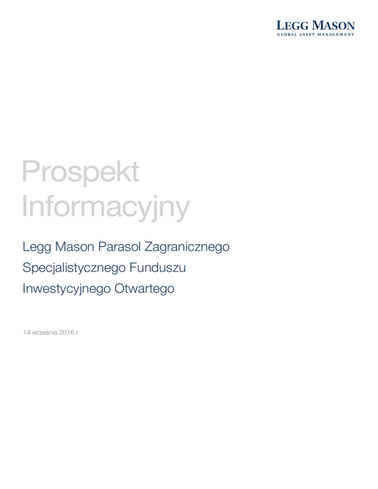 Prospekt Informacyjny Legg Mason Parasol Zagranicznego Specjalistycznego Funduszu Inwestycyjnego Otwartego 14 września 2016 r. Prospekt Informacyjny Legg Mason Parasol Zagranicznego Specjalistycznego Funduszu Inwestycyjnego Otwartego Fundusz działa pod nazwą Legg Mason Parasol Zagraniczny Specjalistyczny Fundusz Inwestycyjny Otwarty. Fundusz może używać skróconych nazw: Legg Mason Parasol Zagraniczny SFIO, LM Parasol Zagraniczny SFIO, Legg Mason Parasol Zagraniczny, LM Parasol Zagraniczny, Legg Mason Zagraniczny, LM Zagraniczny SFIO lub Legg Mason Zagraniczny SFIO oraz odpowiedników tych nazw w językach obcych, w tym odpowiedników w języku angielskim Legg Mason Umbrella Foreign Specialized Open-End Investment Fund, Legg Mason Umbrella Foreign SOEIF, LM Umbrella Foreign SOEIF, LM Umbrella Foreign, Legg Mason Umbrella Foreign, Legg Mason Foreign, Legg Mason Foreign SOEIF lub LM Foreign SOEIF. Fundusz jest specjalistycznym funduszem inwestycyjnym otwartym z wydzielonymi subfunduszami (dalej odpowiednio „Subfundusz” lub „Subfundusze”): 1. LM Asia Equity Fund, Subfundusz może używać nazw: Legg Mason Asia Equity Fund, Legg Mason Asia Equity, LM Asia Equity, LM Akcji Azjatyckich, Legg Mason Subfundusz Akcji Azjatyckich, LM Subfundusz Akcji Azjatyckich, Legg Mason Akcji Azjatyckich, 2. LM US Aggressive Equity Growth Fund, Subfundusz może używać nazw: Legg Mason US Aggressive Growth Fund, Legg Mason US Aggressive Growth, LM US Aggressive Growth, LM Amerykańskich Spółek Wzrostowych, Legg Mason Subfundusz Amerykańskich Spółek Wzrostowych, LM Subfundusz Amerykańskich SpółekWzrostowych, Legg Mason Amerykańskich SpółekWzrostowych, 3. LM Opportunity Fund, Subfundusz może używać nazwy Legg Mason Opportunity Fund, Legg Mason Opportunity, LM Opportunity, LM Okazji Rynkowych, Legg Mason Subfundusz Okazji Rynkowych, LM Subfundusz Okazji Rynkowych, Legg Mason Okazji Rynkowych, 4. LM US Smaller Companies Fund, Subfundusz może używać nazwy Legg Mason US Smaller Companies Fund, LM US Smaller Companies, LM Małych Spółek Amerykańskich, Legg Mason Subfundusz Małych Spółek Amerykańskich, LM Subfundusz Małych Spółek Amerykańskich, Legg Mason Małych Spółek Amerykańskich, 5. LM GMS FI Fund, Subfundusz może używać nazwy Legg Mason Global Fixed Income Multi Strategy Fund, Legg Mason Global Fixed Income Multi Strategy, LM Global Fixed Income Multi Strategy, LM Globalnych Papierów Dłużnych, Legg Mason Subfundusz Globalnych Papierów Dłużnych, LM Subfundusz Globalnych Papierów Dłużnych, Legg Mason Globalnych Papierów Dłużnych. 6. LM Global Resources Fund, Subfundusz może używać nazwy Legg Mason Global Resources Fund, Legg Mason Global Resources, LM Global Resources, LM Globalnych Zasobów, Legg Mason Subfundusz Globalnych Zasobów, LM Subfundusz Globalnych Zasobów, Legg Mason Globalnych Zasobów. Organem Funduszu jest Legg MasonTowarzystwo Funduszy Inwestycyjnych Spółka Akcyjna z siedzibą w Warszawie i adresem: ul. Bielańska 12, 00-085 Warszawa. Strona internetowa: www.leggmason.pl Fundusz prowadzi działalność zgodnie z prawem wspólnotowym regulującym zasady zbiorowego inwestowania w papiery wartościowe. Niniejszy Prospekt Informacyjny został sporządzony na podstawie art. 220 ustawy z dnia 27 maja 2004 r. o funduszach inwestycyjnych i zarządzaniu alternatywnymi funduszami inwestycyjnymi (Dz. U. z 2014 r., poz. 157 ze zm.) oraz rozporządzenia Ministra Finansów z dnia 22 maja 2013 r. w sprawie prospektu informacyjnego funduszu inwestycyjnego otwartego i specjalistycznego funduszu inwestycyjnego otwartego oraz wyliczania wskaźnika zysku do ryzyka tych funduszy (Dz. U. z 2013 r., poz. 673). Data i miejsce sporządzenia Prospektu: Warszawa, dnia 9 lipca 2015 r. Data sporządzenia ostatniego tekstu jednolitego Prospektu: 14 września 2016 r. Data kolejnych aktualizacji Prospektu: nie dotyczy. –1– Rozdział 1 Osoby odpowiedzialne za informacje zawarte w Prospekcie 1. Firma, siedziba i adres Towarzystwa Firma: Legg MasonTowarzystwo Funduszy Inwestycyjnych Spółka Akcyjna Siedziba: Warszawa Adres: ul. Bielańska 12, 00-085 Warszawa 2. Imiona, nazwiska i funkcje osób fizycznych działających w imieniu Towarzystwa Tomasz Jędrzejczak – Prezes Zarządu JacekTreumann – Członek Zarządu Piotr Rzeźniczak – Członek Zarządu 3. Oświadczenie osób, o których mowa w punkcie 2 Oświadczamy, że informacje zawarte w Prospekcie są prawdziwe i rzetelne oraz nie pomijają żadnych faktów ani okoliczności, których ujawnienie w Prospekcie jest wymagane przepisami Ustawy i Rozporządzenia, a także, że zgodnie z najlepszą wiedzą nie istnieją, poza ujawnionymi w Prospekcie, okoliczności, które mogłyby wywrzeć znaczący wpływ na sytuację prawną, majątkową i finansową Funduszu. Tomasz Jędrzejczak Prezes Zarządu JacekTreumann Członek Zarządu –2– Piotr Rzeźniczak Członek Zarządu Rozdział 2 Dane o Legg Mason Towarzystwie Funduszy Inwestycyjnych S.A. 1. Firma, kraj siedziby, siedziba i adres Towarzystwa wraz z numerami telekomunikacyjnymi, adresem głównej strony internetowej i adresem poczty elektronicznej Firma:Legg Mason Towarzystwo Funduszy Inwestycyjnych Spółka AkcyjnaKraj siedziby:PolskaSiedziba:WarszawaAdres:ul. Bielańska 12, 00-085 WarszawaTelefon:(22) 337 66 00Faks:(22) 337 66 99Adres głównej strony internetowej:www.leggmason.pl Adres poczty elektronicznej: 2. Data zezwolenia na wykonywanie działalności przez Towarzystwo Komisja Papierów Wartościowych i Giełd w dniu 18 czerwca 1998 r. wydała decyzję nr DFN–409/5–9/98–151 dotyczącą udzielenia Bankowi Handlowemu w Warszawie S.A. zezwolenia na utworzenieTowarzystwa. 3. Oznaczenie sądu rejestrowego i numer, pod którym Towarzystwo jest zarejestrowane, a także data wpisu do rejestru Sąd Rejonowy dla m. st. Warszawy w Warszawie XIX (obecnie XII) Wydział Gospodarczy Krajowego Rejestru Sądowego postanowieniem z 26 lutego 2001 r. dokonał wpi