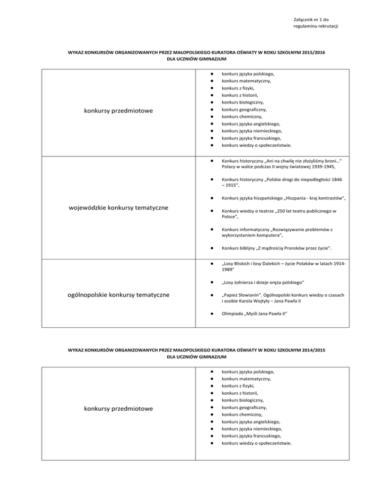 Załącznik nr 1 do regulaminu rekrutacji WYKAZ KONKURSÓW ORGANIZOWANYCH PRZEZ MAŁOPOLSKIEGO KURATORA OŚWIATY W ROKU SZKOLNYM 2015/2016 DLA UCZNIÓW GIMNAZJUM konkurs języka polskiego, konkurs matematyczny, konkurs z fizyki, konkurs z historii, konkurs biologiczny, konkursy przedmiotowe konkurs geograficzny, konkurs chemiczny, konkurs języka angielskiego, konkurs języka niemieckiego, konkurs języka francuskiego, konkurs wiedzy o społeczeostwie. Konkurs historyczny „Ani na chwilę nie złożyliśmy broni…” Polacy w walce podczas II wojny światowej 1939-1945, Konkurs historyczny „Polskie drogi do niepodległości 1846 – 1915”, Konkurs języka hiszpaoskiego „Hiszpania - kraj kontrastów”, wojewódzkie konkursy tematyczne Konkurs wiedzy o teatrze „250 lat teatru publicznego w Polsce”, Konkurs informatyczny „Rozwiązywanie problemów z wykorzystaniem komputera”, Konkurs biblijny „Z mądrością Proroków przez życie”. „Losy Bliskich i losy Dalekich – życie Polaków w latach 19141989” „Losy żołnierza i dzieje oręża polskiego” ogólnopolskie konkursy tematyczne „Papież Słowianin”. Ogólnopolski konkurs wiedzy o czasach i osobie Karola Wojtyły – Jana Pawła II Olimpiada „Myśli Jana Pawła II” WYKAZ KONKURSÓW ORGANIZOWANYCH PRZEZ MAŁOPOLSKIEGO KURATORA OŚWIATY W ROKU SZKOLNYM 2014/2015 DLA UCZNIÓW GIMNAZJUM konkurs języka polskiego, konkurs matematyczny, konkurs z fizyki, konkurs z historii, konkurs biologiczny, konkursy przedmiotowe konkurs geograficzny, konkurs chemiczny, konkurs języka angielskiego, konkurs języka niemieckiego, konkurs języka francuskiego, konkurs wiedzy o społeczeostwie. Konkurs historyczny „Ani na chwilę nie złożyliśmy broni…” Polacy w walce podczas II wojny światowej 1939-1945, Konkurs historyczny „Polskie drogi do niepodległości 1846 – 1915”, Konkurs języka hiszpaoskiego „Hiszpania - kraj kontrastów”, wojewódzkie konkursy tematyczne Konkurs wiedzy o teatrze „250 lat teatru publicznego w Polsce”, Konkurs informatyczny „Rozwiązywanie problemów z wykorzystaniem komputera”, Konkurs biblijny „Z mądrością Proroków przez życie”. IV edycja ogólnopolskiego Konkursu „Losy Bliskich i Dalekich – życie Polaków w latach 1914-1989” w roku szkolnym2014/2015, „Papież Słowianin”. Ogólnopolski konkurs wiedzy o czasach i osobie Karola Wojtyły – Jana Pawła II, ponadwojewódzkie konkursy tematyczne Ogólnopolski Konkurs Historyczny im. majora Marka Gajewskiego „Losy żołnierza i dzieje oręża polskiego w latach 972-1514. „Od Cedyni do Orszy” WYKAZ KONKURSÓW ORGANIZOWANYCH PRZEZ MAŁOPOLSKIEGO KURATORA OŚWIATY W ROKU SZKOLNYM 2013/2014 DLA UCZNIÓW GIMNAZJUM konkurs języka polskiego, konkurs matematyczny, konkurs z fizyki, konkurs z historii, konkurs biologiczny, konkursy przedmiotowe konkurs geograficzny, konkurs chemiczny, konkurs języka angielskiego, konkurs języka niemieckiego, konkurs języka francuskiego, konkurs wiedzy o społeczeostwie, konkurs informatyczny, konkurs biblijny. „Taki to mroczny czas… 70 rocznica Powstanie Warszawskiego”, wojewódzkie konkursy tematyczne „Stulecie czynu legionowego – drogi do niepodległości 1863-1918. Bohaterowie, wydarzenia, miejsca”, Konkurs języka hiszpaoskiego „ Hiszpania – kraj, ludzie i ich zwyczaje” Ogólnopolski Konkursu „Losy Bliskich i Dalekich – życie Polaków w latach 1914-1989”, ponadwojewódzkie konkursy tematyczne „Losy żołnierza i dzieje oręża polskiego w latach 1914-1950. Od strzelców i legionistów do żołnierzy wyklętych” Ogólnopolski Konkurs Wiedzy o czasach i osobie Karola Wojtyły – Jana Pawła II „Papież Słowianin” WYKAZ DYSCYPLIN SPORTOWYCH UWZGLĘDNIANYCH W PROCESIE REKRUTACJI DO SZKÓŁ PONADGIMNAZJALNYCH Dyscypliny indywidualne: akrobatyka sportowa, badminton, biathlon, biathlon letni, bieg na orientację, biegi przełajowe, boks, bowling sportowy, brydż sportowy, futbol flagowy, futbol amerykaoski, gimnastyka artystyczna, gimnastyka sportowa, jeździectwo, judo, kajakarstwo, karate tradycyjne, karate WKF, kolarstwo szosowe, kolarstwo torowe, kolarstwo górskie, kręglarstwo, lekkoatletyka, łucznictwo, łyżwiarstwo figurowe, łyżwiarstwo szybkie, łyżwiarstwo szybkie – short track, narciarstwo alpejskie, narciarstwo klasyczne (biegi, skoki, kombinacja norweska), pięciobój nowoczesny, pływanie, pływanie synchroniczne, podnoszenie ciężarów, saneczkarstwo, skoki do wody, snowboard, sport kartingowy, strzelectwo sportowe, szachy, szermierka, wushu tradycyjne, taekwon – do ITF, taekwon – do WAF, taniec sportowy, tenis, tenis stołowy, triathlon, wioślarstwo, wspinaczka sportowa, zapasy styl klasyczny, zapasy styl wolny, żeglarstwo, żeglarstwo lodowe, modelarstwo kołowe. Gry zespołowe: baseball, golf, hokej na lodzie, hokej na trawie, kajak polo, koszykówka, piłka nożna, piłka ręczna, piłka siatkowa, piłka siatkowa plażowa, piłka wodna, psie zaprzęgi, rugby, unihokej. Uwaga. W przypadku, gdy dyscyplina sportu nie jest umieszczona w w/w wykazie, a absolwent gimnazjum legitymuje się odpowiednim dokumentem potwierdzającym uzyskanie osiągnięć sportowych, szkolne komisje rekrutacyjno – kwalifikacyjne decydują o uwzględnieniu tej dyscypliny sportu w procesie rekrutacji.