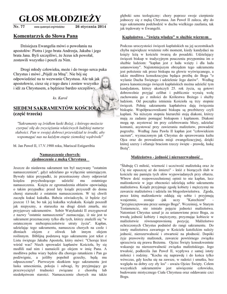 GŁOS MŁODZIEŻY Nr. 77 www.queenpol.org/mlodziez 26 stycznia 2014 Komentarzyk do Słowa Pana Dzisiejsza Ewangelia mówi o powołaniu na apostołów: Piotra i jego brata Andrzeja, Jakuba i jego brata Jana. Byli szczęśliwi, że Jezus ich powołał, zostawili wszystko i poszli za Nim. Drogi młody człowieku, może i do twego serca puka Chrystus i mówi „Pójdź za Mną”. Nie bój się odpowiedzieć na to wezwanie Chrystusa. Ale tak jak apostołowie, ciesz się z tego daru i zostaw wszystko i idź za Chrystusem, a będziesz bardzo szczęśliwy. ks. Karol SIEDEM SAKRAMENTÓW KOŚCIOŁA (część trzecia) "Sakramenty są źródłem łaski Bożej, z którego możecie czerpać siłę do zwyciężania właściwych ludzkiej naturze słabości. Pan w swojej dobroci przewidział te środki, aby wspomagać nas na każdym etapie ziemskiej wędrówki" bł. Jan Paweł II, 17.V.1988 roku, Mariscal Estigarribia głęboki sens teologiczny: chory poprzez swoje cierpienie jednoczy się z męką Chrystusa. Jan Paweł II zaleca, aby do tego sakramentu podchodzić w duchu wielkiego zaufania, tak jak trędowaty w Ewangelii. Kapłaństwo - "święta władza" w służbie wiernym Podczas uroczystości święceń kapłańskich na jej uczestnikach chyba największe wrażenie robi moment, kiedy kandydaci na księży leżą w kościele twarzą do posadzki. Udzielający święceń biskup w tradycyjnym pouczeniu przypomina im o służbie ludziom: "kapłan jest z ludu wzięty i dla ludu ustanowiony". Najistotniejszym obrzędem tego sakramentu jest położenie rak przez biskupa na głowie wyświęcanego, a także modlitwa konsekracyjna będąca prośbą do Boga "o wylanie Ducha Świętego i udzielenie Jego darów". Według prawa kanonicznego święceń kapłańskich można udzielić tym kandydatom, którzy ukończyli 25. rok życia, są gotowi dobrowolnie przyjąć celibat i publicznie wyrażą wolę zachowania go z miłości do Królestwa Bożego i służby ludziom. Od początku istnienia Kościoła są trzy stopnie święceń. Pełnię sakramentu kapłaństwa dają święcenia biskupie. Współpracownikami biskupa są prezbiterzy czyli kapłani. Na niższym stopniu hierarchii stoją diakoni, którzy mają za zadanie pomagać biskupom i kapłanom. Diakoni mogą np. asystować im przy celebrowaniu Mszy, udzielać komunii, asystować przy zawieraniu małżeństw, prowadzić pogrzeby. Według Jana Pawła II kapłan jest "człowiekiem sacrum", wyznaczonym jak Chrystus do sprawowania kultu Ojca oraz do prowadzenia misji ewangelizacyjnej, dzięki której szerzy i ofiaruje braciom rzeczy święte - prawdę, łaskę Bożą". Namaszczenie chorych: zjednoczenie z męką Chrystusa Małżeństwo - jedność i nierozerwalność Jeszcze do niedawna sakrament ten był nazywany "ostatnim namaszczeniem", gdyż udzielano go wyłącznie umierającym. Bywały takie przypadki, że przestraszony chory odprawiał księdza przychodzącego udzielić mu ostatniego namaszczenia. Księża ze zgromadzenia oblatów opowiadają o takim przypadku: przed laty ksiądz przyszedł do domu chorej staruszki z ostatnim namaszczeniem. W tej chwili zaczęła kukać kukułka. Babcia oświadczyła, iż będzie żyć jeszcze 13 lat, bo tak jej kukułka wykukała. Ksiądz poszedł jak niepyszny, a staruszka na drugi dzień zmarła, nie przyjąwszy sakramentów. Sobór Watykański II zrezygnował z nazwy "ostatnie namaszczenie" zaznaczając, iż nie jest to sakrament przeznaczony tylko dla tych, którzy znaleźli się "w ostatecznym niebezpieczeństwie utraty życia". Kapłan, udzielając tego sakramentu, namaszcza chorych na czole i dłoniach olejem z oliwek lub innym olejem roślinnym. Biblijną podstawą tego sakramentu jest tekst z Listu świętego Jakuba Apostoła, który mówi: "Choruje ktoś wśród was? Niech sprowadzi kapłanów Kościoła, by się modlili nad nim i namaścili go olejem w imię Pana. A modlitwa pełna wiary będzie dla chorego ratunkiem i Pan go podźwignie, a jeśliby popełnił grzechy, będą mu odpuszczone". Pierwszym skutkiem tego sakramentu jest łaska umocnienia, pokoju i odwagi, by przyjmujący go przezwyciężył trudności związane z chorobą lub niedołęstwem starości. Namaszczenie chorych ma także "Ślubuję Ci miłość, wierność i uczciwość małżeńską oraz że Cię nie opuszczę aż do śmierci" - któż z biorących ślub w kościele nie pamięta tych słów wypowiadanych przy ołtarzu. Wbrew dość rozpowszechnionej opinii to nie kapłan, lecz małżonkowie w jego obecności udzielają sobie sakramentu małżeństwa. Ksiądz przyjmuje zgodę kobiety i mężczyzny na zawarcie małżeństwa i udziela im błogosławieństwa. Zgoda, przez którą małżonkowie oddają się sobie i przyjmują wzajemnie, zostaje -jak uczy "Katechizm" "przypieczętowana przez samego Boga". Wcześniej, w Starym Testamencie, nie istniało pojęcie jedności małżeństwa. Natomiast Chrystus uznał je za ustanowione przez Boga, za trwałą jedność kobiety i mężczyzny, przyznając kobiecie w małżeństwie równouprawnioną pozycję. Małżeństwo ochrzczonych Chrystus podniósł do rangi sakramentu. Do istoty małżeństwa zawartego w Kościele katolickim należy jedność, nierozerwalność i otwartość na płodność. Dopóki żyje prawowity małżonek, zawarcie powtórnego związku sprzeciwia się prawu Bożemu. Ojciec Święty konsekwentnie wskazuje na nierozerwalność związku małżeńskiego. Jego trwałość, podkreśla Jan Paweł II, wypływa z samej istoty miłości i rodziny. "Kocha się naprawdę i do końca tylko wówczas, gdy kocha się na zawsze, w radości i smutku, bez względu na dobry czy zły los" - uważa Ojciec Święty. Celem wszystkich sakramentów jest uświęcenie człowieka, budowanie mistycznego Ciała Chrystusa oraz oddawanie czci Bogu.