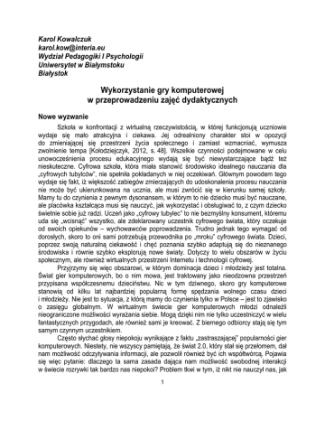 Karol Kowalczuk [email protected] Wydział Pedagogiki I Psychologii Uniwersytet w Białymstoku Białystok Wykorzystanie gry komputerowej w przeprowadzeniu zajęć dydaktycznych Nowe wyzwanie Szkoła w konfrontacji z wirtualną rzeczywistością, w której funkcjonują uczniowie wydaje się mało atrakcyjna i ciekawa. Jej odrealniony charakter stoi w opozycji do zmieniającej się przestrzeni życia społecznego i zamiast wzmacniać, wymusza zwolnienie tempa [Kołodziejczyk, 2012, s. 48]. Wszelkie czynności podejmowane w celu unowocześnienia procesu edukacyjnego wydają się być niewystarczające bądź też nieskuteczne. Cyfrowa szkoła, która miała stanowić środowisko idealnego nauczania dla „cyfrowych tubylców”, nie spełniła pokładanych w niej oczekiwań. Głównym powodem tego wydaje się fakt, iż większość zabiegów zmierzających do udoskonalenia procesu nauczania nie może być ukierunkowana na ucznia, ale musi zwrócić się w kierunku samej szkoły. Mamy tu do czynienia z pewnym dysonansem, w którym to nie dziecko musi być nauczane, ale placówka kształcąca musi się nauczyć, jak wykorzystać i obsługiwać to, z czym dziecko świetnie sobie już radzi. Uczeń jako „cyfrowy tubylec” to nie bezmyślny konsument, któremu uda się „wcisnąć” wszystko, ale zdeklarowany uczestnik cyfrowego świata, który oczekuje od swoich opiekunów – wychowawców poprowadzenia. Trudno jednak tego wymagać od dorosłych, skoro to oni sami potrzebują przewodnika po „mroku” cyfrowego świata. Dzieci, poprzez swoją naturalną ciekawość i chęć poznania szybko adaptują się do nieznanego środowiska i równie szybko eksplorują nowe światy. Dotyczy to wielu obszarów w życiu społecznym, ale również wirtualnych przestrzeni Internetu i technologii cyfrowej. Przyjrzymy się więc obszarowi, w którym dominacja dzieci i młodzieży jest totalna. Świat gier komputerowych, bo o nim mowa, jest traktowany jako nieodzowna przestrzeń przypisana współczesnemu dzieciństwu. Nic w tym dziwnego, skoro gry komputerowe stanowią od kilku lat najbardziej popularną formę spędzania wolnego czasu dzieci i młodzieży. Nie jest to sytuacja, z którą mamy do czynienia tylko w Polsce – jest to zjawisko o zasięgu globalnym. W wirtualnym świecie gier komputerowych młodzi odnaleźli nieograniczone możliwości wyrażania siebie. Mogą dzięki nim nie tylko uczestniczyć w wielu fantastycznych przygodach, ale również sami je kreować. Z biernego odbiorcy stają się tym samym czynnym uczestnikiem. Często słychać głosy niepokoju wynikające z faktu „zastraszającej” popularności gier komputerowych. Niestety, nie wszyscy pamiętają, że świat 2.0, który stał się przełomem, dał nam możliwość odczytywania informacji, ale pozwolił również być ich współtwórcą. Pojawia się więc pytanie: dlaczego ta sama zasada dająca nam możliwość swobodnej interakcji w świecie rozrywki tak bardzo nas niepokoi? Problem tkwi w tym, iż nikt nie nauczył nas, jak 1 poprawnie i bezpiecznie się w nim poruszać. Musimy zdać sobie sprawę, że nie naprawimy tej sytuacji stając z boku. Zademonstrowanie, jak właściwie korzystać ze wszystkich dobrodziejstw, które daje nam współczesny cyfrowy świat, pozwoli ukazać, że oprócz zabawy, gry mogą być również źródłem wiedzy. Drzemiący w nich olbrzymi potencjał może być wykorzystany w edukacji równie skutecznie, jak w świecie rozrywki. Nie ma co się spierać i walczyć z grami, mówiąc jakie szkody mogą wyrządzić odbiorcom. Na takie dyskusje był czas kilkanaście lat temu. Dzisiaj powinniśmy postawić pytanie w inny sposób: nie jak walczyć, ale jak dobrze wykorzystać coś, czego już nie zatrzymamy? Paradoks polega jednak na tym, iż to, co zadecydowało o popularności gier w obszarze rozrywki, odpowiednio wykorzystane może przesądzić o ich sukcesie w edukacji. Jak skutecznie wykorzystać grę? Przejście świata rozrywki do świata nauki bądź też wzajemne przenikanie się tych dwóch przestrzeni może wydawać się niemożliwe. Jednak rzekome przeszkody wynikające z tego połączenia można wyeliminować. Bardzo ważne jest pamiętanie o cechach, które przesądziły o popularności gier, ale również istotne jest odpowiednie wprowadzenie ich do celów dydaktycznych. Funkcje gier, dzięki którym możliwe jest ich wykorzystanie w obszarze edukacyjnym są następujące: 1. Motywują użytkownika rozgrywki, stanowiąc atrakcyjne tło psychologiczne nauczania. Jest to bardzo ważne i przydatne przy pracy z młodymi uczniami, którzy posiadają większy stopień emocjonalnej identyfikacji z grami niż z edukacją. 2. Symulują realne sytuacje. Mogą one imitować doświadczenie, a przez ten fakt dostarczać możliwość przećwiczenia umiejętności o charakterze praktycznym. Nawet, jeśli stworzenie takiej sytuacji w rzeczywistości wiązałoby się z pewnym niebezpieczeństwem (np. w przypadku gier strategicznych i symulatorów lotu). 3. Ułatwiają zoperacjonalizowanie pewnych struktur teoretycznych, dzięki intuicyjnym środkom strategii pochodzącej z gier [Bołtuć, 2004]. W celu skutecznego wykorzystania gry komputerowej na lekcji należy rozpatrzeć dwa aspekty. Pierwszy, dotyczący umiejętności uczniów i możliwości środków technicznych, drugi natomiast odnoszący się do celu gry. Wśród tych pierwszych można wymienić przeszkody związane z organizacją pracy w klasie, jak również te, związane z indywidualnymi predyspozycjami uczniów. Wydaje się, że mogą to być problemy podobne do tych, które napotyka się, stosując grę dydaktyczną na zajęciach. Cytując za Ewą RackąKoluch możemy do nich zaliczyć: 1. brak akceptacji takiej formy nauki przez wszystkich uczniów; 2. dominacja lepszych i bardziej aktywnych uczniów w niektórych zadaniach; 3. brak kontroli nad pracą niektórych uczniów; 4. czaso- i pracochłonne przygotowania, co może przełoży