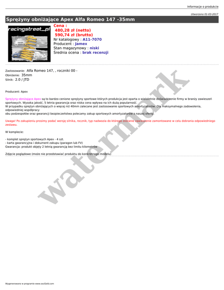 Informacje o produkcie Utworzono 01-03-2017 Sprężyny obniżające Apex Alfa Romeo 147 -35mm Cena : 480,28 zł (netto) 590,74 zł (brutto) Nr katalogowy : A11-7070 Producent : Jamex Stan magazynowy : niski Średnia ocena : brak recenzji Alfa Romeo 147, , roczniki 00 35mm Silnik: 2.0 / JTD Zastosowanie: er m ar k Obniżenie: Producent: Apex Sprężyny obniżające Apex są to bardzo cenione sprężyny sportowe których produkcja jest oparta o wieloletnie doświadczenie firmy w branży zawieszeń sportowych. Wysoka jakość, 5 letnia gwarancja oraz niska cena wpływa na ich dużą popularność. W przypadku sprężyn obniżających o więcej niż 40mm zalecane jest zastosowanie sportowych amortyzatorów. Dla maksymalnego zadowolenia, odpowiedniej współpracy obu podzespołów oraz gwarancji bezpieczeństwa polecamy zakup sportowych amortyzatorów z naszej oferty. Uwaga! Po zakupieniu prosimy podać wersję silnika, rocznik, typ nadwozia do którego zostanie zawieszenie zamontowane w celu dobrania odpowiedniego zestawu. W komplecie: - komplet sprężyn sportowych Apex - 4 szt. - karta gwarancyjna i dokument zakupu (paragon lub FV) Gwarancja: produkt objęty 2 letnią gwarancją bez limitu kilometrów w at Zdjęcie poglądowe (może nie przedstawiać produktu do konkretnego modelu) Wygenerowano w programie www.oscGold.com
