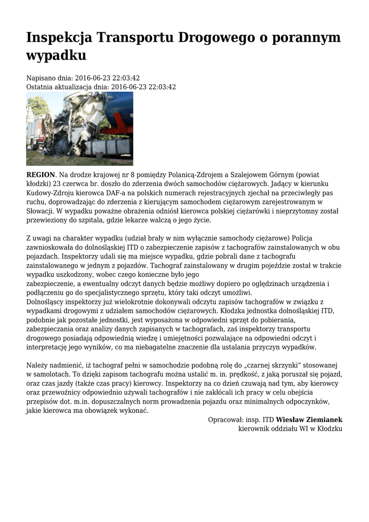 Inspekcja Transportu Drogowego o porannym wypadku Napisano dnia: 2016-06-23 22:03:42 Ostatnia aktualizacja dnia: 2016-06-23 22:03:42 REGION. Na drodze krajowej nr 8 pomiędzy Polanicą-Zdrojem a Szalejowem Górnym (powiat kłodzki) 23 czerwca br. doszło do zderzenia dwóch samochodów ciężarowych. Jadący w kierunku Kudowy-Zdroju kierowca DAF-a na polskich numerach rejestracyjnych zjechał na przeciwległy pas ruchu, doprowadzając do zderzenia z kierującym samochodem ciężarowym zarejestrowanym w Słowacji. W wypadku poważne obrażenia odniósł kierowca polskiej ciężarówki i nieprzytomny został przewieziony do szpitala, gdzie lekarze walczą o jego życie. Z uwagi na charakter wypadku (udział brały w nim wyłącznie samochody ciężarowe) Policja zawnioskowała do dolnośląskiej ITD o zabezpieczenie zapisów z tachografów zainstalowanych w obu pojazdach. Inspektorzy udali się ma miejsce wypadku, gdzie pobrali dane z tachografu zainstalowanego w jednym z pojazdów. Tachograf zainstalowany w drugim pojeździe został w trakcie wypadku uszkodzony, wobec czego konieczne było jego zabezpieczenie, a ewentualny odczyt danych będzie możliwy dopiero po oględzinach urządzenia i podłączeniu go do specjalistycznego sprzętu, który taki odczyt umożliwi. Dolnośląscy inspektorzy już wielokrotnie dokonywali odczytu zapisów tachografów w związku z wypadkami drogowymi z udziałem samochodów ciężarowych. Kłodzka jednostka dolnośląskiej ITD, podobnie jak pozostałe jednostki, jest wyposażona w odpowiedni sprzęt do pobierania, zabezpieczania oraz analizy danych zapisanych w tachografach, zaś inspektorzy transportu drogowego posiadają odpowiednią wiedzę i umiejętności pozwalające na odpowiedni odczyt i interpretację jego wyników, co ma niebagatelne znaczenie dla ustalania przyczyn wypadków. Należy nadmienić, iż tachograf pełni w samochodzie podobną rolę do „czarnej skrzynki” stosowanej w samolotach. To dzięki zapisom tachografu można ustalić m. in. prędkość, z jaką poruszał się pojazd, oraz czas jazdy (także czas pracy) kierowcy. Inspektorzy na co dzień czuwają nad tym, aby kierowcy oraz przewoźnicy odpowiednio używali tachografów i nie zakłócali ich pracy w celu obejścia przepisów dot. m.in. dopuszczalnych norm prowadzenia pojazdu oraz minimalnych odpoczynków, jakie kierowca ma obowiązek wykonać. Opracował: insp. ITD Wiesław Ziemianek kierownik oddziału WI w Kłodzku