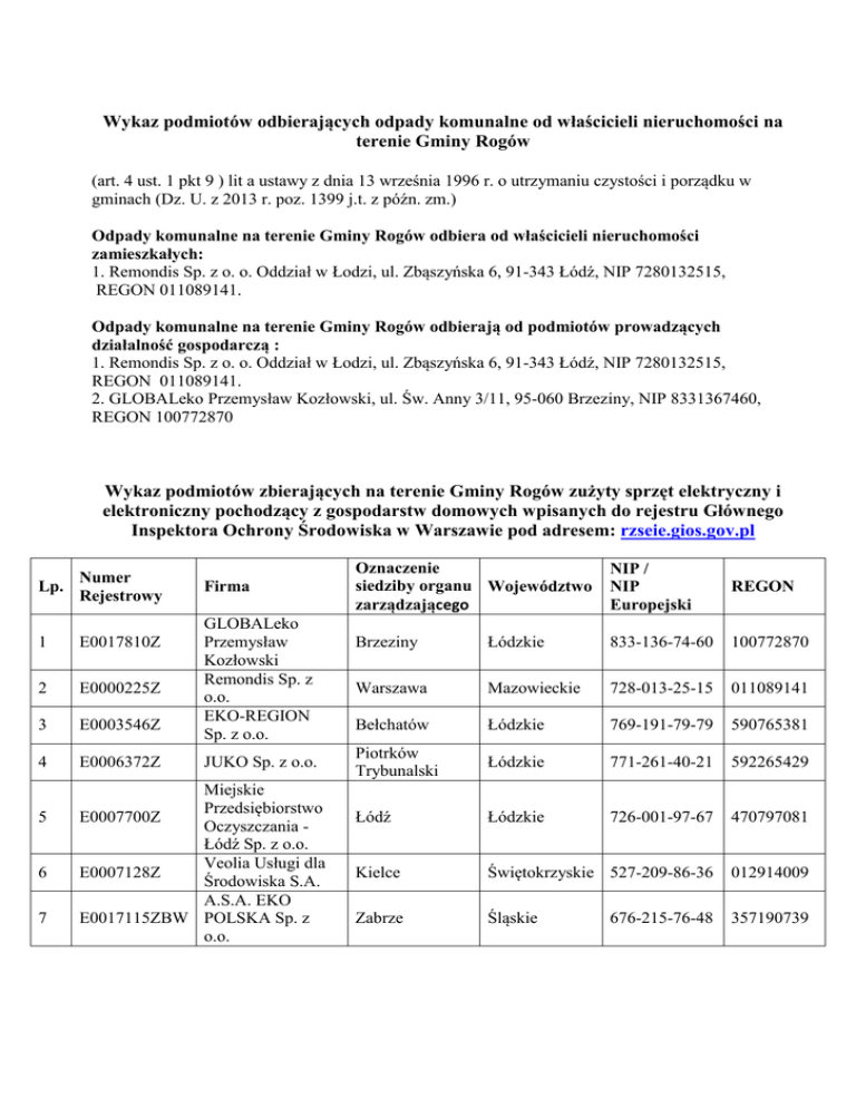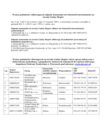 Wykaz podmiotów odbierających odpady komunalne od właścicieli nieruchomości na terenie Gminy Rogów (art. 4 ust. 1 pkt 9 ) lit a ustawy z dnia 13 września 1996 r. o utrzymaniu czystości i porządku w gminach (Dz. U. z 2013 r. poz. 1399 j.t. z późn. zm.) Odpady komunalne na terenie Gminy Rogów odbiera od właścicieli nieruchomości zamieszkałych: 1. Remondis Sp. z o. o. Oddział w Łodzi, ul. Zbąszyńska 6, 91-343 Łódź, NIP 7280132515, REGON 011089141. Odpady komunalne na terenie Gminy Rogów odbierają od podmiotów prowadzących działalność gospodarczą : 1. Remondis Sp. z o. o. Oddział w Łodzi, ul. Zbąszyńska 6, 91-343 Łódź, NIP 7280132515, REGON 011089141. 2. GLOBALeko Przemysław Kozłowski, ul. Św. Anny 3/11, 95-060 Brzeziny, NIP 8331367460, REGON 100772870 Wykaz podmiotów zbierających na terenie Gminy Rogów zużyty sprzęt elektryczny i elektroniczny pochodzący z gospodarstw domowych wpisanych do rejestru Głównego Inspektora Ochrony Środowiska w Warszawie pod adresem: rzseie.gios.gov.pl Numer Lp. Rejestrowy 1 E0017810Z 2 E0000225Z 3 E0003546Z 4 E0006372Z 5 6 7 Firma GLOBALeko Przemysław Kozłowski Remondis Sp. z o.o. EKO-REGION Sp. z o.o. JUKO Sp. z o.o. Miejskie Przedsiębiorstwo E0007700Z Oczyszczania Łódź Sp. z o.o. Veolia Usługi dla E0007128Z Środowiska S.A. A.S.A. EKO E0017115ZBW POLSKA Sp. z o.o. Oznaczenie siedziby organu Województwo zarządzającego NIP / NIP Europejski REGON Brzeziny Łódzkie 833-136-74-60 100772870 Warszawa Mazowieckie 728-013-25-15 011089141 Bełchatów Łódzkie 769-191-79-79 590765381 Piotrków Trybunalski Łódzkie 771-261-40-21 592265429 Łódź Łódzkie 726-001-97-67 470797081 Kielce Świętokrzyskie 527-209-86-36 012914009 Zabrze Śląskie 357190739 676-215-76-48 Wykaz podmiotów zbierających na terenie Gminy Rogów zużyte baterie i akumulatorki: 1. Zespół Szkół w Rogowie, ul. Szkolna 1, 95-063 Rogów 2. Szkoła Podstawowa w Przyłęku Dużym, Przyłęk Duży 49, 95-063 Rogów 3. Szkoła Podstawowa w Wągrach, Wągry 87, 95-063 Rogów 4. Urząd Gminy w Rogowie, ul. Żeromskiego 23, 95-063 Rogów Wykaz podmiotów zbierających przeterminowane leki: 1. Apteka „Św. Antoniego”, ul. Dworcowa 2, 95-063 Rogów 2. Apteka Melissa, ul. Wojska Polskiego 15, 95-063 Rogów Wykaz miejsc zagospodarowania zmieszanych odpadów komunalnych, odpadów zielonych oraz pozostałości z sortowania odpadów przeznaczonych do składowania: Zmieszane odpady komunalne odbierane z terenu Gminy Rogów trafiają do: Zakładu Gospodarowania Odpadami Pukinin 140, 96-200 Rawa Mazowiecka. Pozostałości z sortowania odpadów komunalnych przeznaczonych do składowania i odpady zielone transportowane są na kompostownie w: PGK Sp. z o. o. Radomsko, instalacja w Płoszowie. Poziomy recyklingu, przygotowania do ponownego użycia i odzysku innymi metodami niektórych frakcji odpadów komunalnych, osiągnięte przez Gminę Rogów Zapisy art. 3b oraz 3cu.c.p.g. obligują gminy do ograniczenia masy odpadów komunalnych ulegających biodegradacji przekazywanych do składowania, oraz do osiągnięcia poziomów recyklingu, przygotowania do ponownego użycia i odzysku innymi metodami niektórych frakcji odpadów komunalnych. Rok 2013 był rokiem przełomowym dla gospodarki odpadami na terenie Gminy Rogów. Do 1 lipca 2013 r. obowiązywał stary system gospodarowania odpadami komunalnymi, oparty na umowach zawieranych z dobrowolnie wybranymi podmiotami zajmującymi się odbiorem odpadów komunalnych z terenu Gminy Rogów. Poziom, który musiał zostać osiągnięty w roku 2013 wynosił 50%. Gmina Rogów osiągnęła poziom ograniczenia w wysokości 77% - poziom nie został osiągnięty. Poziom, który musiał zostać osiągnięty w 2014 r. wynosi nie więcej niż 50% (Pr). Gmina Rogów osiągnęła poziom ograniczenia w wysokości 35,4% (Tr < Pr) i tym samym osiągnęła w danym roku rozliczeniowym wskazany poziom ograniczenia masy odpadów komunalnych ulegających biodegradacji (poziom zostanie osiągnięty jeżeli Tr=Pr albo Tr<Pr). Natomiast zgodnie z Rozporządzeniem Ministra Środowiska z dnia 29 maja 2012 r. w sprawie poziomów recyklingu, przygotowania do ponownego użycia i odzysku innymi metodami niektórych frakcji odpadów komunalnych (Dz. U. z 2012 r. poz. 645), poziom recyklingu i przygotowania do ponownego użycia papieru, tworzyw sztucznych i szkła dla 2014r. wynosi 14%. Osiągnięty przez Gminę Rogów poziom recyklingu i przygotowania do ponownego użycia ww. frakcji odpadów wynosi 42,6%. Gmina Rogów osiągnęła wymagany poziom recyklingu. Zgodnie z Rozporządzeniem Ministra Środowiska z dnia 29 maja 2012 r. w sprawie poziomów recyklingu, przygotowania do ponownego użycia i odzysku innymi metodami niektórych frakcji odpadów komunalnych (Dz. U. z 2012 r. poz. 645), poziom recyklingu i przygotowania do ponownego użycia papieru, tworzyw sztucznych i szkła dla roku 2013 wynosił 12%. Osiągnięty przez Gminę Rogów poziom recyklingu i przygotowania do ponownego użycia ww. frakcji odpadów wynosi 17% poziom został osiągnięty. Natomiast w roku 2014r. wynosił 14%. Osiągnięty przez Gminę Rogów poziom recyklingu i przygotowania do ponownego użycia ww. frakcji odpadów wynosi 42,6%. Gmina Rogów osiągnęła wymagany poziom recyklingu.