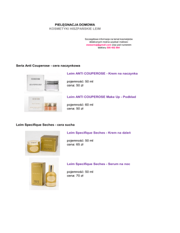 PIELĘGNACJA DOMOWA KOSMETYKI HISZPAŃSKIE LEIM Szczegółowe informacje na temat kosmetyków detalicznych można uzyskać mailowo: [email protected] oraz pod numerem telefonu 508 492 964 Seria Anti Couperose - cera naczynkowa Leim ANTI COUPEROSE - Krem na naczynka pojemność: 50 ml cena: 50 zł Leim ANTI COUPEROSE Make Up - Podkład pojemność: 60 ml cena: 50 zł Leim Specifique Seches - cera sucha Leim Specifique Seches - Krem na dzień pojemność: 50 ml cena: 65 zł Leim Specifique Seches - Serum na noc pojemność: 50 ml cena: 70 zł Leim Sayonara - cera mieszana, tłusta, trądzikowa Leim Sayonara Krem pojemność: 50 ml cena: 50 zł Leim Retinol Royal Q10 Defence - cera dojrzała Leim Retinol Royal Defence Serum pojemność: 50 ml cena: 79 zł Leim Retinol Royal Defence Krem pojemność: 60 ml cena: 75 zł Leim Retinol Royal Defence Pearls - kapsułki pojemność: 50 x 1ml cena: 105 zł brak zdjęcia Leim Retinol Royal Q10 Personal Phase Krem pojemność: 50 ml cena: 69 zł Leim Sublime - seria kolagenowa (cera sucha, dojrzała) Leim Sublime Day Cream - Kolagenowy krem do twarzy i szyi pojemność: 50 ml cena: 85 zł Leim Sublime Eye Serum - Kolagenowe serum pod oczy pojemność: 20 ml cena: 79 zł Leim Diamant - seria diamentowa 40+ Leim Diamant Cream - diamentowy krem przeciwzmarszczkowy pojemność: 50 ml cena: 109 zł Leim Diamant Peeling - diamentowy peeling do twarzy pojemność: 50 ml cena: 85 zł Leim - produkty uzupełniające do twarzy Leim Beauty Secret Oil - esencja przeciwzmarszczkowa z płatków róż pojemność: 50 ml cena: 75 zł Leim HID-2 - krem nawilżająco - matujący pojemność: 250 ml cena: 109 zł Leim Star Vitamin A+E+C - krem witaminowy pojemność: 60 ml cena: 69 zł Leim Snail's Extract - Krem mocno regenerujący ze śluzem ślimaka pojemność: 60 ml cena: 85 zł Leim Eye Cream - Odżywczy krem pod oczy pojemność: 15 ml cena: 55 zł