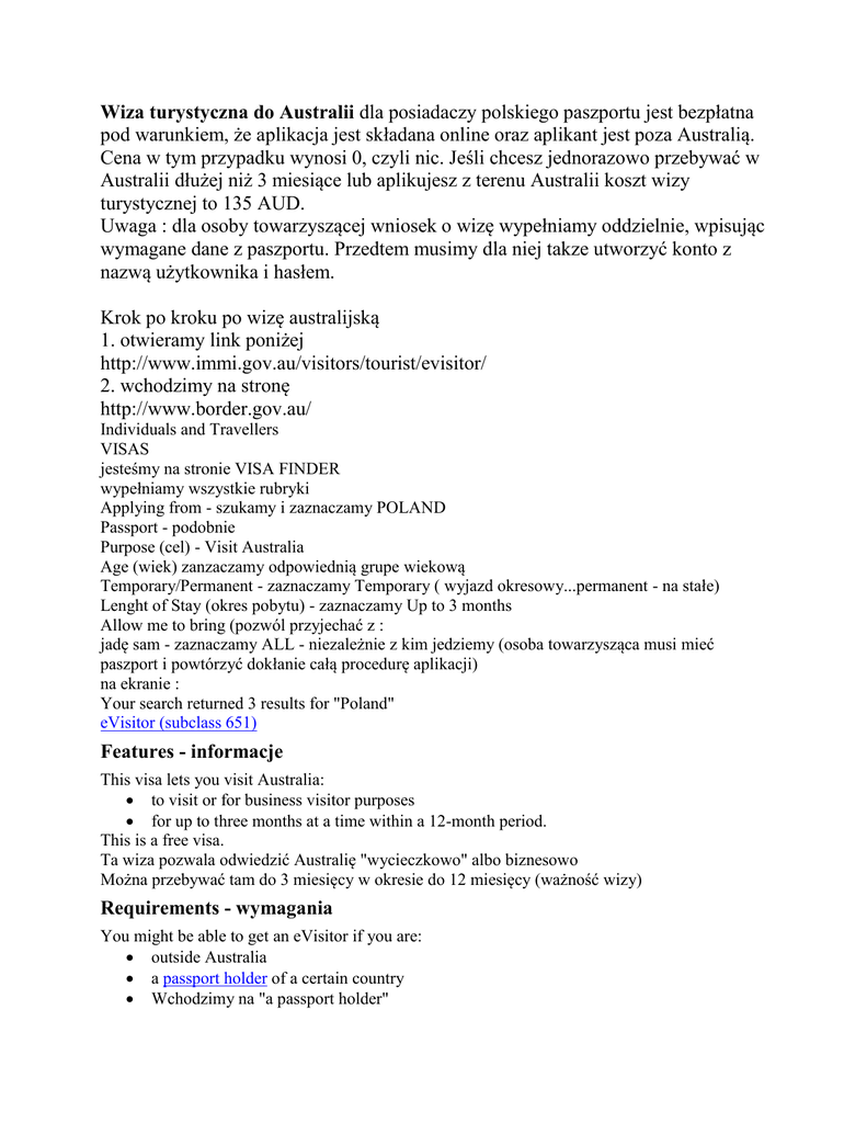 Wiza turystyczna do Australii dla posiadaczy polskiego paszportu jest bezpłatna pod warunkiem, że aplikacja jest składana online oraz aplikant jest poza Australią. Cena w tym przypadku wynosi 0, czyli nic. Jeśli chcesz jednorazowo przebywać w Australii dłużej niż 3 miesiące lub aplikujesz z terenu Australii koszt wizy turystycznej to 135 AUD. Uwaga : dla osoby towarzyszącej wniosek o wizę wypełniamy oddzielnie, wpisując wymagane dane z paszportu. Przedtem musimy dla niej takze utworzyć konto z nazwą użytkownika i hasłem. Krok po kroku po wizę australijską 1. otwieramy link poniżej http://www.immi.gov.au/visitors/tourist/evisitor/ 2. wchodzimy na stronę http://www.border.gov.au/ Individuals and Travellers VISAS jesteśmy na stronie VISA FINDER wypełniamy wszystkie rubryki Applying from - szukamy i zaznaczamy POLAND Passport - podobnie Purpose (cel) - Visit Australia Age (wiek) zanzaczamy odpowiednią grupe wiekową Temporary/Permanent - zaznaczamy Temporary ( wyjazd okresowy...permanent - na stałe) Lenght of Stay (okres pobytu) - zaznaczamy Up to 3 months Allow me to bring (pozwól przyjechać z : jadę sam - zaznaczamy ALL - niezależnie z kim jedziemy (osoba towarzysząca musi mieć paszport i powtórzyć dokłanie całą procedurę aplikacji) na ekranie : Your search returned 3 results for "Poland" eVisitor (subclass 651) Features - informacje This visa lets you visit Australia: to visit or for business visitor purposes for up to three months at a time within a 12-month period. This is a free visa. Ta wiza pozwala odwiedzić Australię "wycieczkowo" albo biznesowo Można przebywać tam do 3 miesięcy w okresie do 12 miesięcy (ważność wizy) Requirements - wymagania You might be able to get an eVisitor if you are: outside Australia a passport holder of a certain country Wchodzimy na "a passport holder" ------------------------------------------------- eVisitor (subclass 651) Features This visa lets you visit Australia: to visit or for business visitor purposes for up to three months at a time within a 12-month period. This is a free visa. Requirements You might be able to get an eVisitor if you are: outside Australia a passport holder of a certain country. Apply Now wchodzimy na Aply Now I have forgotten my ImmiAccount username or password Create an ImmiAccount W tym miejscu musimy założyć własne konto, stąd wchodzimy na Create Immiaccount wypełniamy wszystkie rubryki po wypełnieniu naciskamy - w prawym, dolnym rogu "continue" podajemy login(username) - najlepiej imię i nazwisko hasło(password) - przynajmniej 9 znaków, w tym conajmniej jedna duża litera i jedna cyfra create an ImmiAccount na podany adres e-mail otrzymamy : 1. Confirm your ImmiAccount email address do - podane imię i nazwisko oraz username co musimy potwierdzić klikając na podany link. Please use the following link to confirm your email address: https://online.immi.gov.au/lusc/verifyEmailNotification?id=... Wchodzimy na : https://online.immi.gov.au/lusc/login wpisując podane wcześniej "username" oraz "password" i po potwierdzeniu informacji o zrozumieniu zasad klikamy na https://online.immi.gov.au/ola/app oraz "new application" - po lewej stronie, o góry Wpisujemy wszystkie żądane informacje - imię(imiona) nazwisko, adres, dane z paszportu oraz zakreślamy rubryki "yes" Podany powyzej link ważny jest 28 dni. Po ponownym potwierdzeniu wszystkich podanych danych klikamy na "submit" i czekamy na wizę. Wkróte na nasz adres e-mail otrzymamy nowy list z załącznikiem - potwierdzającym przekazane dane IMMI Grant Notification.pdf In reply please quote: Client Name .....Date of Birth.....Date of Visa Application......Application ID ..... Transaction Reference Number .....File Number.....Transsmision method..... oraz oraz potwierdzenie udzielonej wizy VISA GRANT NOTICE z wieloma ważnymi informacjami. Ten sam, identyczny list możemy dostać dwa razy. ---------------------------------------------------------------------------------------------------UWAGA : Przy tworzeniu konta : Proszę zapisać dokładnie podany adres e-mail, username i hasło username - własny adres e-mail oraz hasło, przy pomocy których możemy zawsze wejść na nasze konto, sprawdzić dane, dokonać ewentualnych poprawek. W razie trudności uprzejmie proszę o telefon (600628302) lub informację na [email protected]