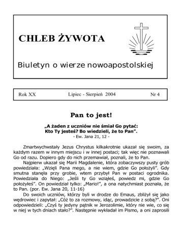 CHLEB ŻYWOTA Biuletyn o wierze nowoapostolskiej Rok XX Lipiec - Sierpień 2004 Nr 4 Pan to jest! „A żaden z uczniów nie śmiał Go pytać: Kto Ty jesteś? Bo wiedzieli, że to Pan”. - Ew. Jana 21, 12 - Zmartwychwstały Jezus Chrystus kilkakrotnie ukazał się swoim, za każdym razem w innym miejscu i w innej postaci; tak więc nie poznawali Go od razu. Dopiero gdy do nich przemawiał, poznali, że to Pan. Najpierw ukazał się Marii Magdalenie, która zobaczywszy pusty grób powiedziała: „Wzięli Pana mego, a nie wiem, gdzie Go położyli”. Gdy smutna stanęła przy grobie, wtem przybył Pan w postaci ogrodnika. Powiedziała do Niego: „Jeśli ty Go wziąłeś, powiedz mi, gdzie Go położyłeś”. On powiedział tylko: „Mario!”, a ona natychmiast poznała, że to Pan. (por. Ew. Jana 20, 11-16) Do swoich uczniów, którzy byli w drodze do Emaus, zbliżył się jako wędrowiec i zapytał: „Cóż to za rozmowy, idąc, prowadzicie z sobą?”. Oni odpowiedzieli: „Czyś ty jedyny pątnik w Jerozolimie, który nie wie, co się w niej w tych dniach stało?”. Następnie wykładał im Pismo, a oni zaprosili Go na kolację. On zaś wziął chleb, pobłogosławił, rozłamał i podawał im. Wtedy poznali, że to Pan! (por. Ew. Łukasza 24, 13-31) Później Pan ukazał się swoim uczniom nad Morzem Galilejskim. Uczniowie całą noc byli na morzu łowić ryby, ale nic nie złowili. Pan im poradził: „Zapuśćcie sieć po prawej stronie łodzi, a znajdziecie”. Uczniowie posłuchali Jego rady, po czym nie mogli wyciągnąć sieci z powodu mnóstwa ryb. Wtedy rzekł Jan do Piotra: „Pan jest!”. Gdy wszyscy razem spożywali posiłek, wtedy każdy wiedział, że to jest Pan. (por. Ew. Jana 21, 4-13) Ci, którzy należeli do Pana, poznawali Go: Maria Magdalena poznała Pana po głosie, uczniowie z Emaus po łamaniu chleba i po tym, jak poruszył ich wewnętrznie. (por. Ew. Łukasza 24, 32) Pozostali uczniowie poznali Go nad Morzem Galilejskim po mocy słowa i błogosławieństwie. My zaś z biegiem lat poznaliśmy Pana jako Tego, który: • złożył ofiarę dla zbawienia i jest Zbawicielem ratującym dusze, • wybrał nas z łaski i uczynił dziećmi Bożymi, • obecny jest w nabożeństwach i przybliża się do nas podczas odwiedzin duszpasterskich, • obdarowuje pokojem, radością i pocieszeniem oraz wzmacnia wiarę, • daje siłę do przezwyciężania, • dokończy swoje dzieło zbawienia, • obiecał przyjść ponownie i zabrać swoich do siebie, • przyjdzie jako Oblubieniec i poprowadzi swoją oblubienicę na Wesele Baranka. Poznajemy Jego dzisiaj po głosie jako Dobrego Pasterza, w słowie, w sakramentach, w błogosławieństwie. Gdy zaś przyjdzie ponownie, (por. Ew. Jana 14, 2. 3) wtedy zdziała powstanie umarłych w Chrystusie i przemienienie żyjących. (por. 1. Tesaloniczan 4, 16. 17) Zwrócić serce do Pana „Zwróćcie wasze serca do Pana, i służcie wyłącznie Jemu”. - 1. Samuela 7, 3 - Słowa proroka Samuela: „Zwróćcie wasze serca do Pana!”, skierowane do ludu starego przymierza, aktualne są jeszcze dzisiaj. Wówczas Samuel wzywał Izraelitów, aby się zwrócili do Pana i usunęli obcych bogów spośród siebie, aby Pan mógł ich wybawić z ręki wrogów. 2 Nadal aktualne jest jeszcze stare przykazanie Boże: „Jam jest Pan, Bóg twój! (…) Nie będziesz miał innych bogów obok mnie. Nie czyń sobie podobizny rzeźbionej czegokolwiek. (…) Nie będziesz się im kłaniał i nie będziesz im służył”. (por. 2. Mojżeszowa 20, 2-5) Oddawajmy więc chwałę wszechmocnemu Bogu i służmy Panu z radością. Wówczas doświadczymy doniosłości słów Pana: „Oto przyjdę wkrótce, a zapłata moja jest ze mną, by oddać każdemu według jego uczynku”. (Obj. Jana 22, 12) Pozwólmy się dzisiaj przygotowywać na obiecany cel, (por. Ew. Jana 14, 2. 3) a nasze serca zwrócimy do Chrystusa, który ponownie przyjdzie. Czyńmy to przede wszystkim z miłości do Niego oraz w świadomości Jego przyrzeczenia, że Pan weźmie w obronę swoich wybranych. (por. Ew. Łukasza 18, 7) Kiedy zwracamy nasze serca do Boga i Jego Syna, uświadamiamy sobie wciąż na nowo „cud” naszego wybrania; wybrania już przed założeniem świata (por. Efezjan 1, 4) i poznajemy wielkość miłości Bożej. Kto zwraca swoje serce do Pana i Zbawiciela, poznaje Jego wielką miłość w ofierze, ten jest świadomy tego, że jako bezgrzeszny wziął na siebie nasze grzechy, aby nas zbawić. Kto zwraca się do Pana, ten też zachowuje Jego słowo i poznaje Go w apostołach i posłanych sługach Bożych. (por. Ew. Mateusza 28, 18-20) Ponadto mamy przyrzeczenie, że „drugi raz ukaże się nie z powodu grzechu, lecz ku zbawieniu tym, którzy Go oczekują”. (por. Hebrajczyków 9, 28) Zwracać serce do Pana oznacza również strzec je przed nieczystymi myślami i służyć tylko Jemu. Pan Jezus powiedział w „Kazaniu na górze”: „Błogosławieni czystego serca, albowiem oni Boga oglądać będą”. (Ew. Mateusza 5, 8) Dziecko Boże, które służy Panu czystym sercem, nie życzy sobie większej nagrody niż oglądanie Boga. Wobec tego nie powinno nam sprawiać trudności, żeby: • wykorzystywać nabożeństwa i wzmacniać się w wierze, • trwać w pierwszej miłości i dokonywać odpowiednich uczynków, • składać ofiary i służyć Bogu oraz bliźnim, • świadczyć o łasce, która ma być jeszcze darowana wielu innym, • trwać w modlitwie i naśladownictwie Chrystusa i Jego apostołów, • przygotowywać się na przyjście Pana i udział w Weselu Baranka, • pomagać w budowaniu i dokończeniu dzieła Bożego. Jeżeli w ten sposób służymy Panu, dożyjemy spełnienia Jego obietnicy: „Jeśli kto chce mi służyć, niech idzie za mną, a gdzie Ja jestem, tam i sługa mój będzie”. (Ew. Jana 12, 26) 3 Dział duszpasterski dla dzieci Biskupi piszą do dzieci: W ramach cyklu listów biskupów tym razem zapoznamy się z tym, co pisze biskup 