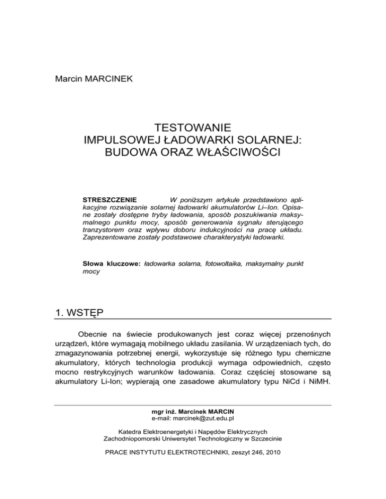 Marcin MARCINEK TESTOWANIE IMPULSOWEJ ŁADOWARKI SOLARNEJ: BUDOWA ORAZ WŁAŚCIWOŚCI STRESZCZENIE W poniższym artykule przedstawiono aplikacyjne rozwiązanie solarnej ładowarki akumulatorów Li–Ion. Opisane zostały dostępne tryby ładowania, sposób poszukiwania maksymalnego punktu mocy, sposób generowania sygnału sterującego tranzystorem oraz wpływu doboru indukcyjności na pracę układu. Zaprezentowane zostały podstawowe charakterystyki ładowarki. Słowa kluczowe: ładowarka solarna, fotowoltaika, maksymalny punkt mocy 1. WSTĘP Obecnie na świecie produkowanych jest coraz więcej przenośnych urządzeń, które wymagają mobilnego układu zasilania. W urządzeniach tych, do zmagazynowania potrzebnej energii, wykorzystuje się różnego typu chemiczne akumulatory, których technologia produkcji wymaga odpowiednich, często mocno restrykcyjnych warunków ładowania. Coraz częściej stosowane są akumulatory Li-Ion; wypierają one zasadowe akumulatory typu NiCd i NiMH. mgr inż. Marcinek MARCIN e-mail: [email protected] Katedra Elektroenergetyki i Napędów Elektrycznych Zachodniopomorski Uniwersytet Technologiczny w Szczecinie PRACE INSTYTUTU ELEKTROTECHNIKI, zeszyt 246, 2010 112 M. Marcinek Najważniejszą zaletą wymienionych wyżej akumulatorów jest brak efektu pamięciowego, ponadto ich napięcie jest proporcjonalne do zgromadzonego ładunku, dzięki temu łatwo można określić stan naładowania akumulatora [2, 3] (lub wyznaczyć początek i koniec cyklu ładowania). Dużą niedogodnością mobilnego układu zasilania jest konieczność doładowywania akumulatorów. Proponowane rozwiązania służące do ładowania chemicznych akumulatorów najczęściej zależne są od zasilania z sieci elektroenergetycznej. Przedstawiony układ ładowania pobiera energię z ogniw fotowoltaicznych. Typowo zakres mocy potrzebnej do naładowania akumulatorów małej pojemności, które mogą zasilać urządzenia przenośne codziennego użytku (między innymi telefony komórkowe, odtwarzacze MP3 itp.) znajduje się w przedziale od kilku do kilkunastu watów, w związku z tym istnieje szansa, iż na terenie Polski rozwiązanie solarne mogłoby znaleźć praktyczne zastosowanie. Badania wykonane na stanowisku testowym ładowarki, dotyczą uzyskiwanej wartości sprawności, otrzymywanych mocy w funkcji natężenia napromienienia panelu oraz wpływu doboru wartości elementów przetwornicy na warunki ładowania i zdolność poszukiwania maksimum mocy. Chemiczne ogniwa typu Li-Ion wymagają ściśle określonych warunków ładowania, jednakże algorytm ładowania akumulatorów nie jest zbytnio skomplikowany. Najważniejsze jest to aby nie przekraczać charakterystycznego dla tej grupy akumulatorów (Li-Ion) krytycznego napięcia ogniwa, którego wartość w przypadku ogniw litowo-jonowych wynosi 4,2 V oraz maksymalnego natężenia prądu o wartości 1 C [1]. Wyrażanie w „C” ułatwia analizę prądów ładowania i rozładowywania, wiążąc je z pojemnością baterii. Prąd 1 C oznacza, że akumulator jest ładowany bądź rozładowywany nominalnym prądem. Dla akumulatora o pojemności C = 1600 mAh prąd 1 C wynosi 1600 mA, a prąd 0,1 C wynosi 160 mA [2]. Czas ładowania można podzielić na dwa okresy: pierwszy to czas, kiedy akumulator ładowany jest stałym prądem nieprzekraczającym 1 C. Proces ten realizowany jest do osiągnięcia napięcia 4,2 V w odniesieniu do jednego ogniwa. Po tym czasie poziom naładowania akumulatora można oszacować na około 65%. Dalsze ładowanie baterii polega na utrzymywaniu stałej wartości napięcia (na poziomie 4,2 V) w odniesieniu do jednego ogniwa akumulatora i wraz ze wzrostem poziomu naładowania powolnym obniżaniu wartości natężenia prądu. Zmiany poszczególnych parametrów elektrycznych oraz stopień naładowania ogniwa w funkcji czasu zaprezentowane są na rysunku 1. Testowanie impulsowej ładowarki solarnej: budowa oraz właściwości 113 Rys. 1. Przebieg czasowy ładowania akumulatora Li-Ion [1] 2. ŁADOWARKA – BUDOWA, WŁAŚCIWOŚCI, FUNKCJE LT3652 jest scalona ładowarka akumulatorów Li-Ion (rysunek 2 przedstawia schemat ideowy modelu testowego), o maksymalnym (zewnętrznie programowalnym) prądzie ładowania 2 A, i wymaganym napięciu zasilania zawierającym się w przedziale 4,95 V do 32 V. Dzięki programowalnemu sprzężeniu zwrotnemu możliwe jest ładowanie baterii o napięciach do 14,4 V. Rys. 2. Schemat ideowy modelu prototypowego 114 M. Marcinek Urządzenie posiada dwa zewnętrznie nastawialne tryby ładowania, ponadto ładowarka przy pomocy prostego algorytmu jest w stanie wyznaczyć maksymalny punkt mocy (MPP – maximum power point) ogniwa fotowoltaicznego. 2.1. Zabezpieczenie sygnału sterującego Głównym zadaniem ładowarki jest wypracowywanie odpowiedniej do stanu naładowania i temperatury akumulatora wartości natężenia prądu ładującego. Częścią wykonawczą ładowarki jest wewnętrzny tranzystor przygotowany do pracy w układzie obniżającym napięcie (buck). Sygnał sterujący wypracowywany jest przez wewnętrzny generator, który oscyluje z częstotliwością 1 MHz [6]. Ładowarka posiada szereg zabezpieczeń, które bezpośrednio wpływają na sygnał sterujący tranzystorem. Rys. 3. Sygnał sterujący wraz z wpływającymi na niego zabezpieczeniami W ładowarce przewidziane są trzy główne zabezpieczenia [6]: pod/nad napięciowe, prądowe oraz termiczne. Zabezpieczenie termiczne pozwala na pracę ładowarki przy temperaturze baterii zawierającej się w przedziale 0°C-40°C. Zabezpieczenie prądowe ogranicza maksymalny prąd ładowania, zadziałanie tego zabezpieczenia ma również miejsce w przypadku pracy w trybie 0,1 C, czyli w sytuacji naładowania (podtrzymania) baterii. Zabezpieczenie pod/nad napięciowe pilnuje aby badane urządzenie pracowało w przypadku gdy napięcie zasilania zawiera się w przedziale 4,5-30 V. Testowanie impulsowej ładowarki solarnej: budowa oraz właściwości