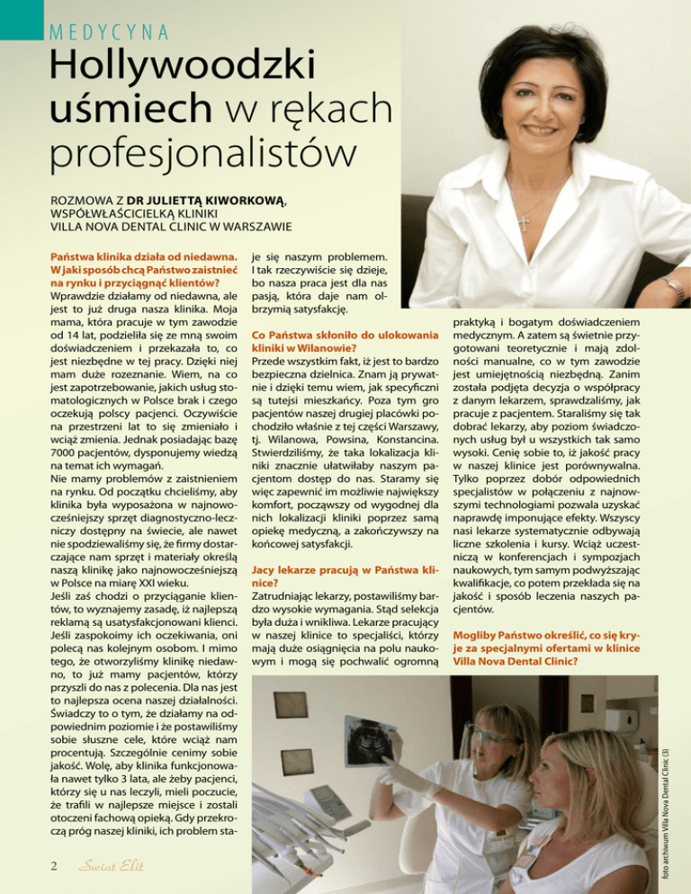 medycyna Hollywoodzki uśmiech w rękach profesjonalistów Rozmowa z dr Juliettą Kiworkową, współwłaścicielką kliniki Villa Nova Dental Clinic w Warszawie je się naszym problemem. I tak rzeczywiście się dzieje, bo nasza praca jest dla nas pasją, która daje nam olbrzymią satysfakcję. Co Państwa skłoniło do ulokowania kliniki w Wilanowie? Przede wszystkim fakt, iż jest to bardzo bezpieczna dzielnica. Znam ją prywatnie i dzięki temu wiem, jak specyficzni są tutejsi mieszkańcy. Poza tym gro pacjentów naszej drugiej placówki pochodziło właśnie z tej części Warszawy, tj. Wilanowa, Powsina, Konstancina. Stwierdziliśmy, że taka lokalizacja kliniki znacznie ułatwiłaby naszym pacjentom dostęp do nas. Staramy się więc zapewnić im możliwie największy komfort, począwszy od wygodnej dla nich lokalizacji kliniki poprzez samą opiekę medyczną, a zakończywszy na końcowej satysfakcji. Jacy lekarze pracują w Państwa klinice? Zatrudniając lekarzy, postawiliśmy bardzo wysokie wymagania. Stąd selekcja była duża i wnikliwa. Lekarze pracujący w naszej klinice to specjaliści, którzy mają duże osiągnięcia na polu naukowym i mogą się pochwalić ogromną praktyką i bogatym doświadczeniem medycznym. A zatem są świetnie przygotowani teoretycznie i mają zdolności manualne, co w tym zawodzie jest umiejętnością niezbędną. Zanim została podjęta decyzja o współpracy z danym lekarzem, sprawdzaliśmy, jak pracuje z pacjentem. Staraliśmy się tak dobrać lekarzy, aby poziom świadczonych usług był u wszystkich tak samo wysoki. Cenię sobie to, iż jakość pracy w naszej klinice jest porównywalna. Tylko poprzez dobór odpowiednich specjalistów w połączeniu z najnowszymi technologiami pozwala uzyskać naprawdę imponujące efekty. Wszyscy nasi lekarze systematycznie odbywają liczne szkolenia i kursy. Wciąż uczestniczą w konferencjach i sympozjach naukowych, tym samym podwyższając kwalifikacje, co potem przekłada się na jakość i sposób leczenia naszych pacjentów. Mogliby Państwo określić, co się kryje za specjalnymi ofertami w klinice Villa Nova Dental Clinic? foto archiwum Villa Nova Dental Clinic (3) Państwa klinika działa od niedawna. W jaki sposób chcą Państwo zaistnieć na rynku i przyciągnąć klientów? Wprawdzie działamy od niedawna, ale jest to już druga nasza klinika. Moja mama, która pracuje w tym zawodzie od 14 lat, podzieliła się ze mną swoim doświadczeniem i przekazała to, co jest niezbędne w tej pracy. Dzięki niej mam duże rozeznanie. Wiem, na co jest zapotrzebowanie, jakich usług stomatologicznych w Polsce brak i czego oczekują polscy pacjenci. Oczywiście na przestrzeni lat to się zmieniało i wciąż zmienia. Jednak posiadając bazę 7000 pacjentów, dysponujemy wiedzą na temat ich wymagań. Nie mamy problemów z zaistnieniem na rynku. Od początku chcieliśmy, aby klinika była wyposażona w najnowocześniejszy sprzęt diagnostyczno-leczniczy dostępny na świecie, ale nawet nie spodziewaliśmy się, że firmy dostarczające nam sprzęt i materiały określą naszą klinikę jako najnowocześniejszą w Polsce na miarę XXI wieku. Jeśli zaś chodzi o przyciąganie klientów, to wyznajemy zasadę, iż najlepszą reklamą są usatysfakcjonowani klienci. Jeśli zaspokoimy ich oczekiwania, oni polecą nas kolejnym osobom. I mimo tego, że otworzyliśmy klinikę niedawno, to już mamy pacjentów, którzy przyszli do nas z polecenia. Dla nas jest to najlepsza ocena naszej działalności. Świadczy to o tym, że działamy na odpowiednim poziomie i że postawiliśmy sobie słuszne cele, które wciąż nam procentują. Szczególnie cenimy sobie jakość. Wolę, aby klinika funkcjonowała nawet tylko 3 lata, ale żeby pacjenci, którzy się u nas leczyli, mieli poczucie, że trafili w najlepsze miejsce i zostali otoczeni fachową opieką. Gdy przekroczą próg naszej kliniki, ich problem sta- medycyna Aby odpowiedzieć na to pytanie, muszę przede wszystkim skupić się nad zakresem naszych usług i specjalności. W Villa Nova Dental Clinic pacjenci uzyskują kompleksowe leczenie stomatologiczne w zakresie: stomatologii zachowawczej, stomatologii estetycznej, endodoncji, endodoncji mikroskopowej, a także ortodoncji, stomatologii dziecięcej, profilaktyki, periodontologii, rentgenodiagnostyki, chirurgii stomatologicznej, implantologii i protetyki. Specjalizujemy się w stomatologii estetycznej w szerokim tego słowa znaczeniu. W zespole mamy stomatologa, który specjalizuje się w stomatologii estetycznej i należy do Stowarzyszenia Lekarzy Stomatologii Estetycznej, w którego skład wchodzi tylko 30 specjalistów w kraju. Osiągamy imponujące rezultaty w tak zwanych licówkach, których większość placówek stomatologicznych w Polsce się wystrzega. Wynika to ze stopnia trudności i zaangażowania w ich wykonanie. Idealna licówka, czyli estetyczna odbudowa frontowej powierzchni zęba, wymaga od lekarza ogromnego profesjonalizmu i stuprocentowej perfekcji. Stomatologom najczęściej nie chce się w to „bawić” i gdy zachodzi konieczność poprawy wyglądu zębów pacjenta, wtedy licówkę zastępują koroną. Wychodzimy jednak z założenia, że jeśli istnieje cień szansy na redukcję inwazyjnego działania, to zawsze wybieramy takie rozwiązanie. Efekty naszych prac są naprawdę imponujące. Dajemy pacjentom możliwość osiągnięcia efektu tzw. hollywood smile. Jeżeli pacjent nie może pozwolić sobie na stały aparat, a kształt zębów lub kolor pomimo wybielania pozostawiają wiele do życzenia, to poprzez zastosowanie licówek dajemy im możliwość naprawy takich mankamentów urody. Kontynuując wątek stomatologii estetycznej, możemy przejść od implantów aż do wybielania zębów oraz profilaktyki i leczenie ortodontycznego. Wszystko to można znaleźć w wachlarzu oferowanych usług. Dążymy do zaoferowania pełnej estetyki oraz dbamy o uzyskanie idealnego efektu. Oferują P