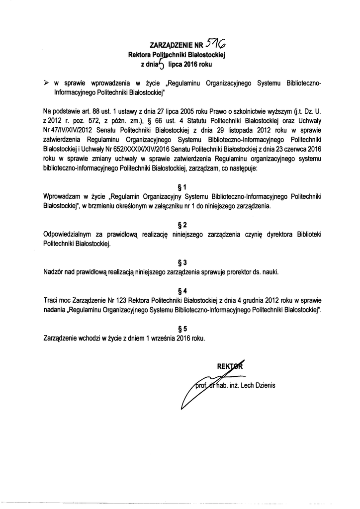 Załącznik Nr 1 do Zarządzenia Nr 516/2016 Rektora Politechniki Białostockiej REGULAMIN ORGANIZACYJNY SYSTEMU BIBLIOTECZNO-INFORMACYJNEGO POLITECHNIKI BIAŁOSTOCKIEJ Białystok 2016 SPIS TREŚCI Strona Rozdział I POSTANOWIENIA OGÓLNE ...................................................................................................................2 Rozdział II STRUKTURA ORGANIZACYJNA SYSTEMUBIBLIOTECZNO-INFORMACYJNEGO..............................2 Rozdział III ZADANIA I FUNKCJE BIBLIOTEKI...........................................................................................................2 Rozdział IV ORGANIZACJA BIBLIOTEKI ....................................................................................................................3 Rozdział V RAMOWY ZAKRES CZYNNOŚCI KOMÓREK ORGANIZACYJNYCH BIBLIOTEKI GŁÓWNEJ .............5 Rozdział VI ZASADY ORGANIZACJI I DZIAŁANIA BIBLIOTEK SPECJALISTYCZNYCH ..........................................7 Rozdział VII ORGANIZACJA ARCHIWUM UCZELNIANEGO ......................................................................................8 Rozdział VIII PRACOWNICY SYSTEMU BIBLIOTECZNO-INFORMACYJNEGO .........................................................8 1 Rozdział I POSTANOWIENIA OGÓLNE §1 1. Podstawę prawną Regulaminu organizacyjnego systemu biblioteczno-informacyjnego w Politechnice Białostockiej, zwanego dalej Regulaminem, stanowią w szczególności: 1) ustawa z dnia 27 lipca 2005 roku Prawo o szkolnictwie wyższym (j.t. Dz. U. 2012 r., poz. 572 z późn. zm.), 2) ustawa z dnia 27 czerwca 1997 roku o bibliotekach (Dz. U. 2012 r., poz. 642 z późn. zm.), 3) ustawa z dnia 14 lipca 1983 roku o narodowym zasobie archiwalnym i archiwach (j.t. Dz. U. 2015 r. poz. poz. 1446 z późn. zm.), 4) Statut Politechniki Białostockiej, zwany dalej Statutem. 2. Niniejszy Regulamin określa: 1) strukturę organizacyjną systemu biblioteczno-informacyjnego, 2) zadania i funkcje Biblioteki Politechniki Białostockiej, zwanej dalej Biblioteką, 3) podstawowy zakres czynności jednostek organizacyjnych Biblioteki. 3. Biblioteka używa w tłumaczeniu na język angielski nazwy: „The Library of the Bialystok University of Technology”. Rozdział II STRUKTURA ORGANIZACYJNA SYSTEMU BIBLIOTECZNO-INFORMACYJNEGO §2 1. Jednolity system biblioteczno-informacyjny Uczelni tworzy Biblioteka, w skład której wchodzą: 1) Biblioteka Główna, 2) biblioteki wydziałów, instytutów i innych jednostek organizacyjnych (jako biblioteki specjalistyczne), 3) Archiwum Uczelniane. 2. Biblioteki specjalistyczne tworzone są w miarę potrzeb naukowych i dydaktycznych w podstawowych jednostkach organizacyjnych Uczelni. 3. Nadzór merytoryczny nad systemem biblioteczno-informacyjnym Uczelni sprawuje dyrektor Biblioteki. 4. W Uczelni działa Rada Biblioteczna jako organ opiniodawczy Rektora. Tryb powoływania oraz szczegółowe kompetencje Rady Bibliotecznej określa Statut uczelni. 5. Schemat organizacyjny systemu biblioteczno-informacyjnego Uczelni przedstawia załącznik nr 1 do niniejszego Regulaminu. Rozdział III ZADANIA I FUNKCJE BIBLIOTEKI §3 Biblioteka Politechniki Białostockiej: 1) jest ogólnouczelnianą jednostką organizacyjną wykonującą zadania naukowe, dydaktyczne i usługowe, podległą bezpośrednio Prorektorowi ds. Nauki, 2) jest ośrodkiem dokumentacji i informacji naukowej, 3) ma charakter publicznej biblioteki naukowej wchodzącej w skład ogólnokrajowej sieci bibliotecznej, 2 4) stanowi podstawę jednolitego systemu biblioteczno-informacyjnego Uczelni. §4 1. Do zadań Biblioteki należy gromadzenie, opracowywanie, przechowywanie, udostępnianie, informowanie o zbiorach bibliotecznych, źródłach informacji i wiedzy oraz dokumentacji powstającej w toku działalności Uczelni. 2. Zbiory biblioteczne są udostępniane pracownikom Uczelni, jej doktorantom i studentom oraz instytucjom i osobom spoza Uczelni na warunkach określonych w Regulaminie korzystania z zasobów systemu biblioteczno-informacyjnego Politechniki Białostockiej, który na wniosek dyrektora Biblioteki zatwierdza Rektor po zaopiniowaniu przez Radę Biblioteczną. 3. Biblioteka współpracuje z jednostkami organizacyjnymi Uczelni w zakresie realizacji ich zadań, a w szczególności w zakresie wspomagania prowadzonych badań naukowych, dydaktyki oraz promocji osiągnięć Uczelni. 4. Do zadań szczegółowych Biblioteki należy: 1) organizowanie warsztatu pracy naukowej oraz zapewnienie dostępu do literatury naukowej i dydaktycznej zgodnie z profilem działalności Uczelni poprzez dobór, fachowe opracowanie, właściwe przechowywanie i udostępnianie materiałów bibliotecznych, 2) świadczenie usług informacyjnych oraz prowadzenie prac bibliograficznych i dokumentacyjnych umożliwiających jak najszersze wykorzystanie zbiorów własnych oraz wyszukiwanie informacji o dokumentach spoza zasobów Biblioteki, 3) prowadzenie bieżącej dokumentacji dorobku piśmienniczego i naukowego pracowników Uczelni, jej doktorantów i studentów, 4) promowanie zbiorów i usług informacyjnych oferowanych przez jednostki systemu biblioteczno-informacyjnego Uczelni, 5) działalność dydaktyczna, a w szczególności współudział w kształceniu doktorantów, studentów i młodej kadry naukowej poprzez organizowanie i prowadzenie szkoleń, wystaw i pokazów promujących zbiory biblioteczne, źródła informacji i efektywne metody korzystania z nich, 6) prowadzenie prac badawczych z zakresu bibliotekoznawstwa i dziedzin pokrewnych, 7) kształcenie i doskonalenie zawodowe pracowników Biblioteki, prowadzenie praktyk studenckich i staży bibliotecznych na potrzeby pracowników bibliotek naukowych, 8) współpraca z bibliotekami naukowymi w kraju i za granicą oraz innymi instytucjami i organizacjami w zakresie wykorzystywania i rozwoju najnowszych technologii i metod pracy bibliotek, rozbudowy i aktualizacji zbiorów bibliotecznych oraz świadczenia usług informacyjnych i szkolen