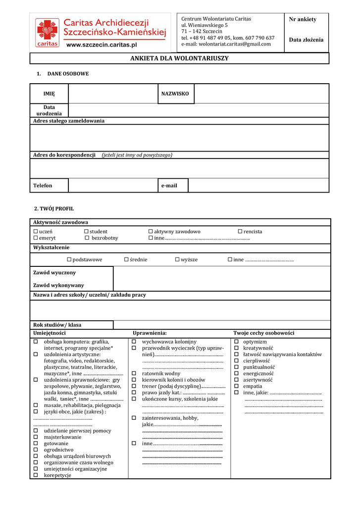 ankieta dla wolontariusza - Caritas Archidiecezji Szczecińsko