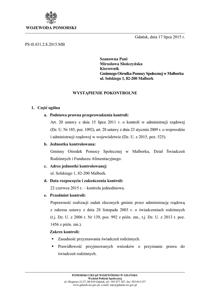 WOJEWODA POMORSKI Gdańsk, dnia 17 lipca 2015 r. PS-II.431.2.8.2015.MB Szanowna Pani Mirosława Słończyńska Kierownik Gminnego Ośrodka Pomocy Społecznej w Malborku ul. Solskiego 1, 82-200 Malbork WYSTĄPIENIE POKONTROLNE 1. Część ogólna a. Podstawa prawna przeprowadzenia kontroli: Art. 20 ustawy z dnia 15 lipca 2011 r. o kontroli w administracji rządowej (Dz. U. Nr 185, poz. 1092), art. 28 ustawy z dnia 23 stycznia 2009 r. o wojewodzie i administracji rządowej w województwie (Dz. U. z 2015, poz. 525). b. Jednostka kontrolowana: Gminny Ośrodek Pomocy Społecznej w Malborku, Dział Świadczeń Rodzinnych i Funduszu Alimentacyjnego. c. Adres jednostki kontrolowanej: ul. Solskiego 1, 82-200 Malbork. d. Data rozpoczęcia i zakończenia kontroli: 22 czerwca 2015 r. – kontrola jednodniowa. e. Przedmiot kontroli: Poprawność realizacji zadań zleconych gminie przez administrację rządową z zakresu ustawy z dnia 28 listopada 2003 r. o świadczeniach rodzinnych (t.j. Dz. U. z 2006 r. Nr 139, poz. 992 z późn. zm., t.j. Dz. U. z 2013 r. poz. 1456 z późn. zm.). Zakres kontroli: Zasadność przyznawania świadczeń rodzinnych. Prawidłowość przyjmowanych wniosków o przyznanie prawa do świadczeń rodzinnych. POMORSKI URZĄD WOJEWÓDZKI W GDAŃSKU Wydział Polityki Społecznej ul. Okopowa 21/27, 80-810 Gdańsk, tel.: 583 077 287, fax: 583 014 337 www.gdansk.uw.gov.pl, e-mail: [email protected] Prawidłowość kompletowania załączników do wniosków o przyznanie prawa do świadczeń rodzinnych. Poprawność wydawanych decyzji administracyjnych. Terminowość wydawanych decyzji administracyjnych. Organizacja pracy. f. Okres objęty kontrolą: Okres zasiłkowy od 1 listopada 2013 r. do 31 października 2014 r. g. Kontrolę wpisano do książki kontroli: Kontrolę wpisano do książki kontroli 22 czerwca 2015 r. h. Kierownik jednostki kontrolowanej: Od 26 lutego 1990 r. w Gminnym Ośrodku Pomocy Społecznej w Malborku pełniąca funkcję kierownika jest Pani Mirosława Słończyńska. i. Skład zespołu kontrolującego: Mirosław Bigot - kierownik zespołu kontrolującego, Agnieszka Babiarz - członek zespołu kontrolującego. j. Informacje wstępne: W strukturze organizacyjnej Ośrodka wyróżnia się Dział Świadczeń Rodzinnych i Funduszu Alimentacyjnego w § 8.1. Uchwały Nr XV/149/2012 Rady Gminy w Malborku z dnia 28 marca 2012 r. w sprawie nadania Statutu Gminnemu Ośrodkowi Pomocy Społecznej w Malborku. 2. Ocena skontrolowanej działalności: Poprawność realizacji zadań zleconych gminie przez administrację rządową z zakresu ustawy o świadczeniach rodzinnych oceniono pozytywnie z uwagi na brak wystąpienia uchybień oraz nieprawidłowości w pobranych dowodach z kontroli zgodnie § 15. 1. Zarządzenia Nr 117/2015 Wojewody Pomorskiego z dnia 30 kwietnia 2015 r. w sprawie kontroli realizowanych przez Wojewodę Pomorskiego. 3. Uzasadnienie oceny: a. Zasadność przyznawania świadczeń rodzinnych: ocena pozytywna Świadczenia rodzinne Organ przyznaje zasadnie i zgodnie z Rozporządzeniem Ministra Pracy i Polityki Społecznej z dnia 3 stycznia 2013 r. w sprawie sposobu i trybu postępowania w sprawach o świadczenia rodzinne (Dz. U. z 2013 r., poz. 3); POMORSKI URZĄD WOJEWÓDZKI W GDAŃSKU Wydział Polityki Społecznej ul. Okopowa 21/27, 80-810 Gdańsk, tel.: tel.: 583 077 287, fax: 583 014 337 www.gdansk.uw.gov.pl, e-mail: [email protected] Strona 2 z 4 b. Prawidłowość przyjmowanych wniosków o przyznanie prawa do świadczeń rodzinnych: ocena pozytywna Wnioski o przyznanie prawa do świadczeń rodzinnych jednostka kontrolowana oznacza datą wpływu oraz numerem wynikającym z dziennika wpływów. c. Prawidłowość kompletowania załączników do wniosków o przyznanie prawa do świadczeń rodzinnych: ocena pozytywna W dokumentacji poszczególnych spraw znajdowały się wnioski stron o przyznanie poszczególnych rodzajów świadczeń. Do wniosków dołączone były wymagane ustawowo załączniki między innymi takie jak; kserokopie dowodu osobistego, skrócone akty urodzenia dzieci, zaświadczenia z Urzędów Skarbowych, zaświadczenia z Zakładów Ubezpieczeń Społecznych, zaświadczenia o nauce dzieci w szkołach, orzeczenia o niepełnosprawności lub o stopniu niepełnosprawności oraz inne wymagane dokumenty. d. Poprawność wydawanych decyzji administracyjnych: ocena pozytywna Decyzje wydawane zgodnie z zapisami art. 107 ustawy z dnia 14 czerwca 1960 r. Kodeks postępowania administracyjnego (tj. Dz. U. z 2013 r., poz. 267 z późn. zm.), Przeanalizowane decyzji zawierały wszystkie niezbędne elementy, w tym przywołania w podstawie prawnej obowiązujące rozporządzenia. e. Terminowość wydawanych decyzji administracyjnych: ocena pozytywna Wszystkie przeanalizowane decyzje podejmowane były zgodnie z terminami określonymi w kodeksie postępowania administracyjnego. Odbiór decyzji był dokonywany osobiście przez osoby uprawnione lub za pośrednictwem poczty. Osoba otrzymująca potwierdzała odbiór, w myśl art. 46 § 1 ustawy Kpa, który stanowi, że „Odbierający pismo potwierdza doręczenie mu pisma swym podpisem ze wskazaniem daty doręczenia”. f. Organizacja pracy: ocena pozytywna Zespół kontrolny zapoznał się z dokumentami określającymi ustrój, organizację i tryb pracy jednostki kontrolowanej: - Uchwała Nr I/7/91 Rady Gminy w Malborku z dnia 8 lutego 1991 r. w sprawie utworzenia Gminnego Ośrodka Pomocy Społecznej. - Uchwała Nr XVIII/103/2004 Rady Gminy w Malborku z dnia 22 kwietnia 2004 r. w sprawie przekazania zadań wynikających z wejściem w życie ustawy POMORSKI URZĄD WOJEWÓDZKI W GDAŃSKU Wydział Polityki Społecznej ul. Okopowa 21/27, 80-810 Gdańsk, tel.: tel.: 583 077 287, fax: 583 014 337 www.gdansk.uw.gov.pl, e-mail: [email protected] Strona 3 z 4 o świadczeniach rodzinnych do Gminnego Ośrodka Pomocy Społecznej w Malborku oraz upoważnienia kierownika do wydawania decyzji administracyjnych w tym zakresie. - Upowa