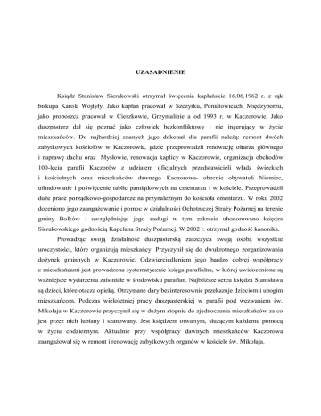 UZASADNIENIE Ksiądz Stanisław Sierakowski otrzymał święcenia kapłańskie 16.06.1962 r. z rąk biskupa Karola Wojtyły. Jako kapłan pracował w Szczyrku, Poniatowicach, Międzyborzu, jako proboszcz pracował w Cieszkowie, Grzymalinie a od 1993 r. w Kaczorowie. Jako duszpasterz dał się poznać jako człowiek bezkonfliktowy i nie ingerujący w życie mieszkańców. Do najbardziej znanych jego dokonań dla parafii należą: remont dwóch zabytkowych kościołów w Kaczorowie, gdzie przeprowadził renowację ołtarza głównego i naprawę dachu oraz Mysłowie, renowacja kaplicy w Kaczorowie, organizacja obchodów 100-lecia parafii Kaczorów z udziałem oficjalnych przedstawicieli władz świeckich i kościelnych oraz mieszkańców dawnego Kaczorowa- obecnie obywateli Niemiec, ufundowanie i poświęcenie tablic pamiątkowych na cmentarzu i w kościele. Przeprowadził duże prace porządkowo-gospodarcze na przynależnym do kościoła cmentarzu. W roku 2002 doceniono jego zaangażowanie i pomoc w działalności Ochotniczej Straży Pożarnej na terenie gminy Bolków i uwzględniając jego zasługi w tym zakresie uhonorowano księdza Sierakowskiego godnością Kapelana Straży Pożarnej. W 2002 r. otrzymał godność kanonika. Prowadząc swoją działalność duszpasterską zaszczyca swoją osobą wszystkie uroczystości, które organizują mieszkańcy. Przyczynił się do dwukrotnego zorganizowania dożynek gminnych w Kaczorowie. Odzwierciedleniem jego bardzo dobrej współpracy z mieszkańcami jest prowadzona systematycznie księga parafialna, w której uwidocznione są ważniejsze wydarzenia zaistniałe w środowisku parafian. Najbliższe sercu księdza Stanisława są dzieci, które otacza opieką. Otrzymane dary bezinteresownie przekazuje dzieciom i ubogim mieszkańcom. Podczas wieloletniej pracy duszpasterskiej w parafii pod wezwaniem św. Mikołaja w Kaczorowie przyczynił się w dużym stopniu do zjednoczenia mieszkańców za co jest przez nich lubiany i szanowany. Jest księdzem otwartym, służącym każdemu pomocą w życiu codziennym. Aktualnie przy współpracy dawnych mieszkańców Kaczorowa zaangażował się w remont i renowację zabytkowych organów w kościele św. Mikołaja.