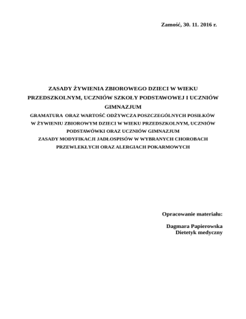 Zamość, 30. 11. 2016 r. ZASADY ŻYWIENIA ZBIOROWEGO DZIECI W WIEKU PRZEDSZKOLNYM, UCZNIÓW SZKOŁY PODSTAWOWEJ I UCZNIÓW GIMNAZJUM GRAMATURA ORAZ WARTOŚĆ ODŻYWCZA POSZCZEGÓLNYCH POSIŁKÓW W ŻYWIENIU ZBIOROWYM DZIECI W WIEKU PRZEDSZKOLNYM, UCZNIÓW PODSTAWÓWKI ORAZ UCZNIÓW GIMNAZJUM ZASADY MODYFIKACJI JADŁOSPISÓW W WYBRANYCH CHOROBACH PRZEWLEKŁYCH ORAZ ALERGIACH POKARMOWYCH Opracowanie materiału: Dagmara Papierowska Dietetyk medyczny SPIS TREŚCI I. Nowelizacja rozporządzenia Ministra Zdrowia- z dnia 26 lipca 2016 roku II. Zasady żywienia w przedszkolu- śniadanie, obiad i podwieczorek III. Zasady żywienia w szkole podstawowej i gimnazjum- obiady IV. Modyfikacje jadłospisów uczniów w wybranych chorobach przewlekłych oraz alergii pokarmowych I. Nowelizacja rozporządzenia Ministra Zdrowia- z dnia 26 lipca 2016 roku1 Zgodnie z rozporządzeniem Ministra Zdrowia z dnia 26 lipca 2016 roku., w sprawie grup środków spożywczych przeznaczonych do sprzedaży dzieciom i młodzieży w jednostkach systemu oświaty oraz wymagań, jakie muszą spełniać środki spożywcze stosowane w ramach żywienia zbiorowego dzieci i młodzieży w tych jednostkach, Na podstawie art. 52c ust. 6 ustawy z dnia 25 sierpnia 2006 r. o bezpieczeństwie żywności i żywienia (Dz. U. z 2015 r. poz. 594 i 1893 oraz z 2016 r. poz. 65) zarządza się, co następuje: § 1. 1. Określa się grupy środków spożywczych przeznaczonych do sprzedaży dzieciom i młodzieży w jednostkach systemu oświaty: 1) pieczywo, z wyłączeniem pieczywa produkowanego z ciasta głęboko mrożonego; 2) pieczywo półcukiernicze i cukiernicze, z wyłączeniem pieczywa produkowanego z ciasta głęboko mrożonego; 3) kanapki; 4) sałatki i surówki; 5) mleko; 6) napoje zastępujące mleko, takie jak napój: sojowy, ryżowy, owsiany, kukurydziany, gryczany, orzechowy, jaglany, kokosowy lub migdałowy; 7) produkty mleczne, takie jak: jogurt, kefir, maślanka, mleko zsiadłe, mleko acidofilne, mleko smakowe, serwatka, ser twarogowy, serek homogenizowany lub produkty zastępujące produkty mleczne na bazie soi, ryżu, owsa, orzechów lub migdałów; 8) zbożowe produkty śniadaniowe oraz inne produkty zbożowe; 9) warzywa; 10) owoce; 11) suszone warzywa i owoce, orzechy oraz nasiona bez dodatku cukrów, substancji słodzących zdefiniowanych w rozporządzeniu Parlamentu Europejskiego i Rady (WE) nr 1333/2008 z dnia 16 grudnia 2008 r. w sprawie dodatków do żywności (Dz. Urz. UE L 354 z 31.12.2008, str. 16, z późn. zm.2)), zwanym dalej „rozporządzeniem (WE) nr 1333/2008”, oraz bez dodatku soli; 12) soki owocowe, warzywne, owocowo-warzywne; 13) przeciery, musy owocowe, warzywne oraz owocowo-warzywne bez dodatku cukrów i soli; 14) koktajle owocowe, warzywne oraz owocowo-warzywne na bazie mleka, napojów zastępujących mleko, o których mowa w pkt 6, produktów mlecznych lub produktów zastępujących produkty mleczne, o których mowa w pkt 7, bez dodatku cukrów i substancji słodzących, o których mowa w 1 Tekst cytowany, na podstawie: http://dziennikustaw.gov.pl/du/2016/1154/1 rozporządzeniu (WE) nr 1333/2008; 15) naturalna woda mineralna nisko- lub średniozmineralizowana, woda źródlana i woda stołowa; 16) napoje przygotowywane na miejscu, które nie mogą zawierać więcej niż 10 g cukrów w 250 ml produktu gotowego do spożycia; 17) napoje bez dodatku cukrów i substancji słodzących zdefiniowanych w rozporządzeniu (WE) nr 1333/2008; 18) bezcukrowe gumy do żucia; 19) czekolada gorzka o zawartości minimum 70% miazgi kakaowej; 20) inne. 2. W jednostkach systemu oświaty mogą być sprzedawane dzieciom i młodzieży grupy środków spożywczych, o których mowa w ust. 1 pkt 2, 6–8 i pkt 20, pod warunkiem że nie zawierają więcej niż: 1) 15 g cukru w 100 g/ml produktu gotowego do spożycia, a w przypadku produktów mlecznych, o których mowa w ust. 1 pkt 7, nie więcej niż 13,5 g cukru w 100 g/ml produktu gotowego do spożycia; 2) 10 g tłuszczu w 100 g/ml produktu gotowego do spożycia; 3) 0,4 g sodu/ 1 g soli w 100 g/ml produktu gotowego do spożycia, a w przypadku pieczywa półcukierniczego i cukierniczego nie więcej niż 0,45 g sodu/ 1,2 g soli w 100 g/ml produktu gotowego do spożycia. § 2. 1. Środki spożywcze stosowane w ramach żywienia zbiorowego dzieci i młodzieży w jednostkach systemu oświaty muszą spełniać odpowiednie wymagania dla danej grupy wiekowej, wynikające z aktualnych norm żywienia dla populacji polskiej. 2. Środki spożywcze, o których mowa w ust. 1, dobiera się w taki sposób, aby: 1) na całodzienne żywienie składały się środki spożywcze pochodzące z różnych grup środków spożywczych; 2) posiłki (śniadanie, obiad, kolacja) zawierały produkty z następujących grup środków spożywczych: produkty zbożowe lub ziemniaki, warzywa lub owoce, mleko lub produkty mleczne, mięso, ryby, jaja, orzechy, nasiona roślin strączkowych i inne nasiona oraz tłuszcze; 3) zupy, sosy oraz potrawy sporządzane były z naturalnych składników, bez użycia koncentratów spożywczych, z wyłączeniem koncentratów z naturalnych składników; 4) od poniedziałku do piątku były podawane nie więcej niż dwie porcje potrawy smażonej, przy czym do smażenia jest używany olej roślinny rafinowany o zawartości kwasów jednonienasyconych powyżej 50% i zawartości kwasów wielonienasyconych poniżej 40%; 5) napoje przygotowywane na miejscu zawierały nie więcej niż 10 g cukrów w 250 ml produktu gotowego do spożycia; 6) każdego dnia były podawane: a) co najmniej dwie porcje mleka lub produktów mlecznych, b) co najmniej jedna porcja z grupy mięso, jaja, orzechy, nasiona roślin strączkowych, c) warzywa lub owoce w każdym posiłku, d) co najmniej jedna porcja produktów zbożowych w śniadaniu, obiedzie oraz kolacji; 7) w żywieniu całodziennym było podawane przynajmniej pięć porcji warzyw lub owoców; 8) co najmniej raz w tygodniu była podawana porcja ryby II