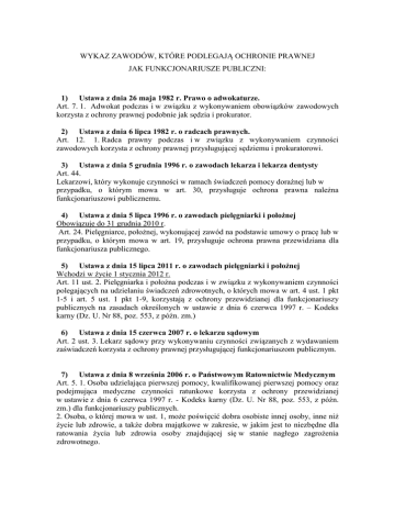 WYKAZ ZAWODÓW, KTÓRE PODLEGAJĄ OCHRONIE PRAWNEJ JAK FUNKCJONARIUSZE PUBLICZNI: 1) Ustawa z dnia 26 maja 1982 r. Prawo o adwokaturze. Art. 7. 1. Adwokat podczas i w związku z wykonywaniem obowiązków zawodowych korzysta z ochrony prawnej podobnie jak sędzia i prokurator. 2) Ustawa z dnia 6 lipca 1982 r. o radcach prawnych. Art. 12. 1. Radca prawny podczas i w związku z wykonywaniem czynności zawodowych korzysta z ochrony prawnej przysługującej sędziemu i prokuratorowi. 3) Ustawa z dnia 5 grudnia 1996 r. o zawodach lekarza i lekarza dentysty Art. 44. Lekarzowi, który wykonuje czynności w ramach świadczeń pomocy doraźnej lub w przypadku, o którym mowa w art. 30, przysługuje ochrona prawna należna funkcjonariuszowi publicznemu. 4) Ustawa z dnia 5 lipca 1996 r. o zawodach pielęgniarki i połoŜnej Obowiązuje do 31 grudnia 2010 r. Art. 24. Pielęgniarce, położnej, wykonującej zawód na podstawie umowy o pracę lub w przypadku, o którym mowa w art. 19, przysługuje ochrona prawna przewidziana dla funkcjonariusza publicznego. 5) Ustawa z dnia 15 lipca 2011 r. o zawodach pielęgniarki i połoŜnej Wchodzi w życie 1 stycznia 2012 r. Art. 11 ust. 2. Pielęgniarka i położna podczas i w związku z wykonywaniem czynności polegających na udzielaniu świadczeń zdrowotnych, o których mowa w art. 4 ust. 1 pkt 1-5 i art. 5 ust. 1 pkt 1-9, korzystają z ochrony przewidzianej dla funkcjonariuszy publicznych na zasadach określonych w ustawie z dnia 6 czerwca 1997 r. – Kodeks karny (Dz. U. Nr 88, poz. 553, z późn. zm.) 6) Ustawa z dnia 15 czerwca 2007 r. o lekarzu sądowym Art. 2 ust. 3. Lekarz sądowy przy wykonywaniu czynności związanych z wydawaniem zaświadczeń korzysta z ochrony prawnej przysługującej funkcjonariuszom publicznym. 7) Ustawa z dnia 8 września 2006 r. o Państwowym Ratownictwie Medycznym Art. 5. 1. Osoba udzielająca pierwszej pomocy, kwalifikowanej pierwszej pomocy oraz podejmująca medyczne czynności ratunkowe korzysta z ochrony przewidzianej w ustawie z dnia 6 czerwca 1997 r. - Kodeks karny (Dz. U. Nr 88, poz. 553, z późn. zm.) dla funkcjonariuszy publicznych. 2. Osoba, o której mowa w ust. 1, może poświęcić dobra osobiste innej osoby, inne niż życie lub zdrowie, a także dobra majątkowe w zakresie, w jakim jest to niezbędne dla ratowania życia lub zdrowia osoby znajdującej się w stanie nagłego zagrożenia zdrowotnego. Art. 6. 1. Osobie, która poniosła szkodę na mieniu powstałą w następstwie udzielania przez nią pierwszej pomocy, przysługuje roszczenie o naprawienie tej szkody od Skarbu Państwa reprezentowanego przez wojewodę właściwego ze względu na miejsce powstania szkody. 2. Naprawienie szkody, o którym mowa w ust. 1, obejmuje szkodę rzeczywistą. 3. Naprawienie szkody, o którym mowa w ust. 1, nie przysługuje, jeżeli szkoda powstała wyłącznie z winy osoby, o której mowa w ust. 1, lub osoby trzeciej, za którą Skarb Państwa nie ponosi odpowiedzialności. 4. W zakresie nieuregulowanym w ust. 1-3 do naprawienia szkody, o którym mowa w ust. 1, stosuje się przepisy ustawy z dnia 23 kwietnia 1964 r. - Kodeks cywilny (Dz. U. Nr 16, poz. 93, z późn. zm.). 8) Ustawa z dnia 26 stycznia 1982 r. Karta Nauczyciela Art. 63. 1. Nauczyciel, podczas lub w związku z pełnieniem obowiązków służbowych, korzysta z ochrony przewidzianej dla funkcjonariuszy publicznych na zasadach określonych w ustawie z dnia 6 czerwca 1997 r. - Kodeks karny (Dz. U. Nr 88, poz. 553, z późn. zm.). 2. Organ prowadzący szkołę i dyrektor szkoły są obowiązani z urzędu występować w obronie nauczyciela, gdy ustalone dla nauczyciela uprawnienia zostaną naruszone. 9) Ustawa z dnia 8 marca 1990 r. o samorządzie gminnym Art. 25. 1. W związku z wykonywaniem mandatu radny korzysta z ochrony prawnej przewidzianej dla funkcjonariuszy publicznych. Art. 36 ust. 3 Sołtys korzysta z ochrony prawnej przysługującej funkcjonariuszom publicznym 10) Ustawa z dnia 21 listopada 2008 r. o słuŜbie cywilnej Art. 104. Na zasadach określonych w odrębnych przepisach członkowie korpusu służby cywilnej korzystają z ochrony przewidzianej dla funkcjonariuszy publicznych. 11) Ustawa z dnia 6 kwietnia 1990 r. o Policji Art. 66. 1. Policjant podczas lub w związku z pełnieniem obowiązków służbowych korzysta z ochrony przewidzianej w Kodeksie karnym dla funkcjonariuszy publicznych. 2. Z ochrony przewidzianej w Kodeksie karnym dla funkcjonariuszy publicznych podczas lub w związku z pełnieniem obowiązków służbowych korzysta również policjant, który poza czasem służby działa na rzecz: 1) zapobieżenia zagrożeniu dla życia lub zdrowia ludzkiego; 2) przywrócenia bezpieczeństwa i porządku publicznego; 3) ujęcia sprawcy czynu zabronionego. 12) Ustawa z dnia 24 maja 2002 r. o Agencji Bezpieczeństwa Wewnętrznego oraz Agencji Wywiadu Art. 83. Funkcjonariusz w związku z wykonywaniem zadań służbowych korzysta z ochrony przewidzianej w Kodeksie karnym dla funkcjonariuszy publicznych. 13) Ustawa z dnia 16 marca 2001 r. o Biurze Ochrony Rząd Art. 60. Funkcjonariusz w związku z pełnieniem obowiązków służbowych korzysta z ochrony prawnej przewidzianej dla funkcjonariuszy publicznych. 14) Ustawa z dnia 29 sierpnia 1997 r. o straŜach gminnych Art. 23. W związku z wykonywaniem czynności służbowych strażnik korzysta z ochrony prawnej przewidzianej dla funkcjonariuszy publicznych. 15) Ustawa z dnia 22 sierpnia 1997 r. o ochronie osób i mienia Art. 42. Pracownik ochrony podczas wykonywania zadań ochrony obszarów, obiektów i urządzeń podlegających obowiązkowej ochronie korzysta z ochrony prawnej przewidzianej w Kodeksie karnym dla funkcjonariuszy publicznych. 16) Ustawa z dnia 7 października 1992 r. o regionalnych izbach obrachunkowych Art. 25. 1. Członkowie kolegium oraz inspektorzy w zakresie wykonywanych czynności korzystają z ochrony prawnej przysługującej funkcjonariuszom publicznym. 17) Ustawa z dnia 28 wrześ