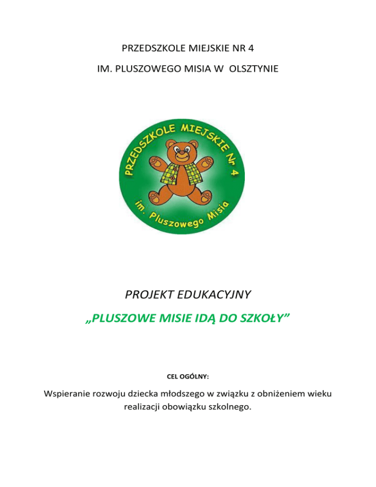 PRZEDSZKOLE MIEJSKIE NR 4 IM. PLUSZOWEGO MISIA W OLSZTYNIE PROJEKT EDUKACYJNY „PLUSZOWE MISIE IDĄ DO SZKOŁY” CEL OGÓLNY: Wspieranie rozwoju dziecka młodszego w związku z obniżeniem wieku realizacji obowiązku szkolnego. WSTĘP Wiek przedszkolny to okres wzmożonej aktywności poznawczej wyrażającej się silną potrzebą intelektualnych wrażeń, dużym napięciem emocjonalnym. Aby wyjść naprzeciw zainteresowaniom dzieci należy przede wszystkim sprawić, aby dziecko czuło się dobrze i bezpiecznie, było akceptowane. W tej atmosferze należy rozbudzać jego zaciekawienie otaczającym światem, rozwijać zainteresowania, inspirować do aktywności tak, by umożliwić pełny rozwój osobowości. Całokształt tych oddziaływań powinien przygotować dzieci do nauki w szkole, czyli do osiągnięcia takiego stanu rozwoju fizycznego, społecznego, umysłowego i emocjonalnego, który umożliwi sprostanie obowiązkom szkolnym. Przejście z przedszkola do szkoły jest dla dziecka ważnym krokiem. Rodzice przeżywają troskę i niepokój o losy swoich dzieci. Przyszli uczniowie obok ciekawości noszą w sobie lęk przed nowym, nieznanym życiem szkolnym. Stąd działania zaplanowane w projekcie zostaną zrealizowane we współpracy środowiska przedszkolnego i szkolnego oraz przy wsparciu specjalistów z Poradni Psychologiczno – Pedagogicznej Nr 2 w Olsztynie. Wezmą w nich udział dzieci i ich rodzice oraz nauczyciele edukacji wczesnoszkolnej i przedszkolnej. CELE SZCZEGÓŁOWE: Podnoszenie poziomu wiedzy rodziców na temat etapu rozwojowego dziecka sześcioletniego oraz posiadanej przez niego dojrzałości szkolnej, tworzenie warunków do poznawania i rozumienia siebie oraz świata przez dziecko, nabywanie umiejętności przez działanie, odnajdywanie swojego miejsca w grupie rówieśniczej, budowanie systemu wartości, niwelowanie dysfunkcji i wzmacnianie mocnych stron dzieci, przybliżenia dzieciom środowiska szkoły, wyrobienie pozytywnego nastawienia do szkoły, zniwelowanie napięcia i stresu związanego z przekroczeniem progu szkoły. ADRESAT PROJEKTU: Dzieci pięcio- i sześcioletnie, rodzice dzieci. METODY I FORMY PRACY: Wycieczki i spacery, obserwacje, metody i narzędzia TOC, gry i zabawy dydaktyczne, filmy edukacyjne, teatrzyki, drama, różnorodne techniki plastyczne, wystawy, testy rysunkowe, praca z książką, czasopismem, praca z obrazkiem, konkursy, quizy, aktywność muzyczna i wokalna, układanki i rebusy. WSPÓŁPRACA ZE ŚRODOWISKIEM : Szkoła Podstawowa Nr 10 w Olsztynie, Poradnia Psychologiczno – Pedagogiczna Nr 2 w Olsztynie, Książnica Polska, Biblioteka Miejska, rodzice, dziadkowie. KORZYŚCI WYNIKAJĄCE Z PROJEKTU 1. DLA DZIECI: Otwartość i pozytywne nastawienie do szkoły, umiejętność rozwiązywania problemów przez działanie, dobre samopoczucie w grupie rówieśniczej, sprawność manualna, grafomotoryczna, gotowość do czytania, umiejętności matematyczne. 2. DLA RODZICÓW: Orientacja w możliwościach i potrzebach edukacyjnych dziecka, umiejętność współpracy z nauczycielami w kierunku niwelowania dysfunkcji i wzmacniania mocnych stron dzieci, niwelowanie napięcia związanego z posłaniem dziecka do klasy pierwszej. 3. DLA PRZEDSZKOLA: Wzmocnienie pozytywnego wizerunku przedszkola jako dobrze przygotowującego do nauki w szkole, promowanie placówki w środowisku lokalnym, wzmocnienie współpracy z instytucjami wspierającymi. Temat Forma Osoba odpowiedzialna Termin realizacji „Moje dziecko u progu szkoły” Spotkanie z pedagogik Poradni PsychologicznoPedagogicznej oraz nauczycielką edukacji wczesnoszkolnej. Dyrektor Gabriela Browarska, nauczycielka Urszula Ptak. Październik 2013 Wyniki badania Skalą Gotowości Szkolnej. Konsultacje indywidualne z rodzicami. Nauczycielki dzieci pięcio- i sześcioletnich. Październik 2013 „Bank dobrych praktyk” Szkoleniowa rada pedagogiczna z udziałem nauczycielek edukacji wczesnoszkolnej. Dyrektor Gabriela Browarska Listopad 2013 „Jak pomóc dziecku w osiągnięciu dojrzałości szkolnej?” Warsztaty z rodzicami. Logopeda Iga Borowicz, terapeuta pedagogiczny Urszula Ptak. Listopad – grudzień 2013 „Poradnik dla rodzica pierwszoklasisty” Folder informacyjny. Nauczycielki przedszkola: Danuta Kłoskowska i Bogumiła Celmer. Styczeń 2014 Uwagi Zajęcia w kilku grupach w zależności od potrzeb rodziców i dzieci. „W szkole też możesz spotkać przyjaciela” – tematyka kompleksowa Zajęcia warsztatowe z udziałem pedagog M. Rozłuckiej oraz nauczycielek grup. Urszula Ptak, Bogumiła Celmer, Danuta Kloskowska. Luty – marzec 2014 „Poznaj z nami szkołę” Udział w dniu otwartym Szkoły Podstawowej nr 10. Bogumiła Celmer, Urszula Ptak. Kwiecień 2014 „Szkoła moich marzeń” Konkurs plastyczny dla dzieci pięcio- i sześcioletnich. Danuta Kloskowska Maj 2014 „Pluszowe Misie idą do szkoły” Zajęcia integracyjne w świetlicy szkolnej z udziałem absolwentów przedszkola. Dyrektor Gabriela Browarska Maj 2014 „Bezpieczna droga do szkoły” Wycieczka utrwalenie zasad bezpiecznego zachowania na ulicy i chodniku. Urszula Ptak, Bogumiła Celmer. Listopad 2013, kwiecień 2014 „Szkoło, szkoło jak się masz?” – podsumowanie projektu. Spektakl słownomuzyczny w wykonaniu dzieci. Urszula Ptak, Bogumiła Celmer, Danuta Kłoskowska. Czerwiec 2014