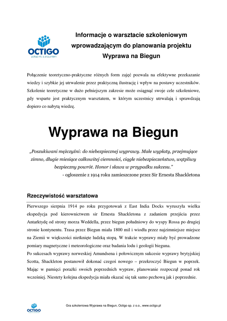 Informacje o warsztacie szkoleniowym wprowadzającym do planowania projektu Wyprawa na Biegun Połączenie teoretyczno-praktyczne różnych form zajęć pozwala na efektywne przekazanie wiedzy i szybkie jej utrwalenie przez praktyczną ilustrację i wpływ na postawy uczestników. Szkolenie teoretyczne w dużo pełniejszym zakresie może osiągnąć swoje cele szkoleniowe, gdy wsparte jest praktycznym warsztatem, w którym uczestnicy utrwalają i sprawdzają dopiero co nabytą wiedzę. Wyprawa na Biegun „Poszukiwani mężczyźni: do niebezpiecznej wyprawy. Małe wypłaty, przejmujące zimno, długie miesiące całkowitej ciemności, ciągłe niebezpieczeństwo, wątpliwy bezpieczny powrót. Honor i sława w przypadku sukcesu.” - ogłoszenie z 1914 roku zamieszczone przez Sir Ernesta Shackletona Rzeczywistość warsztatowa Pierwszego sierpnia 1914 po roku przygotowań z East India Docks wyruszyła wielka ekspedycja pod kierownictwem sir Ernesta Shackletona z zadaniem przejścia przez Antarktydę od strony morza Weddella, przez biegun południowy do wyspy Rossa po drugiej stronie kontynentu. Trasa przez Biegun miała 1800 mil i wiodła przez najzimniejsze miejsce na Ziemii w większości nietknięte ludzką stopą. W trakcie wyprawy miały być prowadzone pomiary magnetyczne i meteorologiczne oraz badania lodu i geologii bieguna. Po sukcesach wyprawy norweskiej Amundsena i połowicznym sukcesie wyprawy brytyjskiej Scotta, Shackleton postanowił dokonać czegoś nowego – przekroczyć Biegun w poprzek. Mając w pamięci porażki swoich poprzednich wypraw, planowanie rozpoczął ponad rok wcześniej. Niestety kolejna ekspedycja miała okazać się tak samo pechową jak i poprzednie. Gra szkoleniowa Wyprawa na Biegun, Octigo sp. z o.o., www.octigo.pl W trakcie szkolenia uczestnicy są wciągani w atmosferę wyprawy polarnej. Historyczna ekspedycja odbywała się w okresie Wielkich Zdobywców Bieguna i uczestnicy, posługując się dostarczonymi materiałami, objaśnieniami trenerów oraz własną pomysłowości wczuwają się w tamte realia i klimat. Dzięki temu, że symulowany projekt miał miejsce ponad 100 lat temu, wiedza merytoryczna uczestników szkolenia o tym projekcie jest na tym samym poziomie, co daje im równe szanse i pozwala nieco puścić wodze fantazji. Z drugiej strony budują emocjonalny stosunek do planowanego projektu. Uczestnicy rywalizują ze sobą w 3 do 4 osobowych zespołach. Zastosowanie Warsztat jest stosowany, jako interesujące wprowadzenie do cyklu szkoleniowego na temat zarządzania projektami. W sposób Szkolenie jednodniowe przekrojowy, a jednocześnie ogólny przybliża wszystkie obszary wiedzy z tego zakresu. Dzięki temu potrafi zaintrygować uczestników i zachęcić do dalszego pogłębiania wiedzy. Pełni równiez funkcję integracyjną grupy na początku programu szkoleniowego. W trakcie dnia na przemian słuchają kolejnych rozdziałów opowieści, planują w toku dyskusji elementy swoich projektów i prezentują na flipchartach swoje osiągnięcia. Pod koniec dnia sala szkoleniowa obwieszona jest arkuszami papieru z planami symulowanych projektów. Wartością dodatkową jest możliwość porównania różnych wizji projektu stworzonych przez poszczególne zespoły. Dla uczestników zaskakujące często jest to, że na podstawie tych samych informacji wejściowych można zaplanować bardzo odmienne projekty. Agenda Dzień szkoleniowy razem z przerwami zaplanowany jest na ok. 8 godzin (zwykle od 9 do 17): 1. Przywitanie uczestników i podzielenie się na grupy 2. Przedstawienie realiów symulowanego projektu i rozdanie materiałów informacyjnych 3. Przerwa kawowa 4. Zaplanowanie pierwszych elementów projektu (cele, koncepcja, analiza udziałowców, zakres) i ich prezentacja 5. Przerwa obiadowa 6. Zaplanowanie reszty projektu (harmonogram, budżet, jakość, ryzyka) Gra szkoleniowa Wyprawa na Biegun, Octigo sp. z o.o., www.octigo.pl 7. Przerwa kawowa 8. Omówienie i porównanie wyników między grupami Korzyści Cele szkoleniowe Wyprawy na Biegun • poziom wiedzy - uczestnik: o zna podstawowe terminy zarządzania projektami: WBS, kamienie milowe, harmonogram, budżet, jakość, cel itd., o zna podstawowe kroki planowania projektu, o rozumie atrybuty SMART celów oraz różnice między produktami, rezultatatmi i oddziaływaniami, • poziom umiejętności - uczestnik: o potrafi planować projekt iteracyjnie, metodą kolejnych uzgadniających się przybliżeń, o potrafi stworzyć spójne cele projektu, ogólny zakres, harmonogram i budżet, o potrafi zaprezentować ogólny plan projektu, • poziom postaw - uczestnik: o ma świadomość wagi planowania projektu, o wie jednak, że planowanie nie zawsze wystarcza, aby skończyć projekt z sukcesem, o docenia istotę tzw. "czynnika ludzkiego" w projekcie. Wiedza merytoryczna na warsztacie przekazywana jest w sposób bardzo jasny i poparta obserwacją samych zachowań uczestników. Nie jest wymagana żadna minimalna wiedza projektowa, warsztat jest dobrym punktem startu dla początkujących członków zespołów projektowych. Gra szkoleniowa Wyprawa na Biegun, Octigo sp. z o.o., www.octigo.pl O prowadzących dr Marcin Żmigrodzki, PgMP (pierwszy w Polsce), PMP Autor kilkudziesięciu artykułów na temat zarządzania, wykładowca na wielu konferencjach i seminariach, wieloletnikierownik projektów, aktualnie dyrektor departamentu projektów i procesów oraz kierownik programu Six Sigma w sektorze finansowym, zdobywca nagrody PMI Award 2007, w 2009 i w 2010 roku za najlepsze na świecie szkolenia z zarządzania projektami Massawa, Mayday Mayday i Most, kierownik projektu wyróżnionego w konkursie Polish Project Excellence Award 2010, kierownik studiów magisterskich z zarządzania projektami na Wyższej Szkole Bankowej. Redaktor bloga o zarządzaniu projektami: www.octigo.pl Paweł Gąsowski – trener biznesu. Kierownik zespołu trenerów w banku. Specjalizuje się w szkoleniach z zarządzania perso