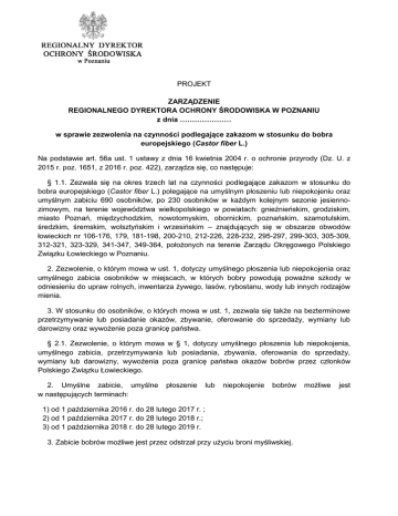 PROJEKT ZARZĄDZENIE REGIONALNEGO DYREKTORA OCHRONY ŚRODOWISKA W POZNANIU z dnia ………………… w sprawie zezwolenia na czynności podlegające zakazom w stosunku do bobra europejskiego (Castor fiber L.) Na podstawie art. 56a ust. 1 ustawy z dnia 16 kwietnia 2004 r. o ochronie przyrody (Dz. U. z 2015 r. poz. 1651, z 2016 r. poz. 422), zarządza się, co następuje: § 1.1. Zezwala się na okres trzech lat na czynności podlegające zakazom w stosunku do bobra europejskiego (Castor fiber L.) polegające na umyślnym płoszeniu lub niepokojeniu oraz umyślnym zabiciu 690 osobników, po 230 osobników w każdym kolejnym sezonie jesiennozimowym, na terenie województwa wielkopolskiego w powiatach: gnieźnieńskim, grodziskim, miasto Poznań, międzychodzkim, nowotomyskim, obornickim, poznańskim, szamotulskim, średzkim, śremskim, wolsztyńskim i wrzesińskim – znajdujących się w obszarze obwodów łowieckich nr 106-176, 179, 181-198, 200-210, 212-226, 228-232, 295-297, 299-303, 305-309, 312-321, 323-329, 341-347, 349-364, położonych na terenie Zarządu Okręgowego Polskiego Związku Łowieckiego w Poznaniu. 2. Zezwolenie, o którym mowa w ust. 1, dotyczy umyślnego płoszenia lub niepokojenia oraz umyślnego zabicia osobników w miejscach, w których bobry powodują poważne szkody w odniesieniu do upraw rolnych, inwentarza żywego, lasów, rybostanu, wody lub innych rodzajów mienia. 3. W stosunku do osobników, o których mowa w ust. 1, zezwala się także na bezterminowe przetrzymywanie lub posiadanie okazów, zbywanie, oferowanie do sprzedaży, wymiany lub darowizny oraz wywożenie poza granicę państwa. § 2.1. Zezwolenie, o którym mowa w § 1, dotyczy umyślnego płoszenia lub niepokojenia, umyślnego zabicia, przetrzymywania lub posiadania, zbywania, oferowania do sprzedaży, wymiany lub darowizny, wywożenia poza granicę państwa okazów bobrów przez członków Polskiego Związku Łowieckiego. 2. Umyślne zabicie, umyślne w następujących terminach: płoszenie lub niepokojenie bobrów 1) od 1 października 2016 r. do 28 lutego 2017 r. ; 2) od 1 października 2017 r. do 28 lutego 2018 r.; 3) od 1 października 2018 r. do 28 lutego 2019 r. 3. Zabicie bobrów możliwe jest przez odstrzał przy użyciu broni myśliwskiej. możliwe jest 4. Wykonanie umyślnego zabicia, o którym mowa w § 1, powinno być ukierunkowane na eliminację całych stanowisk, a nie pojedynczych osobników, w celu uniknięcia rozproszenia się lokalnych populacji i tym samym braku skuteczności odstrzału. § 3.1. Podmiotem odpowiedzialnym za wykonanie zarządzenia i czynności, o których mowa w § 1, jest Zarząd Okręgowy Polskiego Związku Łowieckiego w Poznaniu. 2. Podmiot, o którym mowa w ust. 1, wydaje upoważnienie właściwemu kołu łowieckiemu do dokonania odstrzału bobrów w dzierżawionych obwodach łowieckich. 3. Koło łowieckie upoważnia myśliwych do dokonania odstrzału bobrów w liczbie określonej przez Zarząd Okręgowy Polskiego Związku Łowieckiego w Poznaniu. 4. Osoby, o których mowa w ust. 3, muszą posiadać wiedzę z zakresu ochrony gatunkowej bobra europejskiego i zasad postępowania przy ograniczaniu liczebności populacji bobrów. § 4.1. W terminie do 15 stycznia każdego roku następującego po wejściu w życie niniejszego zarządzenia Zarząd Okręgowy Polskiego Związku Łowieckiego w Poznaniu obowiązany jest do złożenia Regionalnemu Dyrektorowi Ochrony Środowiska w Poznaniu sprawozdania o wykonanych czynnościach w poprzedzającym roku kalendarzowym. 2. Sprawozdanie, o którym mowa w ust. 1, powinno zawierać: numer obwodu łowieckiego, datę pozyskania oraz liczbę odstrzelonych osobników, imię i nazwisko myśliwego, a także możliwie najdokładniejsze lokalizacje miejsc eliminacji poszczególnych osobników, poprzez wskazanie działki ewidencyjnej, obrębu ewidencyjnego, gminy. § 5. Odstrzelone bobry stanowią własność myśliwego dokonującego odstrzału jako częściowa rekompensata kosztów pozyskania. § 6. Zarządzenie wchodzi w życie po upływie 14 dni od dnia ogłoszenia.