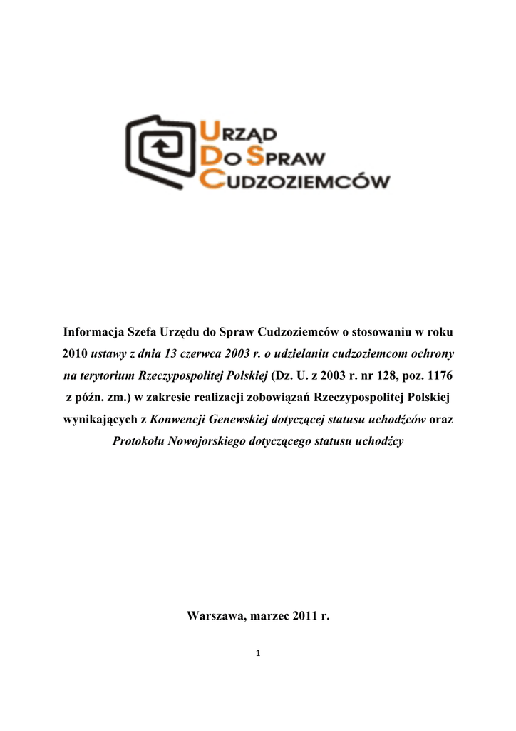 Informacja Szefa Urzędu do Spraw Cudzoziemców o stosowaniu w roku 2010 ustawy z dnia 13 czerwca 2003 r. o udzielaniu cudzoziemcom ochrony na terytorium Rzeczypospolitej Polskiej (Dz. U. z 2003 r. nr 128, poz. 1176 z późn. zm.) w zakresie realizacji zobowiązań Rzeczypospolitej Polskiej wynikających z Konwencji Genewskiej dotyczącej statusu uchodźców oraz Protokołu Nowojorskiego dotyczącego statusu uchodźcy Warszawa, marzec 2011 r. 1 Spis treści: 1. Stan prawny ……………….....………………………………………………........ 3 2. Wykonanie ustawy o udzielaniu cudzoziemcom ochrony na terytorium Rzeczypospolitej Polskiej w zakresie rozpatrywania wniosków o nadanie statusu uchodźcy …….……………………………………..………………….…...……... 5 3. Postępowania o nadanie statusu uchodźcy prowadzone wobec szczególnych grup wnioskodawców ……………….…………………….…………...…………....... 14 4. Postępowanie wobec cudzoziemców nielegalnie przybywających lub przebywających na terytorium Rzeczypospolitej Polskiej …………...…………. 15 5. Pomoc dla cudzoziemców ubiegających się o nadanie statusu uchodźcy …...….. 17 6. Realizacja Konwencji Genewskiej i Protokołu Nowojorskiego w zakresie wydawania uchodźcom dokumentów ………………..……………….....………. 20 7. Współpraca z Wysokim Komisarzem Narodów Zjednoczonych do Spraw Uchodźców …………………………………………………………….....……... 22 8. Realizacja Konwencji Genewskiej oraz Protokołu Nowojorskiego w kontekście przystąpienia Rzeczypospolitej Polskiej do Unii Europejskiej ………...……….. 23 9. Zakończenie ………………………………………….…………….....…………. 27 10. Załączniki (tabele statystyczne) …………………………….………………........ 28 2 1. Stan prawny Konwencja Genewska dotycząca statusu uchodźców, sporządzona w dniu 28 lipca 1951 r. (Dz. U. z 1991 r. nr 119, poz. 515) oraz Protokół Nowojorski dotyczący statusu uchodźców, sporządzony w dniu 31 stycznia 1967 r. (Dz. U. z 1991 r. nr 119, poz. 517) definiują materialno-prawne podstawy nadawania statusu uchodźcy oraz określają najwaŜniejsze prawa i wolności uchodźców. Ww. akty prawne nie precyzują jednakŜe zasad i trybu postępowania w sprawach o nadanie statusu uchodźcy. W Polsce kwestie te reguluje ustawa z dnia 13 czerwca 2003 r. o udzielaniu cudzoziemcom ochrony na terytorium Rzeczypospolitej Polskiej (Dz. U. z 2009 r. nr 189, poz. 1472). W ustawie unormowano takŜe zasady wydawania uchodźcom dokumentów, zasadę non–refoulment, czyli zakaz wydalania uchodźców, oraz zasady współpracy z Wysokim Komisarzem Narodów Zjednoczonych do Spraw Uchodźców. W odrębnych aktach uregulowane zostały w prawie polskim prawa socjalno-bytowe uchodźców. Polska stosuje tzw. jednolitą procedurę azylową. W toku postępowania o nadanie statusu uchodźcy bada się nie tylko spełnianie warunków do uznania za uchodźcę, ale takŜe – w razie stwierdzenia, Ŝe nie są one spełnione – inne okoliczności skutkujące ochroną przed wydaleniem. Cudzoziemcowi, który nie kwalifikuje się do uznania za uchodźcę, lecz który w przypadku powrotu do kraju pochodzenia moŜe być naraŜony na rzeczywiste ryzyko doznania powaŜnej krzywdy, udziela się ochrony w postaci ochrony uzupełniającej. W przypadku odmowy nadania statusu uchodźcy oraz odmowy udzielenia ochrony uzupełniającej, z urzędu badane są przesłanki do udzielenia zgody na pobyt tolerowany. Przesłanki te powiązane są z określonymi normami Konwencji o Ochronie Praw Człowieka i Podstawowych Wolności, sporządzonej w Rzymie w dniu 4 listopada 1950 r. (Dz. U. z 1993 r. nr 61, poz. 284) oraz Konwencji o prawach dziecka, przyjętej przez Zgromadzenie Ogólne Narodów Zjednoczonych w dniu 20 listopada 1989 r. (Dz. U. z 1991 r. Nr 120, poz. 526 oraz z 2000 r. Nr 2, poz. 11). Uznanie natomiast, Ŝe wniosek cudzoziemca nie zasługuje na uwzględnienie ani poprzez nadanie statusu uchodźcy, ani 3 poprzez udzielenie ochrony uzupełniającej oraz zgody na pobyt tolerowany, skutkuje – z wyjątkami określonymi w art. 48 ust. 2 ustawy o udzielaniu cudzoziemcom ochrony na terytorium Rzeczypospolitej Polskiej – orzeczeniem o jego wydaleniu. Rozstrzygnięcie o sytuacji prawnej cudzoziemca następuje więc w toku jednego postępowania, prowadzonego przez jeden organ administracyjny. Począwszy od dnia 20 lipca 2007 r. organem właściwym w sprawach udzielania cudzoziemcom ochrony na terytorium Rzeczypospolitej Polskiej jest Szef Urzędu do Spraw Cudzoziemców, który prowadzi postępowania o nadanie statusu uchodźcy przy pomocy Departamentu Postępowań Uchodźczych. 4 2. Wykonanie ustawy o udzielaniu cudzoziemcom ochrony na terytorium Rzeczypospolitej Polskiej w zakresie rozpatrywania wniosków o nadanie statusu uchodźcy W 2010 r. złoŜono w Rzeczypospolitej Polskiej 3 499 wniosków o nadanie statusu uchodźcy. Wnioskami tymi objęto 6 534 osoby. W porównaniu do roku 2009 nastąpił więc spadek liczby złoŜonych wniosków i objętych nimi osób o około, odpowiednio, 44% oraz 38%. Spowodowane to było przede wszystkim znaczącym zmniejszeniem się liczby obywateli Gruzji ubiegających się o nadanie statusu uchodźcy, o czym będzie mowa w dalszej części niniejszej informacji. Największą grupę osób ubiegających się o nadanie statusu uchodźcy stanowili w 2010 r. obywatele Federacji Rosyjskiej – 4 795 osób (około 73% ogółu), z których 4 084 (około 85% ogółu) zadeklarowało narodowość czeczeńską. Drugą najliczniejszą grupą cudzoziemców ubiegających się o nadanie statusu uchodźcy byli obywatele Gruzji – 1 082 osoby (około 16% ogółu). Ponadto, o status uchodźcy występowali najczęściej 5 obywatele Armenii – 107 osób, Wietnamu – 47 osób, Białorusi – 