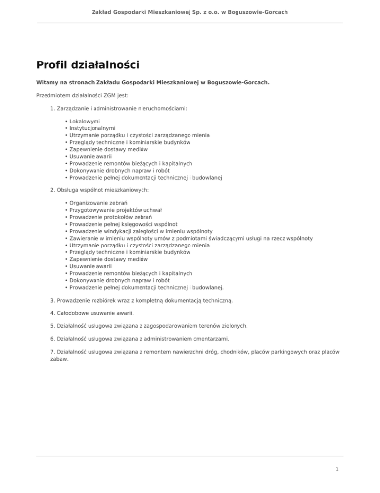 Zakład Gospodarki Mieszkaniowej Sp. z o.o. w Boguszowie-Gorcach Profil działalności Witamy na stronach Zakładu Gospodarki Mieszkaniowej w Boguszowie-Gorcach. Przedmiotem działalności ZGM jest: 1. Zarządzanie i administrowanie nieruchomościami: • Lokalowymi • Instytucjonalnymi • Utrzymanie porządku i czystości zarządzanego mienia • Przeglądy techniczne i kominiarskie budynków • Zapewnienie dostawy mediów • Usuwanie awarii • Prowadzenie remontów bieżących i kapitalnych • Dokonywanie drobnych napraw i robót • Prowadzenie pełnej dokumentacji technicznej i budowlanej 2. Obsługa wspólnot mieszkaniowych: • Organizowanie zebrań • Przygotowywanie projektów uchwał • Prowadzenie protokołów zebrań • Prowadzenie pełnej księgowości wspólnot • Prowadzenie windykacji zaległości w imieniu wspólnoty • Zawieranie w imieniu wspólnoty umów z podmiotami świadczącymi usługi na rzecz wspólnoty • Utrzymanie porządku i czystości zarządzanego mienia • Przeglądy techniczne i kominiarskie budynków • Zapewnienie dostawy mediów • Usuwanie awarii • Prowadzenie remontów bieżących i kapitalnych • Dokonywanie drobnych napraw i robót • Prowadzenie pełnej dokumentacji technicznej i budowlanej. 3. Prowadzenie rozbiórek wraz z kompletną dokumentacją techniczną. 4. Całodobowe usuwanie awarii. 5. Działalność usługowa związana z zagospodarowaniem terenów zielonych. 6. Działalność usługowa związana z administrowaniem cmentarzami. 7. Działalność usługowa związana z remontem nawierzchni dróg, chodników, placów parkingowych oraz placów zabaw. 1