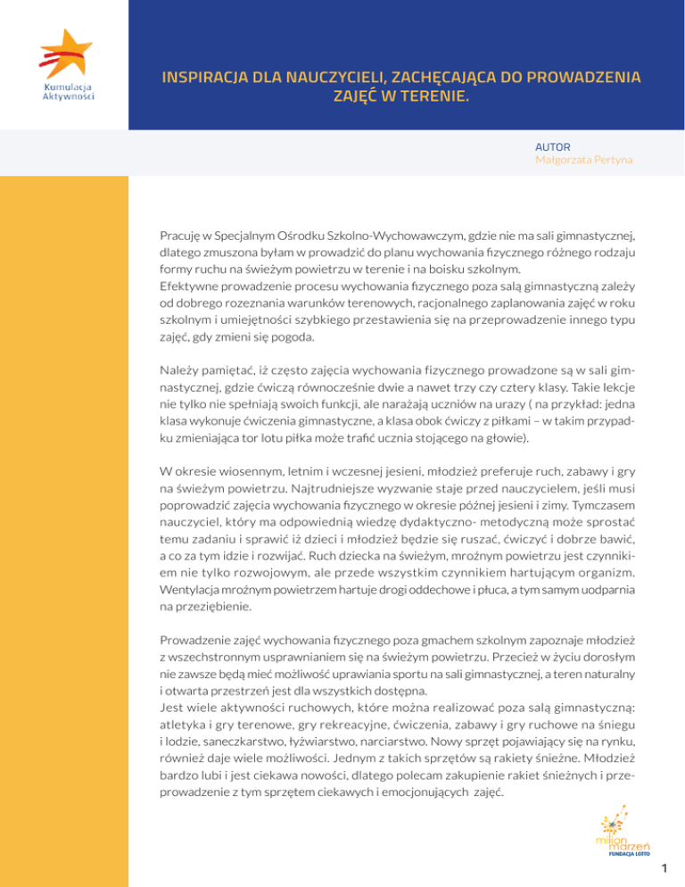 Inspiracja dla nauczycieli, zachęcająca do prowadzenia zajęć w terenie. autor Małgorzata Pertyna Pracuję w Specjalnym Ośrodku Szkolno-Wychowawczym, gdzie nie ma sali gimnastycznej, dlatego zmuszona byłam w prowadzić do planu wychowania fizycznego różnego rodzaju formy ruchu na świeżym powietrzu w terenie i na boisku szkolnym. Efektywne prowadzenie procesu wychowania fizycznego poza salą gimnastyczną zależy od dobrego rozeznania warunków terenowych, racjonalnego zaplanowania zajęć w roku szkolnym i umiejętności szybkiego przestawienia się na przeprowadzenie innego typu zajęć, gdy zmieni się pogoda. Należy pamiętać, iż często zajęcia wychowania fizycznego prowadzone są w sali gimnastycznej, gdzie ćwiczą równocześnie dwie a nawet trzy czy cztery klasy. Takie lekcje nie tylko nie spełniają swoich funkcji, ale narażają uczniów na urazy ( na przykład: jedna klasa wykonuje ćwiczenia gimnastyczne, a klasa obok ćwiczy z piłkami – w takim przypadku zmieniająca tor lotu piłka może trafić ucznia stojącego na głowie). W okresie wiosennym, letnim i wczesnej jesieni, młodzież preferuje ruch, zabawy i gry na świeżym powietrzu. Najtrudniejsze wyzwanie staje przed nauczycielem, jeśli musi poprowadzić zajęcia wychowania fizycznego w okresie późnej jesieni i zimy. Tymczasem nauczyciel, który ma odpowiednią wiedzę dydaktyczno- metodyczną może sprostać temu zadaniu i sprawić iż dzieci i młodzież będzie się ruszać, ćwiczyć i dobrze bawić, a co za tym idzie i rozwijać. Ruch dziecka na świeżym, mroźnym powietrzu jest czynnikiem nie tylko rozwojowym, ale przede wszystkim czynnikiem hartującym organizm. Wentylacja mroźnym powietrzem hartuje drogi oddechowe i płuca, a tym samym uodparnia na przeziębienie. Prowadzenie zajęć wychowania fizycznego poza gmachem szkolnym zapoznaje młodzież z wszechstronnym usprawnianiem się na świeżym powietrzu. Przecież w życiu dorosłym nie zawsze będą mieć możliwość uprawiania sportu na sali gimnastycznej, a teren naturalny i otwarta przestrzeń jest dla wszystkich dostępna. Jest wiele aktywności ruchowych, które można realizować poza salą gimnastyczną: atletyka i gry terenowe, gry rekreacyjne, ćwiczenia, zabawy i gry ruchowe na śniegu i lodzie, saneczkarstwo, łyżwiarstwo, narciarstwo. Nowy sprzęt pojawiający się na rynku, również daje wiele możliwości. Jednym z takich sprzętów są rakiety śnieżne. Młodzież bardzo lubi i jest ciekawa nowości, dlatego polecam zakupienie rakiet śnieżnych i przeprowadzenie z tym sprzętem ciekawych i emocjonujących zajęć. 1 Podstawowe zasady, które muszą być zachowane aby lekcje na świeżym powietrzu spełniały swoje funkcje: 1. Młodzież musi posiadać właściwy do warunków atmosferycznych strój i obuwie. (Przyczyną przeziębień jest przegrzanie, aż do spocenia się, spowodowane zbyt ciepłym ubiorem, a następnie nagłe intensywne oziębienie w bezruchu). 2. Im zimniej, tym bezwzględniej należy przestrzegać zasady ciągłości ruchu. (Nie może być podczas lekcji przerw, tylko ruch mniejszym i większym natężeniu. 3. Pamiętajmy, iż dziecko rozgrzewa się przez ruch, dlatego w lekcji nie może być bezruchu, dzieci powinny wypoczywać w czasie ćwiczeń i zabaw o mniejszym natężeniu wysiłku fizycznego. 4. Wybierajmy takie zabawy i gry, w których udział biorą wszystkie dzieci jednocześnie. 5. Aby uniknąć przestojów na tłumaczenie przepisów, stosujmy zabawy i gry proste, albo znane dzieciom. 6. Czynnikiem wyzwalającym samoistny ruch jest czynnik emocjonalny, dlatego pamiętajmy o współzawodnictwu i rywalizacji indywidualnej czy grupowej. Pozwala to też młodzieży w wieku gimnazjalnym rozładować stres, impulsywność i zmienność nastrojów. 2
