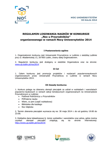 REGULAMIN LOSOWANIA NAGRÓD W KONKURSIE „Noc u Przyrodników” organizowanego w ramach Nocy Uniwersytetów 2014 I Postanowienia ogólne 1. Organizatorem konkursu jest Uniwersytet Przyrodniczy w Lublinie z siedzibą Lublinie przy ul. Akademickiej 13, 20-950 Lublin, zwany dalej Organizatorem. 2. Regulamin konkursu jest dostępny w siedzibie Organizatora oraz na stronie: www.up.lublin.pl/noc2014. II Cel 1. Celem konkursu jest promocja projektów i wydarzeń popularnonaukowych organizowanych przez Uniwersytet Przyrodniczy w Lublinie w ramach Nocy Uniwersytetów 2014. III Zasady konkursu 1. Konkurs polega na zbieraniu stempli pieczątek za udział w wykładach i warsztatach popularno-naukowych w ramach sekcji tematycznych organizowanych na Uniwersytecie Przyrodniczym w Lublinie: Festiwal Podróżniczy u Przyrodników POPularna nauka Wiem, co jem (część wykładowa) Biblioteka dla każdego Noc Głęboka 2. Termin zbierania pieczątek wyznacza się na: 30 maja 2014 r. do od godziny 19:00 do 23:00. 3. Dokładne dane teleadresowe tj. tytuły wykładów i warsztatów oraz adres, gdzie można uzyskać stempel pieczątki znajdują się na stronie internetowej: http://www.up.lublin.pl/noc2014/ 4. Pieczątki należy zbierać na kartach, które będą dostępne w siedzibie Organizatora w dniu 30 maja br. przed salami będącymi miejscem wydarzeń. Pieczątki będą podbijane każdorazowo po zakończeniu wykładu lub warsztatu osobom w nim uczestniczącym. 5. Po wypełnieniu karty tj. zdobyciu minimum dwóch pieczątek oraz podpisaniu swoim imieniem i nazwiskiem, stanowi ona kupon konkursowy. IV Warunki uczestnictwa 1. Konkurs ma charakter lokalny i jest otwarty dla wszystkich osób fizycznych, za wyjątkiem osób wymienionych w części VI, punkt 2. 2. Osoby niepełnoletnie, które biorą udział w konkursie, muszą na karcie uzyskać pisemną zgodę rodziców bądź prawnych opiekunów na udział w konkursie. 3. Warunkiem uczestnictwa w konkursie jest wrzucenie kuponu konkursowego do urny znajdującej się przed salą 301, budynek AGRO II, ul, Akademicka 15, Lublin, do godziny 23:00. 4. Każdy uczestnik konkursu może złożyć tylko jeden kupon konkursowy. 5. Losowanie zostanie przeprowadzone przez komisję konkursową podczas oficjalnego zakończenia wydarzeń Nocy Uniwersytetów na Uniwersytecie Przyrodniczym w Lublinie o godzinie 23:05, w sali 301, budynek AGRO II, ul, Akademicka 15, Lublin. 6. Odbiór wygranej nastąpi bezpośrednio w trakcie oficjalnego W przypadku nieobecności osoby, której kupon konkursowy zostanie nagroda wraca do puli i stanowi przedmiot ponownego losowania, aż wręczenia jej osobie, której kupon konkursowy zostanie wylosowany i obecna na sali. zakończenia. wylosowany, do momentu która będzie 7. Zwycięzca nagrody zobowiązany jest do podpisania protokołu przekazania nagrody, który będzie dostarczony przez Organizatora wraz z nagrodą. V Nagrody 1. Nagrodami w konkursie są cztery czytniki książek – ebooki marki KINDLE. Wszystkie nagrody są równorzędne. Jeden uczestnik konkursu może wygrać tylko jedną nagrodę. 2. Nagrody nie podlegają zamianie na inne ani zamianie na ekwiwalent pieniężny. VI Postanowienia końcowe 1. W sprawach nieujętych w niniejszym regulaminem, jak również o zapisach regulaminu budzących wątpliwości rozstrzygać będzie Organizator. 2. Z udziału w Konkursie są wykluczeni pracownicy Organizatora bezpośrednio zaangażowani w przeprowadzenie wydarzeń organizowanych w ramach Nocy Uniwersytetów na Uniwersytecie Przyrodniczym w Lublinie jako koordynatorzy, prelegenci lub osoby wspierające przeprowadzenie konkursu. 2.1. Organizator nie jest obowiązany do uzyskania od uczestników Konkursu pisemnych oświadczeń dotyczących spełnienia powyższego warunku. 3. Organizator zastrzega sobie prawo do przerwania lub odwołania konkursu bez podania przyczyn. Informacja o ewentualnych zmianach będzie publikowana wyłącznie na stronie internetowej www.up.lublin.pl/noc2014 4. Udział w konkursie jest równoznaczny z wyrażeniem przez osoby uczestniczące zgody na przetwarzanie przez Organizatora ich danych osobowych na potrzeby konkursu oraz w celach marketingowych Organizatora /ustawa z dnia 29.08.1997 r. o ochronie danych osobowych (Dz. U. Nr 101 poz. 926 z póz. zm.). Osoby uczestniczące w konkursie potwierdzają swoją zgodę na powyższe w formie złożenia do Organizatora wypełnionego i podpisanego kuponu konkursowego. 5. Regulamin wchodzi w życie z dniem: 26.05.2014 r.