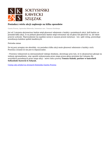 Posiadacz wielu akcji zagłosuje na kilka sposobów Gazeta Prawna, Agnieszka Bobowska, komentarz mec. Tomasza Kańskiego Już od 3 sierpnia akcjonariusz będzie mógł głosować odmiennie z każdej z posiadanych akcji. Jeśli będzie on posiadał kilka akcji, to na jednym głosowaniu będzie mógł wstrzymać się od głosu lub głosować za, ale także przeciw uchwale. Wprowadzenie tej zupełnie nowej w naszym prawie instytucji – tzw. split voting, przewiduje nowelizacja kodeksu spółek handlowych. Potrzeba zmian Do tej pory przepisy nie określały, czy posiadacz kilku akcji może głosować odmiennie z każdej z nich. Prawnicy uważali że nie jest to dopuszczalne. – Prawnicy wskazywali na nieracjonalność takiego działania, akcentując przy tym, że to akcjonariusz głosuje na walnym zgromadzeniu, więc sposób wykonywania przez niego prawa głosu powinien być tożsamy dla wszystkich posiadanych przez niego akcji – mówi radca prawny Tomasz Kański, partner w kancelarii Sołtysiński Kawecki & Szlęzak. Czytaj cały artykuł na stronach Dziennika Gazeta Prawna