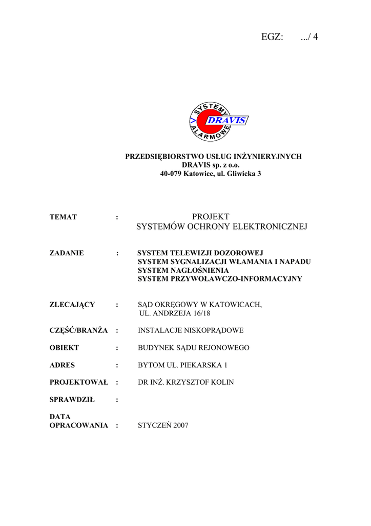 EGZ: .../ 4 PRZEDSIĘBIORSTWO USŁUG INŻYNIERYJNYCH DRAVIS sp. z o.o. 40-079 Katowice, ul. Gliwicka 3 TEMAT : PROJEKT SYSTEMÓW OCHRONY ELEKTRONICZNEJ ZADANIE : SYSTEM TELEWIZJI DOZOROWEJ SYSTEM SYGNALIZACJI WŁAMANIA I NAPADU SYSTEM NAGŁOŚNIENIA SYSTEM PRZYWOŁAWCZO-INFORMACYJNY ZLECAJĄCY : SĄD OKRĘGOWY W KATOWICACH, UL. ANDRZEJA 16/18 CZĘŚĆ/BRANŻA : INSTALACJE NISKOPRĄDOWE OBIEKT : BUDYNEK SĄDU REJONOWEGO ADRES : BYTOM UL. PIEKARSKA 1 PROJEKTOWAŁ : SPRAWDZIŁ DR INŻ. KRZYSZTOF KOLIN : DATA OPRACOWANIA : STYCZEŃ 2007 SYSTEMY OCHRONY ELEKTRONICZNEJ SPIS TREŚCI 1. 2. 3. 4. 5. PRZEDMIOT OPRACOWANIA CHARAKTERYSTYKA OBIEKTU PODSTAWY CHARAKTERYSTYKA ZAGROŻEŃ OPIS TECHNICZNY 5.1. SYSTEM SYGNALIZACJI WŁAMANIA I NAPADU 5.1.1. Opis systemu 5.1.2. Zestawienie sprzętu 5.1.3. Wskazówki montażowe 5.1.4. Konserwacja i kontrola 5.2. SYSTEM TELEWIZJI DOZOROWEJ 5.2.1. Opis systemu 5.2.2. Zestawienie sprzętu 5.2.3. Wskazówki montażowe 5.2.4. Konserwacja i kontrola 5.3. SYSTEM NAGŁOŚNIENIA 5.3.1. Opis systemu 5.3.2. Sprzętu 5.4. SYSTEM PRZYWOŁAWCZO INFORMACYJNY 5.5. KONTROLA WJAZDU NA PARKINGI 6. RYSUNKI Przedsiębiorstwo Usług Inżynieryjnych DRAVIS sp. z o.o. 40-079 Katowice, ul. Gliwicka 3 SYSTEMY OCHRONY ELEKTRONICZNEJ Przedsiębiorstwo Usług Inżynieryjnych DRAVIS sp. z o.o. 40-079 Katowice, ul. Gliwicka 3 SYSTEMY OCHRONY ELEKTRONICZNEJ RYSUNKI 1 2 3 4 5 6 7 8 9 10 11 13 14. segment AB - piwnica segment C - piwnica segment C – parter segment AB – parter segment C – I piętro segment AB – I piętro segment C – II piętro segment AB – II piętro segment E schemat ideowy systemu SWiN schemat ideowy systemy TVD Zestaw przyzywowy Rozmieszczenie kamer zewnętrznych Przedsiębiorstwo Usług Inżynieryjnych DRAVIS sp. z o.o. 40-079 Katowice, ul. Gliwicka 3 SYSTEMY OCHRONY ELEKTRONICZNEJ 1. PRZEDMIOT OPRACOWANIA. Przedmiotem opracowania jest projekt wykonawczy systemów elektronicznej ochrony mienia dla budynku Sądu Rejonowego w Bytomiu przy ul Piekarskiej 1; - systemu telewizji dozorowej systemu sygnalizacji włamania i napadu systemu nagłośnienia systemu przywoławczo-informacyjnego 2. CHARAKTERYSTYKA OBIEKTU Budynek wzniesiony w połowie XIX wieku, przebudowany w roku 1894 w centralnej zabudowie śródmiejskiej. Budynek przylega do zakładu karnego z którym był połączony przejściem na poziomie piwnicy. Konstrukcja z cegły, Pięć kondygnacji: piwnice, parter, dwa piętra użytkowe, wysokie poddasze. Wewnętrzny dziedziniec przykryty świetlikiem. Dwie główne klatki schodowe, klatki schodowe wewnętrzne także pomiędzy kondygnacjami. Kilka szerokich szybów wentylacyjnych na całej wysokości budynku. Duże nieużytkowe poddasze Do budynku prowadzi frontowe wejscie główne, dwa frontowe wejścia boczne prowadzące przez klaki schodowe do sal rozpraw na I piętrze, boczne wyjście na parking, boczne wyjścia gospodarczo-techniczne na poziomie przyziemia . Parkingi pracownicze odgrodzone i położone po dwóch stronach budynku. Parking konwoju – przed wejściem głównym. 3. PODSTAWY - Podkłady architektoniczno - budowlane w skali 1:100; - Wytyczne i normy branżowe - Katalogi techniczne sprzętu alarmowego. 4. CHARAKTERYSTYKA ZAGROŻEŃ W obiekcie wyróżniono następujące rodzaje zagrożeń; - włamania do archiwów i magazynów, - włamania do pomieszczeń technicznych systemu teleinformatycznego, - akty terroryzmu, - możliwość działania w porze nocnej z ukrycia ; - piwnice, - poddasze, - toalety, - nieuczęszczane klatki schodowe. Ponadto występują charakterystyczne zagrożenia aktami agresji ukierunkowanej na pracowników wymiaru sprawiedliwości ; na salach sądowych, przed salami sądowymi, w bezpośrednim otoczeniu budynku Jako środki ograniczające skutki powyższych zagrożeń przewidziano system monitorowania wizyjnego za pomocą sieci kamer TV, sieć detektorów ruchu oraz przyciski przywołania interwencji ochrony fizycznej obiektu. 5. OPIS TECHNICZNY Przedsiębiorstwo Usług Inżynieryjnych DRAVIS sp. z o.o. 40-079 Katowice, ul. Gliwicka 3 SYSTEMY OCHRONY ELEKTRONICZNEJ 5.1. SYSTEM SYGNALIZACJI WŁAMANIA I NAPADU 5.1.1. Opis systemu System oparty na centrali wielofunkcyjnej typu Integra firmy Satel o strukturze rozproszonej. Na każdej kondygnacji rozmieszczone są trzy moduły rozszerzeń linii wejściowych połączone z centralą główną kablem – skrętką ekranowaną. Detekcję ruchu w przestrzeniach chronionych przewidziano za pomocą pasywnych czujek podczerwieni. Rozmieszczenie czujek uwzględnia ochronę pomieszczeń: - serwerowni głównej i węzłów systemu telekomunikacyjnego, kasy, kancelarii tajnej, oraz - tras komunikacyjnych i miejsc umożliwiających przeniknięcie z ukrycia: wewnętrzne, nieuczęszczane klatki schodowe, wejścia na poddasze, węzły komunikacyjne w przyziemiu . Dodatkowo, wizyjny detektor ruchu w programowalnych sektorach jest integralną funkcją systemu telewizji dozorowej. Zasadniczą częścią systemu są bezprzewodowe przyciski przywoławcze rozmieszczone w salach rozpraw , pokojach sędziowskich, pokojach przewodniczących wydziałów, w gabinecie prezesa i wiceprezesów oraz w innych miejscach wskazanych przez administrację obiektu. Sygnał z przycisku jest odbierany przez odbiorniki rozmieszczone na kondygnacjach, zaprogramowane na odbiór indywidualnych kodów cyfrowych nadajnika przypisanego do pomieszczenia. Odbiorniki połączone są z odpowiednimi ekspanderami centrali alarmowej na kondygnacjach. 5.1.2. Zestawienie sprzętu lp 1 2 3 3 4 5 6 7 sprzęt centrala alarmowa Integra 164 ekspander z zasilaczem koder cyfrowy ekspander odbiornik 20 kanałowy ELMES nadajnik – pilot w obudowie naściennej pasywna czujka podczerwieni sygnalizator wewnętrzny a/o liczba 1 9 6 2 9 70 20 2 5.1.3. Wskazówki montażowe. Wykonanie systemu należy zlecić wyłącznie przedsiębiorstwu specjalistycznemu, posiadającemu koncesję MSWiA oraz doświadczenie w realizacji podobnych systemów. Bezprzew