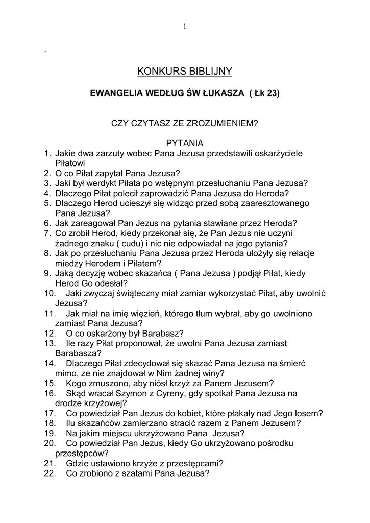 1 . KONKURS BIBLIJNY EWANGELIA WEDŁUG ŚW ŁUKASZA ( Łk 23) CZY CZYTASZ ZE ZROZUMIENIEM? PYTANIA 1. Jakie dwa zarzuty wobec Pana Jezusa przedstawili oskarżyciele Piłatowi 2. O co Piłat zapytał Pana Jezusa? 3. Jaki był werdykt Piłata po wstępnym przesłuchaniu Pana Jezusa? 4. Dlaczego Piłat polecił zaprowadzić Pana Jezusa do Heroda? 5. Dlaczego Herod ucieszył się widząc przed sobą zaaresztowanego Pana Jezusa? 6. Jak zareagował Pan Jezus na pytania stawiane przez Heroda? 7. Co zrobił Herod, kiedy przekonał się, że Pan Jezus nie uczyni żadnego znaku ( cudu) i nic nie odpowiadał na jego pytania? 8. Jak po przesłuchaniu Pana Jezusa przez Heroda ułożyły się relacje miedzy Herodem i Piłatem? 9. Jaką decyzję wobec skazańca ( Pana Jezusa ) podjął Piłat, kiedy Herod Go odesłał? 10. Jaki zwyczaj świąteczny miał zamiar wykorzystać Piłat, aby uwolnić Jezusa? 11. Jak miał na imię więzień, którego tłum wybrał, aby go uwolniono zamiast Pana Jezusa? 12. O co oskarżony był Barabasz? 13. Ile razy Piłat proponował, że uwolni Pana Jezusa zamiast Barabasza? 14. Dlaczego Piłat zdecydował się skazać Pana Jezusa na śmierć mimo, ze nie znajdował w Nim żadnej winy? 15. Kogo zmuszono, aby niósł krzyż za Panem Jezusem? 16. Skąd wracał Szymon z Cyreny, gdy spotkał Pana Jezusa na drodze krzyżowej? 17. Co powiedział Pan Jezus do kobiet, które płakały nad Jego losem? 18. Ilu skazańców zamierzano stracić razem z Panem Jezusem? 19. Na jakim miejscu ukrzyżowano Pana Jezusa? 20. Co powiedział Pan Jezus, kiedy Go ukrzyżowano pośrodku przestępców? 21. Gdzie ustawiono krzyże z przestępcami? 22. Co zrobiono z szatami Pana Jezusa? 2 23. W jaki sposób poszczególne grupy społeczne szydziły z Pana Jezusa na krzyżu? 24. W jaki sposób „ dobry Łotr” zasłużył sobie na niebo? 25. Co Pan Jezus obiecał „ dobremu Łotrowi”? 26. Od której do której godziny umierał Pan Jezus? 27. O której godzinie umarł Pan Jezus 28. Której godzinie współczesnego czasu odpowiada biblijna godzina dziewiąta? 29. Jakie znaki towarzyszyły śmierci Pana Jezusa_ 30. Jakie zdanie wypowiedział Pan Jezus w momencie śmierci? 31. Kto w momencie śmierci Pana Jezusa powiedział: "Istotnie, człowiek ten był sprawiedliwy". 32. Jak zareagowali na śmierć Pana Jezusa ci, którzy ja oglądali? 33. Kogo poproszono o ciało Pana Jezusa? 34. Kto poprosił Piłata o ciało Pana Jezusa? 35. Kim był Józef z Arymatei? 36. Gdzie pochowano ciało Pana Jezusa? 37. Kiedy i o jakiej porze zdjęto ciało Pana Jezusa z krzyża? 38. Dlaczego kobiety nie namaściły ciała Pana Jezusa, chociaż miały przygotowane wonności? KONKURS BIBLIJNY EWANGELIA WEDŁUG ŚW ŁUKASZA (Łk 23) CZY CZYTASZ ZE ZROZUMIENIEM? KLUCZ DO ODPOWIEDZI 1. 2. 3. 4. 5. 6. Zaczęli oskarżać Go: "Stwierdziliśmy, że ten człowiek podburza nasz naród, że odwodzi od płacenia podatków Cezarowi i że siebie podaje za Mesjasza – Króla Nastawali i mówili: "Podburza lud, szerząc swą naukę po całej Judei, od Galilei, gdzie rozpoczął, aż dotąd". Piłat zapytał Go: "Czy Ty jesteś Królem żydowskim? Piłat więc oświadczył arcykapłanom i tłumom: "Nie znajduję żadnej winy w tym człowieku Ponieważ był Galilejczykiem Od dawna bowiem chciał Go ujrzeć, ponieważ słyszał o Nim i spodziewał się, że zobaczy jaki znak, zdziałany przez Niego Jezus nic mu nie odpowiedział 3 7. Wzgardził Nim Herod wraz ze swoją strażą; na pośmiewisko kazał ubrać Go w lśniący płaszcz i odesłał do Piłata 8. W tym dniu Herod i Piłat stali się przyjaciółmi. Przedtem bowiem żyli z sobą w nieprzyjaźni. 9. Ponieważ nie uważał, aby Jezus był winny postanowił Go wychłostać i uwolnić. 10. Uwalniano jednego więźnia na święta Paschy 11. Barabasz 12. Był on wtrącony do więzienia za jakiś rozruch powstały w mieście i za zabójstwo. 13. 3 14. Lecz oni nalegali z wielkim wrzaskiem, domagając się, aby Go ukrzyżowano; i wzmagały się ich krzyki 15. Szymona z Syreny 16. Z pola 17. Jezus zwrócił się do nich i rzekł: "Córki jerozolimskie, nie płaczcie nade Mną; płaczcie raczej nad sobą i nad waszymi dziećmi! Oto bowiem przyjdą dni, kiedy mówić będą: "Szczęśliwe niepłodne łona, które nie rodziły, i piersi, które nie karmiły". Wtedy zaczną wołać do gór: Padnijcie na nas; a do pagórków: Przykryjcie nas! Bo jeśli z zielonym drzewem to czynią, cóż się stanie z suchym 18. Dwóch 19. Na miejscu zwanym „Czaszką” 20. Jezus mówił: "Ojcze, przebacz im, bo nie wiedzą, co czynią". 21. Przestępców ukrzyżowano jednego po prawej, a drugiego po lewej stronie Jezusa. 22. Żołnierze rozdzielili między siebie Jego szaty, rzucając losy. 23. Członkowie Wysokiej Rady drwiąco mówili: "Innych wybawiał, niechże teraz siebie wybawi, jeśli On jest Mesjaszem, Wybrańcem Bożym". Żołnierze; podchodzili do Niego i podawali Mu ocet, mówiąc: "Jeśli Ty jesteś królem żydowskim, wybaw sam siebie". Był nad Nim napis w języku greckim, łacińskim i hebrajskim: "To jest Król Żydowski Jeden ze złoczyńców, których [tam] powieszono, urągał Mu: "Czy Ty nie jesteś Mesjaszem? Wybaw więc siebie i nas" 24. Wyznał wiarę w to że Jezus Jest Bogiem, kiedy powiedział do „ złego Łotra": ”Ty nawet Boga się nie boisz, chociaż tę samą karę ponosisz? Wyraził żal za popełnione zło: My przecież - sprawiedliwie, odbieramy bowiem słuszną karę za nasze uczynki, ale On nic złego nie uczynił". 4 Prosił Jezusa o wstawiennictwo "Jezu, wspomnij na mnie, gdy przyjdziesz do swego królestwa". 25. Jezus mu odpowiedział: "Zaprawdę, powiadam ci: Dziś ze Mną będziesz w raju". 26. Było już około godziny szóstej i mrok ogarnął całą ziemię aż do godziny dziewiątej. 27. O dziewiątej godzinie dnia 28. Piętnastej 29. mrok ogarnął całą ziemię aż do godziny dziewiątej. Słońce się zaćmiło zasłona przybytku rozdarła się przez ś