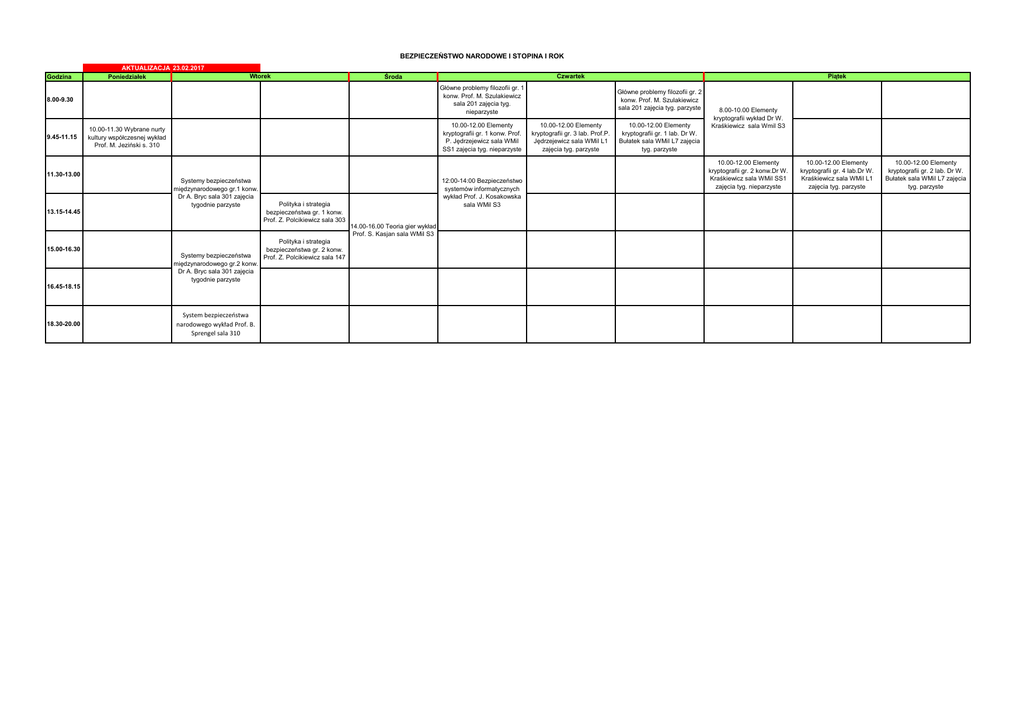 BEZPIECZEŃSTWO NARODOWE I STOPINA I ROK Godzina AKTUALIZACJA 23.02.2017 Poniedziałek Wtorek Środa 8.00-9.30 9.45-11.15 10.00-12.00 Elementy kryptografii gr. 1 konw. Prof. P. Jędrzejewicz sala WMiI SS1 zajęcia tyg. nieparzyste 11.30-13.00 10.00-11.30 Wybrane nurty kultury współczesnej wykład Prof. M. Jeziński s. 310 Systemy bezpieczeństwa międzynarodowego gr.1 konw. Dr A. Bryc sala 301 zajęcia tygodnie parzyste 13.15-14.45 15.00-16.30 Polityka i strategia bezpieczeństwa gr. 2 konw. Systemy bezpieczeństwa Prof. Z. Polcikiewicz sala 147 międzynarodowego gr.2 konw. Dr A. Bryc sala 301 zajęcia tygodnie parzyste 16.45-18.15 18.30-20.00 Polityka i strategia bezpieczeństwa gr. 1 konw. Prof. Z. Polcikiewicz sala 303 System bezpieczeństwa narodowego wykład Prof. B. Sprengel sala 310 12:00-14:00 Bezpieczeństwo systemów informatycznych wykład Prof. J. Kosakowska sala WMil S3 14.00-16.00 Teoria gier wykład Prof. S. Kasjan sala WMiI S3 Piątek Czwartek Główne problemy filozofii gr. 1 konw. Prof. M. Szulakiewicz sala 201 zajęcia tyg. nieparzyste Główne problemy filozofii gr. 2 konw. Prof. M. Szulakiewicz sala 201 zajęcia tyg. parzyste 10.00-12.00 Elementy kryptografii gr. 3 lab. Prof.P. Jędrzejewicz sala WMiI L1 zajęcia tyg. parzyste 10.00-12.00 Elementy kryptografii gr. 1 lab. Dr W. Bułatek sala WMiI L7 zajęcia tyg. parzyste 8.00-10.00 Elementy kryptografii wykład Dr W. Kraśkiewicz sala Wmil S3 10.00-12.00 Elementy kryptografii gr. 2 konw.Dr W. Kraśkiewicz sala WMiI SS1 zajęcia tyg. nieparzyste 10.00-12.00 Elementy kryptografii gr. 4 lab.Dr W. Kraśkiewicz sala WMiI L1 zajęcia tyg. parzyste 10.00-12.00 Elementy kryptografii gr. 2 lab. Dr W. Bułatek sala WMiI L7 zajęcia tyg. parzyste