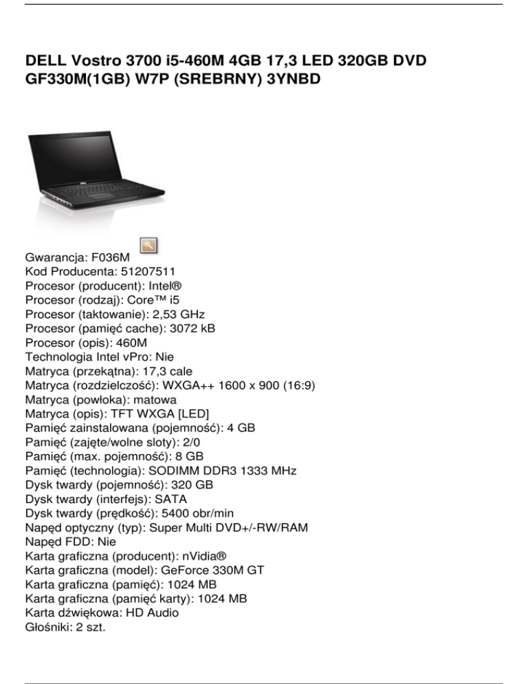 DELL Vostro 3700 i5-460M 4GB 17,3 LED 320GB DVD GF330M(1GB)