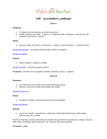 AIP – przykładowy jadłospis Dzień I Śniadanie 2,3 plastry boczku smażone na oleju kokosowym sałatka: ulubiony mix sałat - 2 garście, 3 rzodkiewki (lub 1 kalarepa), 1 marchewka, pół awokado, łyżka oliwy z oliwek Obiad pieczone udka z kurczaka z rozmarynem + sałatka z tartych buraków + 2 ogórki kiszone Przepis na kurczaka - wyrzucamy jedynie pieprz ziołowy z przypraw Przepis na sałatkę Kolacja frytki z batatów z udkiem z obiadu Przepis na frytki - wyrzucamy pieprz ziołowy Przekąska - dowolne owoce jagodowe (maliny, borówki, jeżyny) - 2 garście Dzień II Śniadanie 2 kawałki pieczonej szynki (lub innego ulubionego mięsa) duszone warzywa na maśle klarowanym lub smalcu Przepis na warzywa Obiad czosnkowe żeberka z duszonymi warzywami ze śniadania Przepis na żeberka Kolacja warzywne wstążki: 2 marchewki, 2 pietruszki, łyżka oleju kokosowego, łyżka mleka kokosowego, sól, czosnek. Warzywa obieramy i kroimy obieraczką na wstążki. Rozgrzewamy na patelni olej i dusimy warzywa kilka minut. Dodajemy mleko kokosowe, sól, czosnek, zioła prowansalskie. Przekąska - jabłko Dzień III Śniadanie zupa warzywna + plaster pieczonej szynki Przepis na zupę - w przyprawach nie dodajemy pieprzu i ziela angielskiego Obiad czosnkowe żeberka z kapustą kiszoną Kolacja gulasz z żołądków drobiowych Przepis na gulasz Przekąska - smoothie: mleko kokosowe, jarmuż, szpinak, parę kawałków świeżego ananasa, kiwi Dzień IV Śniadanie gulasz z żołądków drobiowych Obiad cukiniowe tagliatelle z krewetkami Przepis na tagliatelle Kolacja kasztanowo-bananowe placuszki z owocami jagodowymi (maliny, truskawki, jeżyny, borówki) Przepis na placuszki Przekąska - jabłka pieczone z cynamonem Dzień V Śniadanie 3 plastry pieczonego boczku sałatka: ulubiony mix sałat - 2 garście, 3 rzodkiewki (lub 1 kalarepa), 1 marchewka, pół awokado, łyżka oliwy z oliwek Przepis na boczek Obiad stek z tuńczyka w kokosowej panierce (lub inna ryba) z duszonymi warzywami (cukinia, cebula, pieczarki) Przepis na rybę Kolacja 3 plastry pieczonego boczku surowe warzywa pokrojone w słupki, kawałki: marchewka, rzodkiewka, ogórek, kalarepa Przekąska - garść ulubionych suszonych owoców (koniecznie niesiarkowane!) Dzień VI Śniadanie sardynki sałatka: mix sałat + ulubione warzywa (rzodkiewka, ogórek, marchew, cykoria) + sos Sos cytrynowy z bazylią i oregano sok z całej cytryny 1 łyżka posiekanej bazylii 1 łyżka oregano 1/4 szklanki oliwy z oliwek łyżeczka czosnku w proszku sól do smaku Obiad pulpety z sosem koperkowym + duszone warzywa (marchew, pieczarki, jarmuż) Przepis na pulpety Kolacja owoce z mlekiem kokosowym Przepis na owoce Przekąska - Banan Dzień VII Śniadanie 2,3 plastry boczku smażone na oleju kokosowym 2 ogórki kiszone + surowe warzywa pokrojone w słupki, kawałki: rzodkiewka, ogórek, kalarepa Obiad zapiekanka brokułowo-kalafiorowa Przepis na zapiekankę Kolacja pulpety z sosem koperkowym + kapusta kiszona Przekąska - kilka białych czekoladek Przepis na czekoladki