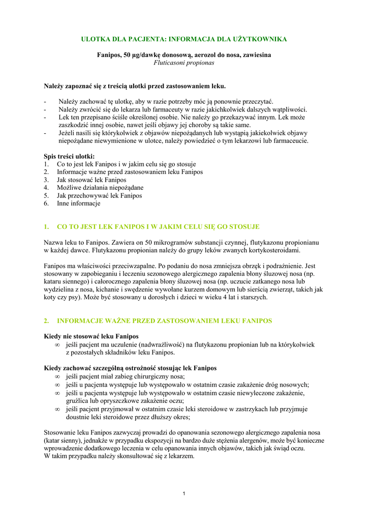 ULOTKA DLA PACJENTA: INFORMACJA DLA UŻYTKOWNIKA Fanipos, 50 µg/dawkę donosową, aerozol do nosa, zawiesina Fluticasoni propionas Należy zapoznać się z treścią ulotki przed zastosowaniem leku. - Należy zachować tę ulotkę, aby w razie potrzeby móc ją ponownie przeczytać. Należy zwrócić się do lekarza lub farmaceuty w razie jakichkolwiek dalszych wątpliwości. Lek ten przepisano ściśle określonej osobie. Nie należy go przekazywać innym. Lek może zaszkodzić innej osobie, nawet jeśli objawy jej choroby są takie same. Jeżeli nasili się którykolwiek z objawów niepożądanych lub wystąpią jakiekolwiek objawy niepożądane niewymienione w ulotce, należy powiedzieć o tym lekarzowi lub farmaceucie. Spis treści ulotki: 1. Co to jest lek Fanipos i w jakim celu się go stosuje 2. Informacje ważne przed zastosowaniem leku Fanipos 3. Jak stosować lek Fanipos 4. Możliwe działania niepożądane 5. Jak przechowywać lek Fanipos 6. Inne informacje 1. CO TO JEST LEK FANIPOS I W JAKIM CELU SIĘ GO STOSUJE Nazwa leku to Fanipos. Zawiera on 50 mikrogramów substancji czynnej, flutykazonu propionianu w każdej dawce. Flutykazonu propionian należy do grupy leków zwanych kortykosteroidami. Fanipos ma właściwości przeciwzapalne. Po podaniu do nosa zmniejsza obrzęk i podrażnienie. Jest stosowany w zapobieganiu i leczeniu sezonowego alergicznego zapalenia błony śluzowej nosa (np. kataru siennego) i całorocznego zapalenia błony śluzowej nosa (np. uczucie zatkanego nosa lub wydzielina z nosa, kichanie i swędzenie wywołane kurzem domowym lub sierścią zwierząt, takich jak koty czy psy). Może być stosowany u dorosłych i dzieci w wieku 4 lat i starszych. 2. INFORMACJE WAŻNE PRZED ZASTOSOWANIEM LEKU FANIPOS Kiedy nie stosować leku Fanipos • jeśli pacjent ma uczulenie (nadwrażliwość) na flutykazonu propionian lub na którykolwiek z pozostałych składników leku Fanipos. Kiedy zachować szczególną ostrożność stosując lek Fanipos • jeśli pacjent miał zabieg chirurgiczny nosa; • jeśli u pacjenta występuje lub występowało w ostatnim czasie zakażenie dróg nosowych; • jeśli u pacjenta występuje lub występowało w ostatnim czasie niewyleczone zakażenie, gruźlica lub opryszczkowe zakażenie oczu; • jeśli pacjent przyjmował w ostatnim czasie leki steroidowe w zastrzykach lub przyjmuje doustnie leki steroidowe przez dłuższy okres; Stosowanie leku Fanipos zazwyczaj prowadzi do opanowania sezonowego alergicznego zapalenia nosa (katar sienny), jednakże w przypadku ekspozycji na bardzo duże stężenia alergenów, może być konieczne wprowadzenie dodatkowego leczenia w celu opanowania innych objawów, takich jak świąd oczu. W takim przypadku należy skonsultować się z lekarzem. 1 Stosowanie innych leków Niektóre leki mogą wpływać na działanie leku Fanipos, w szczególności należy powiedzieć lekarzowi lub farmaceucie o przyjmowaniu: • jakichkolwiek leków stosowanych w leczeniu zakażeń grzybiczych (np. ketokonazolu); • jakichkolwiek leków przeciwwirusowych, takich jak stosowane w leczeniu zakażeń wirusem HIV (np. rytonawir). Należy powiedzieć lekarzowi lub farmaceucie o wszystkich przyjmowanych aktualnie lub ostatnio lekach, również tych, które wydawane są bez recepty. Ciąża i karmienie piersią Należy powiedzieć lekarzowi lub farmaceucie, jeśli pacjentka jest w ciąży, planuje ciążę lub karmi piersią. Przed zastosowaniem jakiegokolwiek leku należy poradzić się lekarza. Prowadzenie pojazdów i obsługiwanie maszyn Lek nie ma wpływu lub wywiera nieistotny wpływ na zdolność prowadzenia pojazdów i obsługiwania maszyn. Ważne informacje o niektórych składnikach leku Fanipos Lek Fanipos zawiera chlorek benzalkoniowy (40 µg/dawkę donosową), który jest substancją drażniącą i może powodować reakcje skórne. W przypadku długotrwałego stosowania, środek konserwujący – chlorek benzalkoniowy może spowodować obrzęk błony śluzowej nosa. W przypadku takiej reakcji (przedłużające się uczucie zatkanego nosa) należy, jeśli to możliwe, rozważyć stosowanie do nosa leków niezawierających środków konserwujących. Może również spowodować skurcz oskrzeli. Jeśli takie leki nie są dostępne, należy zastosować leki w innej postaci farmaceutycznej. 3. JAK STOSOWAĆ LEK FANIPOS Lek Fanipos należy zawsze stosować zgodnie z zaleceniami lekarza. W razie wątpliwości należy skontaktować się z lekarzem. Zazwyczaj stosowana dawka leku Fanipos to: Dorośli (w tym pacjenci w podeszłym wieku) i dzieci w wieku 12 lat i starszych: Na początku stosowania leku Fanipos, zazwyczaj przyjmuje się dwie dawki aerozolu do każdego otworu nosowego raz na dobę, najlepiej rano. Lekarz może zalecić zastosowanie maksymalnie dwóch dawek aerozolu do każdego otworu nosowego dwa razy na dobę. Po uzyskaniu kontroli objawów, lekarz może zalecić zmniejszenie dawki do jednej dawki aerozolu do każdego otworu nosowego raz na dobę. Jeśli podczas stosowania tej mniejszej dawki objawy nasilą się, dawkę będzie można ponownie zwiększyć do dawki początkowej. Dzieci w wieku od 4 do 11 lat: U dzieci w wieku od 4 do 11 lat zazwyczaj zaleca się stosowanie jednej dawki aerozolu do każdego otworu nosowego raz na dobę, najlepiej rano. Lekarz może zalecić zastosowanie maksymalnie jednej dawki aerozolu do każdego otworu nosowego dwa razy na dobę. Fanipos nie jest wskazany dla dzieci w wieku poniżej 4 lat. Lekarz zaleci stosowanie najmniejszej dawki leku Fanipos zapewniającej skuteczną kontrolę objawów. Działanie leku może wystąpić po kilku dniach od rozpoczęcia leczenia. Nie należy przerywać stosowania leku, chyba że tak zalecił lekarz. 2 Leku Fanipos nie należy stosować w dawkach większych ani częściej niż zalecił lekarz. Ważne jest, by nie stosować więcej dawek leku niż zalecił lekarz. Jeśli, mimo stosowania leku Fanipos, nadal utrzymuje się swędzenie i łzawi