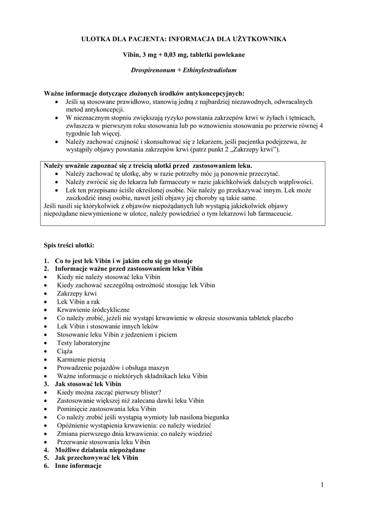 ULOTKA DLA PACJENTA: INFORMACJA DLA UŻYTKOWNIKA Vibin, 3 mg + 0,03 mg, tabletki powlekane Drospirenonum + Ethinylestradiolum Ważne informacje dotyczące złożonych środków antykoncepcyjnych: Jeśli są stosowane prawidłowo, stanowią jedną z najbardziej niezawodnych, odwracalnych metod antykoncepcji. W nieznacznym stopniu zwiększają ryzyko powstania zakrzepów krwi w żyłach i tętnicach, zwłaszcza w pierwszym roku stosowania lub po wznowieniu stosowania po przerwie równej 4 tygodnie lub więcej. Należy zachować czujność i skonsultować się z lekarzem, jeśli pacjentka podejrzewa, że wystąpiły objawy powstania zakrzepów krwi (patrz punkt 2 „Zakrzepy krwi”). Należy uważnie zapoznać się z treścią ulotki przed zastosowaniem leku. Należy zachować tę ulotkę, aby w razie potrzeby móc ją ponownie przeczytać. Należy zwrócić się do lekarza lub farmaceuty w razie jakichkolwiek dalszych wątpliwości. Lek ten przepisano ściśle określonej osobie. Nie należy go przekazywać innym. Lek może zaszkodzić innej osobie, nawet jeśli objawy jej choroby są takie same. Jeśli nasili się którykolwiek z objawów niepożądanych lub wystąpią jakiekolwiek objawy niepożądane niewymienione w ulotce, należy powiedzieć o tym lekarzowi lub farmaceucie. Spis treści ulotki: 1. 2. 3. 4. 5. 6. Co to jest lek Vibin i w jakim celu się go stosuje Informacje ważne przed zastosowaniem leku Vibin Kiedy nie należy stosować leku Vibin Kiedy zachować szczególną ostrożność stosując lek Vibin Zakrzepy krwi Lek Vibin a rak Krwawienie śródcykliczne Co należy zrobić, jeżeli nie wystąpi krwawienie w okresie stosowania tabletek placebo Lek Vibin i stosowanie innych leków Stosowanie leku Vibin z jedzeniem i piciem Testy laboratoryjne Ciąża Karmienie piersią Prowadzenie pojazdów i obsługa maszyn Ważne informacje o niektórych składnikach leku Vibin Jak stosować lek Vibin Kiedy można zacząć pierwszy blister? Zastosowanie większej niż zalecana dawki leku Vibin Pominięcie zastosowania leku Vibin Co należy zrobić jeśli wystąpią wymioty lub nasilona biegunka Opóźnienie wystąpienia krwawienia: co należy wiedzieć Zmiana pierwszego dnia krwawienia: co należy wiedzieć Przerwanie stosowania leku Vibin Możliwe działania niepożądane Jak przechowywać lek Vibin Inne informacje 1 1. CO TO JEST LEK VIBIN I W JAKIM CELU SIĘ GO STOSUJE Lek Vibin jest tabletką antykoncepcyjną i jest stosowany w celu zapobiegania ciąży. Każda z 21 żółtych tabletek zawiera niewielką ilość dwóch różnych hormonów żeńskich, a mianowicie drospirenonu i etynyloestradiolu. 7 białych tabletek nie zawierających substancji czynnych są także nazywane tabletkami placebo. Tabletki antykoncepcyjne zawierające dwa hormony, zwane są tabletkami „złożonymi”. 2. INFORMACJE WAŻNE PRZED ZASTOSOWANIEM LEKU VIBIN Uwagi ogólne Przed rozpoczęciem przyjmowania leku Vibin należy zapoznać się z informacjami dotyczącymi zakrzepów krwi (zakrzepica) w punkcie 2. Jest szczególnie ważne, aby zapoznać się z objawami wystąpienia zakrzepów krwi (patrz punkt 2 „Zakrzepy krwi”). Zanim będzie można rozpocząć stosownie leku Vibin, lekarz zada kilka pytań na temat zdrowia oraz na temat zdrowia bliskich krewnych. Lekarz zmierzy także ciśnienie krwi i, zależnie od indywidualnego przypadku, może także wykonać pewne inne badania. W niniejszej ulotce opisano kilka sytuacji, w których należy przerwać stosowanie leku Vibin, lub w których skuteczność leku Vibin może być zmniejszona. W takich sytuacjach należy albo nie utrzymywać stosunków płciowych, albo stosować dodatkowe niehormonalne środki antykoncepcyjne, np. prezerwatywy lub inne metody mechaniczne. Nie należy stosować metody kalendarzowej lub metody pomiaru temperatury. Metody te mogą być zawodne, ponieważ lek Vibin modyfikuje miesięczne zmiany temperatury ciała i śluzu szyjkowego. Lek Vibin, tak jak inne hormonalne preparaty antykoncepcyjne, nie chroni przed zakażeniem wirusem HIV (AIDS) ani innymi chorobami przenoszonymi drogą płciową. Kiedy nie należy stosować leku Vibin Nie stosować leku Vibin: jeśli u pacjentki występuje jakikolwiek z wymienionych poniżej stanów. Jeśli u pacjentki występuje jakikolwiek z wymienionych poniżej stanów, należy poinformować o tym lekarza. Lekarz omówi z pacjentką, jaki inny środek zapobiegania ciąży będzie bardziej odpowiedni. jeśli u pacjentki obecnie występuje (lub kiedykolwiek występował) zakrzep krwi w naczyniach żylnych nóg (zakrzepica żył głębokich), w płucach (zatorowość płucna) lub w innych organach; jeśli pacjentka wie, że ma zaburzenia wpływające na krzepliwość krwi - na przykład niedobór białka C, niedobór białka S, niedobór antytrombiny III, obecność czynnika V Leiden lub przeciwciał antyfosfolipidowych; jeśli pacjentka wymaga zabiegu chirurgicznego lub nie będzie chodziła przez długi czas (patrz punkt „Zakrzepy krwi”); jeśli pacjentka przeszła zawał serca lub udar; jeśli pacjentka choruje (lub chorowała w przeszłości) na dusznicę bolesną (choroba, która powoduje silny ból w klatce piersiowej i może być pierwszym objawem zawału serca) lub przemijający napad niedokrwienny (przemijające objawy udaru); jeśli pacjentka choruje na jakąkolwiek z poniższych chorób, które mogą zwiększać ryzyko powstania zakrzepu w tętnicy: 2 o ciężką cukrzycę z uszkodzeniem naczyń krwionośnych, o bardzo wysokie ciśnienie krwi, o bardzo wysokie stężenie tłuszczów we krwi (cholesterolu lub triglicerydów), o chorobę nazywaną hiperhomocysteinemią. jeśli u pacjentki występuje (lub występował w przeszłości) rodzaj migreny nazywany „migreną z aurą”; jeżeli obecnie występuje (lub występowało kiedykolwiek w przeszłości) zapalenie trzustki; jeżeli obecnie występuje (lub występowała kiedykolwiek w przeszłości) choroba wątroby, a czynność wątroby w