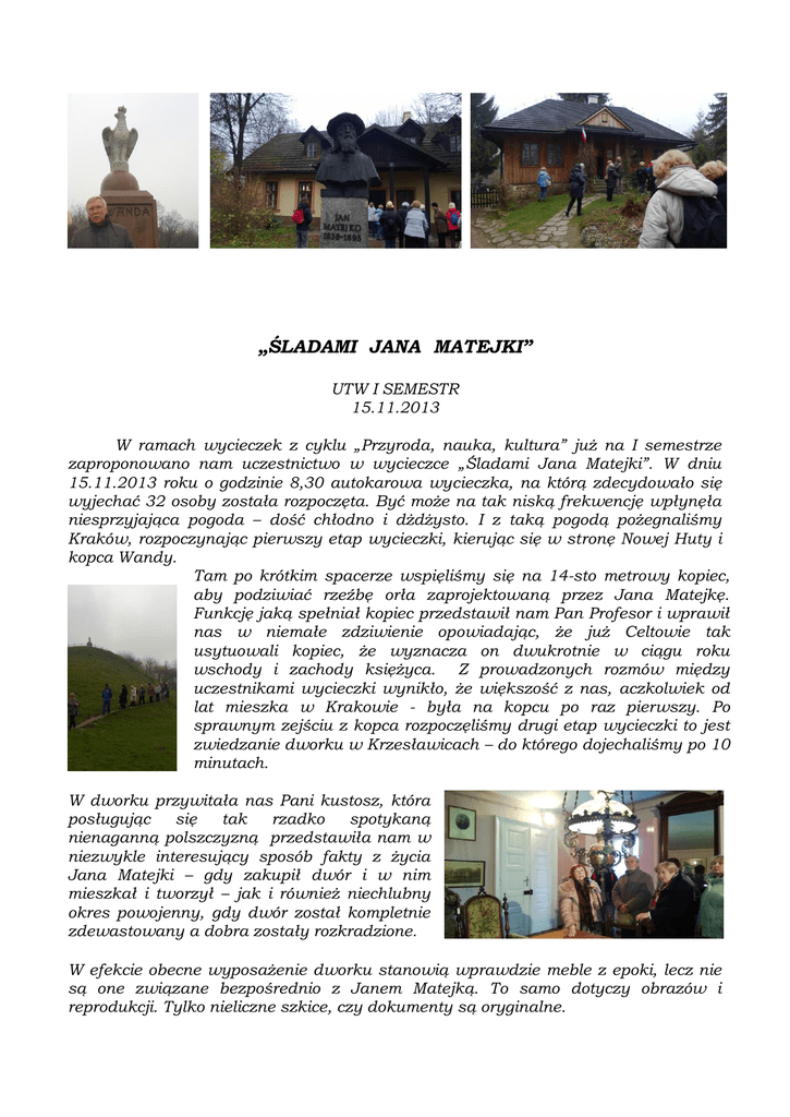 „ŚLADAMI JANA MATEJKI” UTW I SEMESTR 15.11.2013 W ramach wycieczek z cyklu „Przyroda, nauka, kultura” już na I semestrze zaproponowano nam uczestnictwo w wycieczce „Śladami Jana Matejki”. W dniu 15.11.2013 roku o godzinie 8,30 autokarowa wycieczka, na którą zdecydowało się wyjechać 32 osoby została rozpoczęta. Być może na tak niską frekwencję wpłynęła niesprzyjająca pogoda – dość chłodno i dżdżysto. I z taką pogodą pożegnaliśmy Kraków, rozpoczynając pierwszy etap wycieczki, kierując się w stronę Nowej Huty i kopca Wandy. Tam po krótkim spacerze wspięliśmy się na 14-sto metrowy kopiec, aby podziwiać rzeźbę orła zaprojektowaną przez Jana Matejkę. Funkcję jaką spełniał kopiec przedstawił nam Pan Profesor i wprawił nas w niemałe zdziwienie opowiadając, że już Celtowie tak usytuowali kopiec, że wyznacza on dwukrotnie w ciągu roku wschody i zachody księżyca. Z prowadzonych rozmów między uczestnikami wycieczki wynikło, że większość z nas, aczkolwiek od lat mieszka w Krakowie - była na kopcu po raz pierwszy. Po sprawnym zejściu z kopca rozpoczęliśmy drugi etap wycieczki to jest zwiedzanie dworku w Krzesławicach – do którego dojechaliśmy po 10 minutach. W dworku przywitała nas Pani kustosz, która posługując się tak rzadko spotykaną nienaganną polszczyzną przedstawiła nam w niezwykle interesujący sposób fakty z życia Jana Matejki – gdy zakupił dwór i w nim mieszkał i tworzył – jak i również niechlubny okres powojenny, gdy dwór został kompletnie zdewastowany a dobra zostały rozkradzione. W efekcie obecne wyposażenie dworku stanowią wprawdzie meble z epoki, lecz nie są one związane bezpośrednio z Janem Matejką. To samo dotyczy obrazów i reprodukcji. Tylko nieliczne szkice, czy dokumenty są oryginalne. Po zakończonym zwiedzaniu i krótkiej przerwie na stacji benzynowej opuściliśmy Kraków i mijając zamek w Niepołomicach skierowaliśmy się w stronę Nowego Wiśnicza. Tam trzecim etapem wycieczki było muzeum pamiątek po Janie Matejce „Koryznówka”. Muzeum bardzo małe, usytuowane w dwóch izdebkach, ale pękające od oryginalnych pamiątek po Janie Matejce, który tutaj wprawdzie nie malował ale spędzał miesiące letnie wraz z żoną i dziećmi. Meble, sprzęty, fotografie, szkice – wszystko jest takie jak za życia artysty dzięki rodzinie Serafińskich do których dworek należy i którzy z wielką starannością zadbali o te pamiątki i udostępnili odwiedzającym. I o tym wszystkim bardzo interesująco i z mnóstwem szczegółów opowiedziały dwie Panie oprowadzające. Zrobiła się godzina 13,30 i udaliśmy się na obiad do restauracji w hotelu Panorama - wprawdzie 3 gwiazdkowym, ale na bardzo dobrym poziomie zarówno ze względu na wystrój jak i menu. Podany na zakończenie obiadu sernik na gorąco z bitą śmietaną chyba wszystkich wprawił w znakomite humory. Po zakończonym obiedzie rozpoczęliśmy czwarty etap wycieczki – zwiedzanie zamku w Wiśniczu. Zamek zbudowany w XIV wieku przeszedł różne dzieje – pożary, grabieże – dopiero po wojnie został częściowo odbudowany. Jednak nieuregulowane prawa własnościowe i roszczenia byłych właścicieli wstrzymały te prace. Zamek piękny, ale brak eksponatów związanych bezpośrednio z historią. Wyposażenie raczej skromne stanowią meble i sprzęty z epoki, często pożyczone z innych muzeów. Za to Pani przewodnik, chociaż młoda z bardzo dużą wiedzą przekazaną nam w ciekawy i zwięzły sposób. Na zakończenie zwiedzania zobaczyliśmy z tarasu widokowego na II piętrze zamku panoramę Wiśnicza. Pożegnał nas przepiękny zachód słońca. Do Krakowa dotarliśmy po godzinie 17,00. Wycieczka się udała, wiedza nasza została pogłębiona, uczestnicy byli zdyscyplinowani, na nikogo nie czekaliśmy. Grupa uczestników się zintegrowała, coraz więcej osób poznajemy i kojarzymy, szkoda tylko, że na następny wyjazd musimy czekać aż do wiosny następnego roku. Opracowała Jolanta Moroz