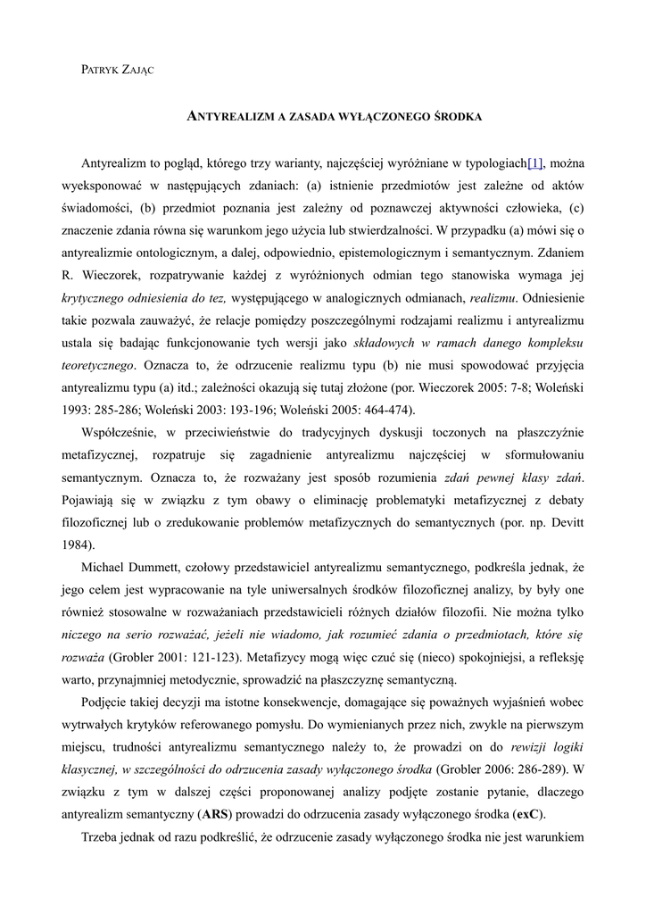 PATRYK ZAJĄC ANTYREALIZM A ZASADA WYŁĄCZONEGO ŚRODKA Antyrealizm to pogląd, którego trzy warianty, najczęściej wyróżniane w typologiach[1], można wyeksponować w następujących zdaniach: (a) istnienie przedmiotów jest zależne od aktów świadomości, (b) przedmiot poznania jest zależny od poznawczej aktywności człowieka, (c) znaczenie zdania równa się warunkom jego użycia lub stwierdzalności. W przypadku (a) mówi się o antyrealizmie ontologicznym, a dalej, odpowiednio, epistemologicznym i semantycznym. Zdaniem R. Wieczorek, rozpatrywanie każdej z wyróżnionych odmian tego stanowiska wymaga jej krytycznego odniesienia do tez, występującego w analogicznych odmianach, realizmu. Odniesienie takie pozwala zauważyć, że relacje pomiędzy poszczególnymi rodzajami realizmu i antyrealizmu ustala się badając funkcjonowanie tych wersji jako składowych w ramach danego kompleksu teoretycznego. Oznacza to, że odrzucenie realizmu typu (b) nie musi spowodować przyjęcia antyrealizmu typu (a) itd.; zależności okazują się tutaj złożone (por. Wieczorek 2005: 7-8; Woleński 1993: 285-286; Woleński 2003: 193-196; Woleński 2005: 464-474). Współcześnie, w przeciwieństwie do tradycyjnych dyskusji toczonych na płaszczyźnie metafizycznej, rozpatruje się zagadnienie antyrealizmu najczęściej w sformułowaniu semantycznym. Oznacza to, że rozważany jest sposób rozumienia zdań pewnej klasy zdań. Pojawiają się w związku z tym obawy o eliminację problematyki metafizycznej z debaty filozoficznej lub o zredukowanie problemów metafizycznych do semantycznych (por. np. Devitt 1984). Michael Dummett, czołowy przedstawiciel antyrealizmu semantycznego, podkreśla jednak, że jego celem jest wypracowanie na tyle uniwersalnych środków filozoficznej analizy, by były one również stosowalne w rozważaniach przedstawicieli różnych działów filozofii. Nie można tylko niczego na serio rozważać, jeżeli nie wiadomo, jak rozumieć zdania o przedmiotach, które się rozważa (Grobler 2001: 121-123). Metafizycy mogą więc czuć się (nieco) spokojniejsi, a refleksję warto, przynajmniej metodycznie, sprowadzić na płaszczyznę semantyczną. Podjęcie takiej decyzji ma istotne konsekwencje, domagające się poważnych wyjaśnień wobec wytrwałych krytyków referowanego pomysłu. Do wymienianych przez nich, zwykle na pierwszym miejscu, trudności antyrealizmu semantycznego należy to, że prowadzi on do rewizji logiki klasycznej, w szczególności do odrzucenia zasady wyłączonego środka (Grobler 2006: 286-289). W związku z tym w dalszej części proponowanej analizy podjęte zostanie pytanie, dlaczego antyrealizm semantyczny (ARS) prowadzi do odrzucenia zasady wyłączonego środka (exC). Trzeba jednak od razu podkreślić, że odrzucenie zasady wyłączonego środka nie jest warunkiem koniecznym antyrealizmu. Na nurt ten składa się szerokie spektrum stanowisk, wśród których są akceptujące tę zasadę i odrzucające ją (Szubka 2001: 78). Uznawać jednak można, i tak czyni Dummett, że najbardziej interesujące formy antyrealizmu, stanowiące zarazem prawdopodobnie znaczną większość, znamionuje odrzucenie zasady biwalencji (Dummett 1993: 75 i 241). Skupimy się tutaj na analizie odmiany jednego tych najbardziej interesujących stanowiskach. Odtąd skrót ARS należy rozumieć jako odnoszący się do wspomnianej odmiany i odmian, którym można przypisać przynajmniej istotnie zbliżoną charakterystykę. Na początek zaproponowana zostanie rekonstrukcja teorii znaczenia przyjmowanej w ARS. W tej teorii, jak wspomniano, wyraża się specyfika semantycznego ujęcia antyrealizmu (Dummett 1992: 6; Szubka 2001: 250-251). Ponieważ rozważane zagadnienia mają charakter semantyczny, po zrekonstruowaniu teorii znaczenia w ARS wyeksponowany zostanie semantyczny odpowiednik exC, to jest zasada dwuwartościowości. Najważniejszym punktem analizy będzie przedstawienie odniesienia konsekwencji teorii znaczenia w ARS do zasady dwuwartościowości. Problem sprowadza się bowiem do pytania, czy ARS prowadzi do odrzucenia zasady dwuwartościowości. Jeśli tak, to znaczy, że ARS prowadzi do odrzucenia prawa exC, bo zasada biwalencji jest semantycznym odpowiednikiem tego prawa. W kolejnym kroku pozostanie zaproponować krytyczne odczytanie niektórych konsekwencji ARS związanych ze statusem exC na jego gruncie. Pozwoli to sformułować dwie wersje odpowiedzi na przewodnie pytanie tego eseju. Potrzeba jeszcze tylko zastrzeżenia, że ARS bywa też eksplikowany jako dotyczący przede wszystkim pojęcia prawdy (Woleński 2005: 470). Obydwa podejścia wiodą do postawienia problemu exC i przez to są zbieżne. Przyjęta tutaj zostanie, jako prostsza, pierwsza strategia, uznająca za centralny problem znaczenia pewnej klasy zdań. W ten sposób zostanie pośrednio uchwycona relacja ARS do exC, zwłaszcza że, jak to explicite formułuje T. Szubka, przyjęcie lub odrzucenie zasady dwuwartościowości wiąże się ściśle z wyborem teorii znaczenia (Szubka 2001: 151). Oto jak przedstawia się w ARS problem tego, na czym polega wiedza składająca się na rozumienie języka przez jego użytkowników, czyli teoria znaczenia. Niech będzie dane zdanie ‘Z’. W perspektywie ARS znaczenie ‘Z’ identyfikuje się z warunkami jego stwierdzalności. Jeżeli ‘Z’ spełnia warunki stwierdzalności, to można mu przypisać prawdę albo fałsz, a zatem jest rozstrzygalne. Dummett podkreśla, że przypuszczalnie nie moglibyśmy w ogóle rozumieć, co znaczy, że zdanie jest prawdziwe niezależnie od tego, co nauczyliśmy się traktować jako uzasadnienie jego prawdziwości; po prostu nie dałoby się wykazać, że je rozumiemy (Dummett 1963). Prowadziłoby to do przykrej konfrontacji z samymi nierozstrzygalnymi zdaniami. Wówczas żylibyśmy w świecie horroru, w którym żadne zdanie nie jest albo prawdziwe, albo fałszywe, lecz każde zdanie nie jest ani prawdziwe, ani fa