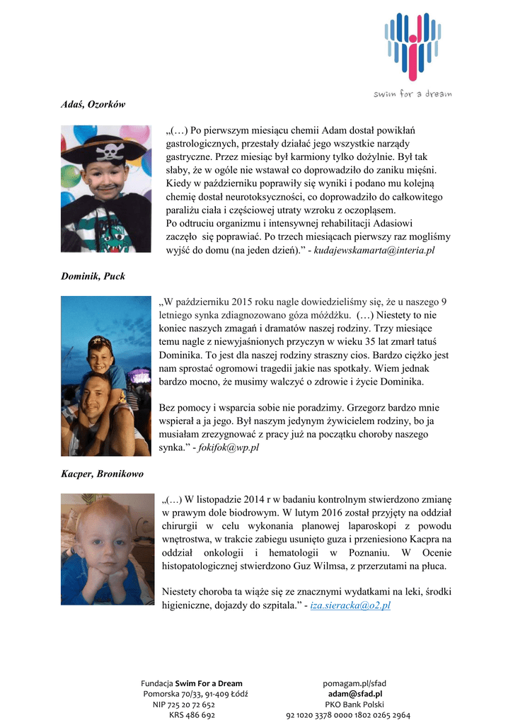 Adaś, Ozorków „(…) Po pierwszym miesiącu chemii Adam dostał powikłań gastrologicznych, przestały działać jego wszystkie narządy gastryczne. Przez miesiąc był karmiony tylko dożylnie. Był tak słaby, że w ogóle nie wstawał co doprowadziło do zaniku mięśni. Kiedy w październiku poprawiły się wyniki i podano mu kolejną chemię dostał neurotoksyczności, co doprowadziło do całkowitego paraliżu ciała i częściowej utraty wzroku z oczopląsem. Po odtruciu organizmu i intensywnej rehabilitacji Adasiowi zaczęło się poprawiać. Po trzech miesiącach pierwszy raz mogliśmy wyjść do domu (na jeden dzień).” - [email protected] Dominik, Puck „W październiku 2015 roku nagle dowiedzieliśmy się, że u naszego 9 letniego synka zdiagnozowano góza móżdżku. (…) Niestety to nie koniec naszych zmagań i dramatów naszej rodziny. Trzy miesiące temu nagle z niewyjaśnionych przyczyn w wieku 35 lat zmarł tatuś Dominika. To jest dla naszej rodziny straszny cios. Bardzo ciężko jest nam sprostać ogromowi tragedii jakie nas spotkały. Wiem jednak bardzo mocno, że musimy walczyć o zdrowie i życie Dominika. Bez pomocy i wsparcia sobie nie poradzimy. Grzegorz bardzo mnie wspierał a ja jego. Był naszym jedynym żywicielem rodziny, bo ja musiałam zrezygnować z pracy już na początku choroby naszego synka.” - [email protected] Kacper, Bronikowo „(…) W listopadzie 2014 r w badaniu kontrolnym stwierdzono zmianę w prawym dole biodrowym. W lutym 2016 został przyjęty na oddział chirurgii w celu wykonania planowej laparoskopi z powodu wnętrostwa, w trakcie zabiegu usunięto guza i przeniesiono Kacpra na oddział onkologii i hematologii w Poznaniu. W Ocenie histopatologicznej stwierdzono Guz Wilmsa, z przerzutami na płuca. Niestety choroba ta wiąże się ze znacznymi wydatkami na leki, środki higieniczne, dojazdy do szpitala.” - [email protected] Fundacja Swim For a Dream Pomorska 70/33, 91-409 Łódź NIP 725 20 72 652 KRS 486 692 pomagam.pl/sfad [email protected] PKO Bank Polski 92 1020 3378 0000 1802 0265 2964 Dorotka, Bochnia "(...) Dorotka nie zakwalifikowała się na terapię w Polsce ani we Włoszech. W 2015 roku Dorotka była na terapii we Włoskiej klinice, ale pojawił się nawrót choroby i dlatego córka została automatycznie wycofana z leczenia we Włoszech. Włoska klinika również nie posiada rozbudowanego schematu leczenia, którym mogłaby pomóc naszej Córce. Jedynym ratunkiem jest terapia połączona z chemioterapią w Niemczech. (...) Niestety nas jako rodziców nie stać żeby pokryć koszta leczenia,które wynoszą 200 tys Euro a nasz NFZ nie pokryje ani złotówki leczenia." - [email protected] POWYŻEJ ZNAJDUJĄ SIĘ FRAGMENTY E-MAILI OTRZYMANYCH PRZEZ FUNDACJĘ SWIM FOR A DREAM. POKAŻ SERCE! NIE MUSISZ PRZELEWAĆ PIENIĘDZY!!! RODZINY POTRZEBUJĄ RÓWNIEŻ WSPARCIA RZECZOWEGO szukamy: Ubranek dla 4,5 l Kacpra (głównie piżamka i dresy) oraz 5 l Dorotki Pampersy dla Dorotki Środki czystości (proszki do prania, mydło, szampony itp.) Wsparcia remontu komina i dachu w mieszkaniu Pani Marty (Ozorków) Pieca do centralnego ogrzewania oraz grzejnika do mieszkania Pani Marty (Ozorkó) Komputera stacjonarnego (może być używany) Kursu na prawo jazdy Fundacja Swim For a Dream Pomorska 70/33, 91-409 Łódź NIP 725 20 72 652 KRS 486 692 pomagam.pl/sfad [email protected] PKO Bank Polski 92 1020 3378 0000 1802 0265 2964