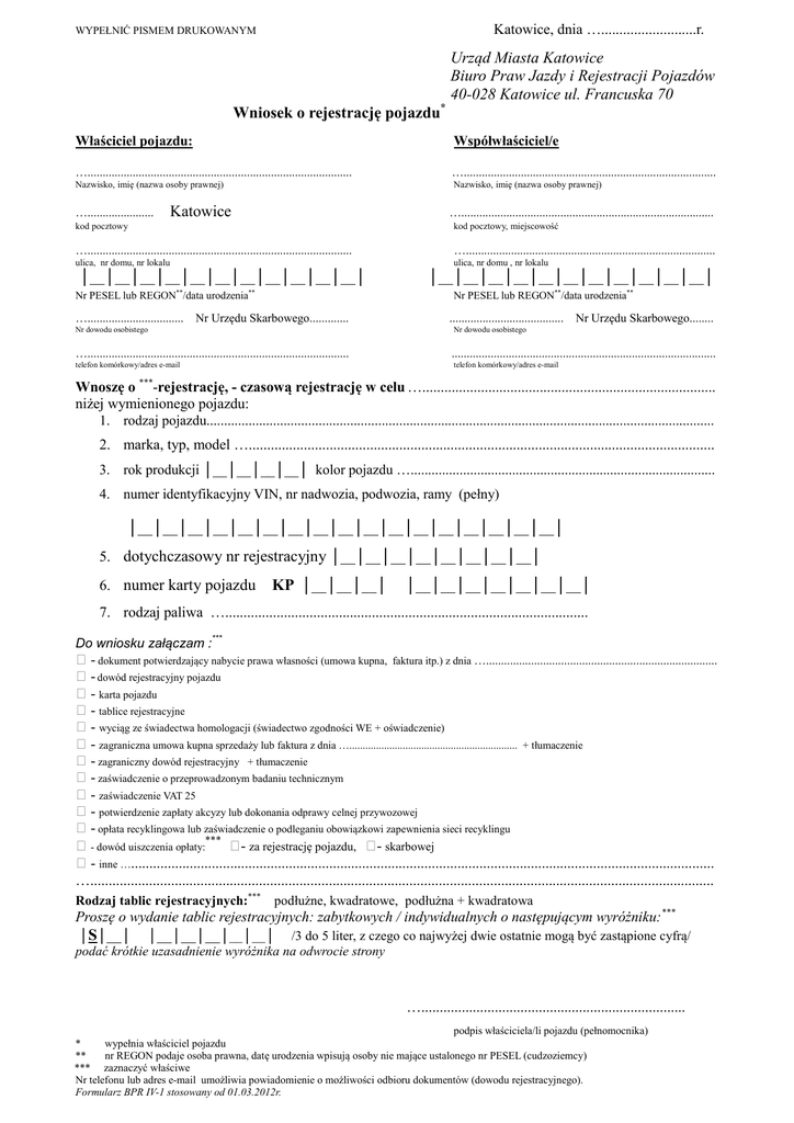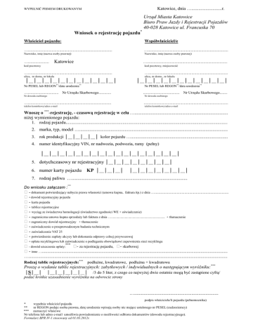 Katowice, dnia …..........................r. WYPEŁNIĆ PISMEM DRUKOWANYM Urząd Miasta Katowice Biuro Praw Jazdy i Rejestracji Pojazdów 40-028 Katowice ul. Francuska 70 Wniosek o rejestrację pojazdu* Właściciel pojazdu: Współwłaściciel/e …........................................................................................ ….................................................................................... Nazwisko, imię (nazwa osoby prawnej) Nazwisko, imię (nazwa osoby prawnej) …...................... Katowice ….................................................................................... kod pocztowy kod pocztowy, miejscowość …........................................................................................ …................................................................................... ulica, nr domu, nr lokalu ulica, nr domu , nr lokalu │__│__│__│__│__│__│__│__│__│__│__│ ** Nr PESEL lub REGON /data urodzenia …................................ ** │__│__│__│__│__│__│__│__│__│__│__│ Nr PESEL lub REGON**/data urodzenia** Nr Urzędu Skarbowego............. ...................................... Nr Urzędu Skarbowego........ Nr dowodu osobistego Nr dowodu osobistego …....................................................................................... ........................................................................................ telefon komórkowy/adres e-mail telefon komórkowy/adres e-mail Wnoszę o ***-rejestrację, - czasową rejestrację w celu …................................................................................ niżej wymienionego pojazdu: 1. rodzaj pojazdu................................................................................................................................................. 2. marka, typ, model …............................................................................................................................... 3. rok produkcji │__│__│__│__│ kolor pojazdu …....................................................................................... 4. numer identyfikacyjny VIN, nr nadwozia, podwozia, ramy (pełny) │__│__│__│__│__│__│__│__│__│__│__│__│__│__│__│__│__│ 5. dotychczasowy nr rejestracyjny │__│__│__│__│__│__│__│__│ 6. numer karty pojazdu KP │__│__│__│ │__│__│__│__│__│__│__│ 7. rodzaj paliwa …................................................................................................... *** Do wniosku załączam : - dokument potwierdzający nabycie prawa własności (umowa kupna, faktura itp.) z dnia …............................................................................. - dowód rejestracyjny pojazdu - karta pojazdu - tablice rejestracyjne - wyciąg ze świadectwa homologacji (świadectwo zgodności WE + oświadczenie) - zagraniczna umowa kupna sprzedaży lub faktura z dnia …............................................................... + tłumaczenie - zagraniczny dowód rejestracyjny + tłumaczenie - zaświadczenie o przeprowadzonym badaniu technicznym - zaświadczenie VAT 25 - potwierdzenie zapłaty akcyzy lub dokonania odprawy celnej przywozowej - opłata recyklingowa lub zaświadczenie o podleganiu obowiązkowi zapewnienia sieci recyklingu - dowód uiszczenia opłaty:*** - za rejestrację pojazdu, - skarbowej - inne …............................................................................................................................................................... ….......................................................................................................................................................................... Rodzaj tablic rejestracyjnych:*** podłużne, kwadratowe, podłużna + kwadratowa Proszę o wydanie tablic rejestracyjnych: zabytkowych / indywidualnych o następującym wyróżniku:*** │S│__│ │__│__│__│__│__│ /3 do 5 liter, z czego co najwyżej dwie ostatnie mogą być zastąpione cyfrą/ podać krótkie uzasadnienie wyróżnika na odwrocie strony …........................................................................ podpis właściciela/li pojazdu (pełnomocnika) * wypełnia właściciel pojazdu ** nr REGON podaje osoba prawna, datę urodzenia wpisują osoby nie mające ustalonego nr PESEL (cudzoziemcy) *** zaznaczyć właściwe Nr telefonu lub adres e-mail umożliwia powiadomienie o możliwości odbioru dokumentów (dowodu rejestracyjnego). Formularz BPR IV-1 stosowany od 01.03.2012r.